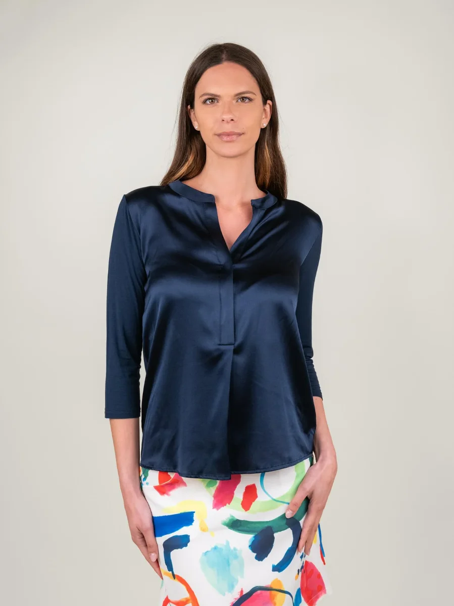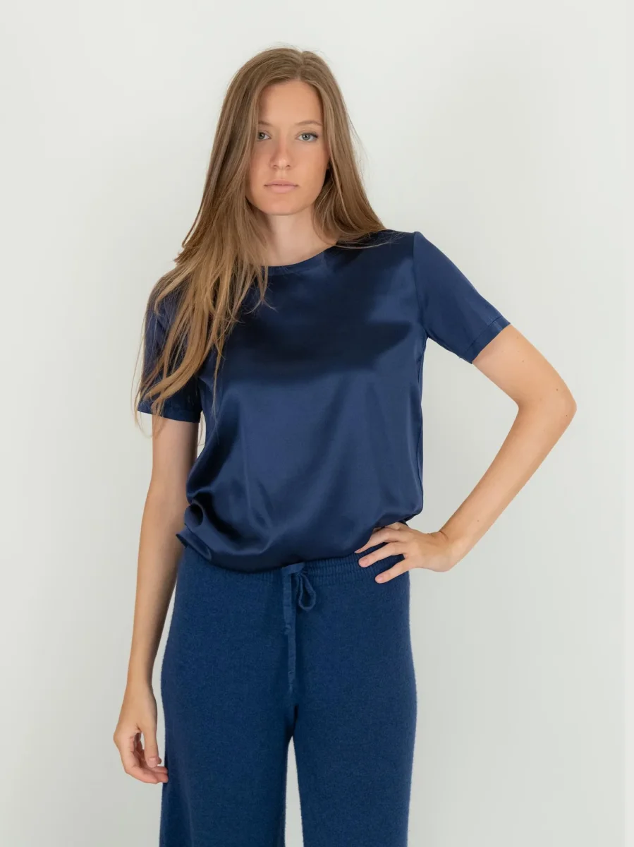 BLUSA CON SCOLLO A V E MANICA CORTA IN RASO BLU