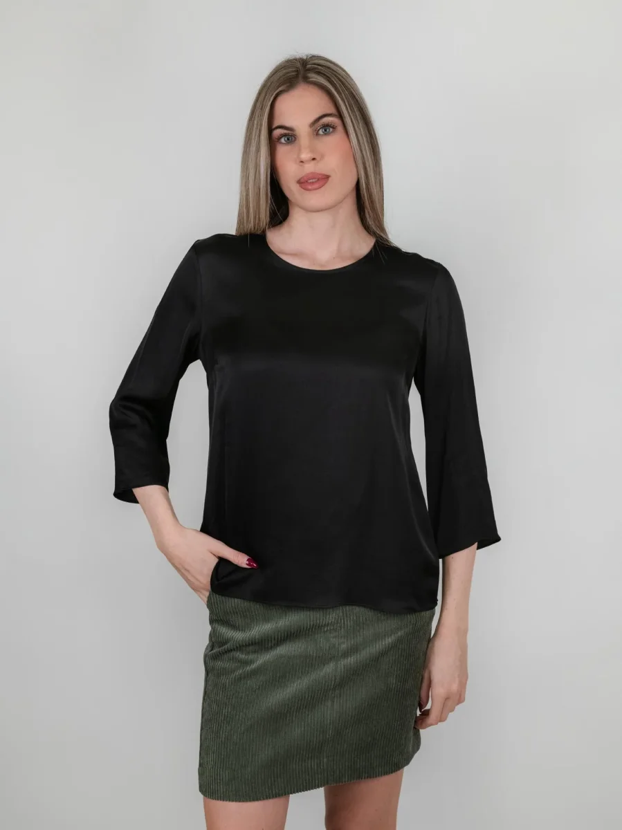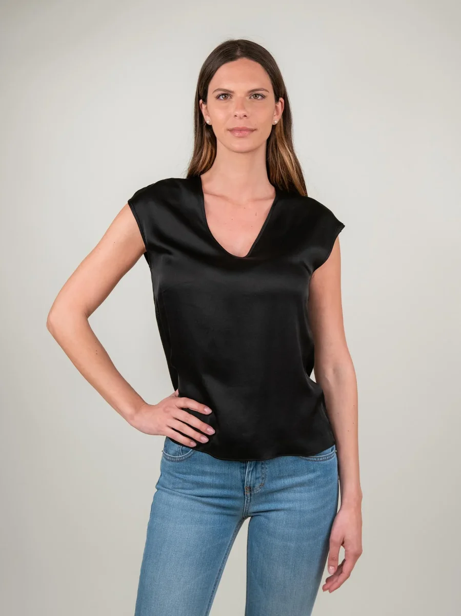 BLUSA CON SCOLLO A V E MANICA CORTA IN RASO NERA
