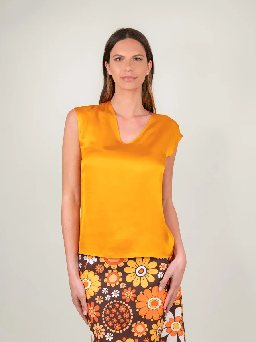 BLUSA CON SCOLLO A V E MANICA CORTA IN RASO ARANCIO