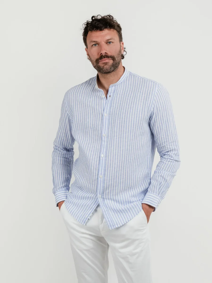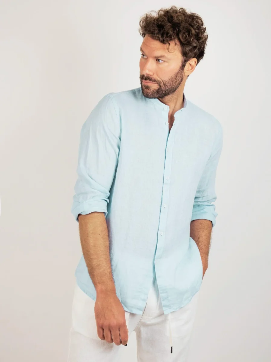 CAMICIA ALLA COREANA IN LINO AZZURRO