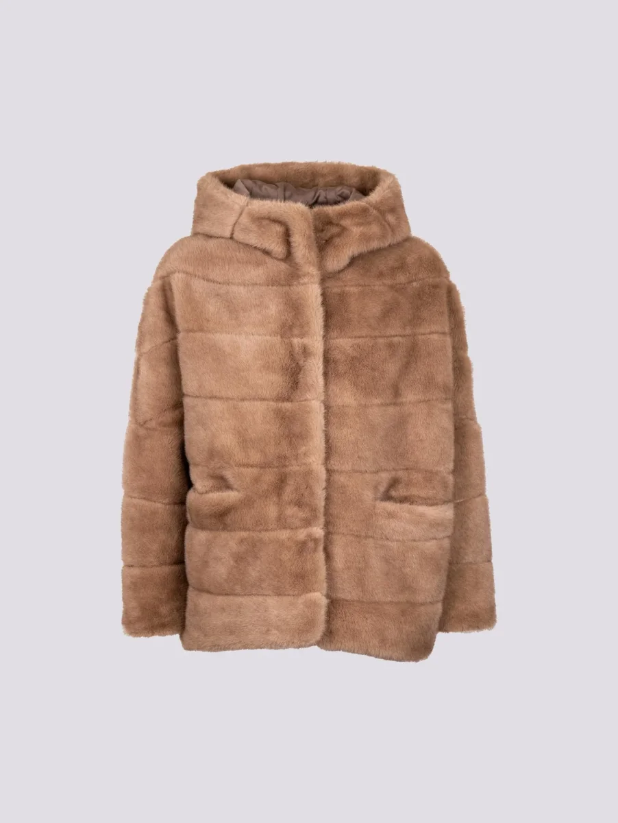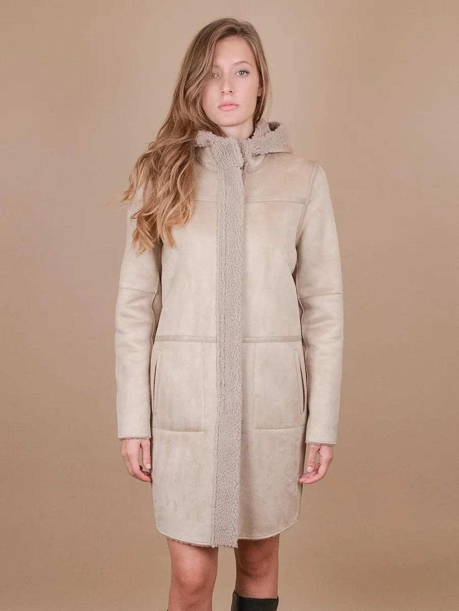 GIACCA CON CAPPUCCIO REVERSIBILE IN ECO-MONTONE BEIGE
