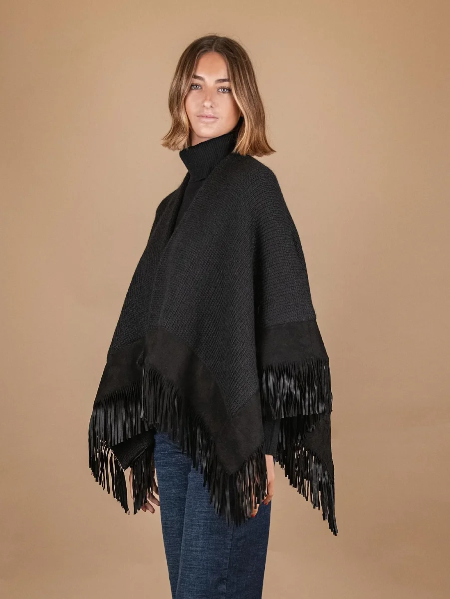 SCIALLE IN LANA CON PROFILI E FRANGE IN CAMOSCIO NERO