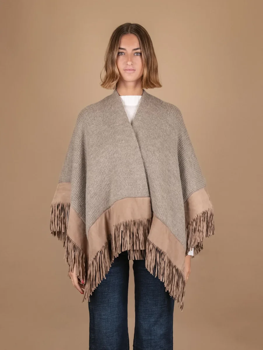 SCIALLE IN LANA CAMMELLO CON PROFILI E FRANGE IN CAMOSCIO BEIGE