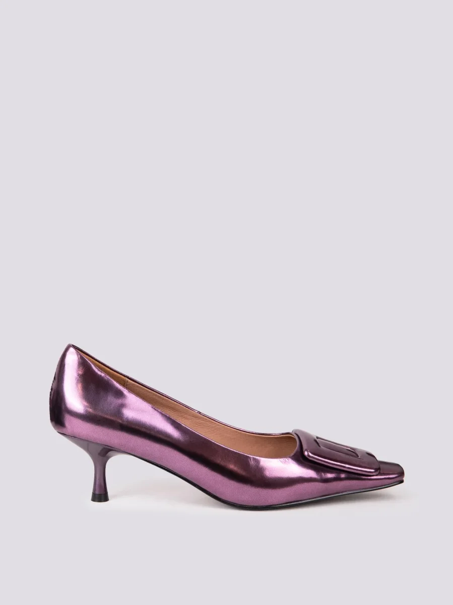 DECOLLETE CON APPLICAZIONE FRONTALE IN PELLE VIOLA LAMINATA