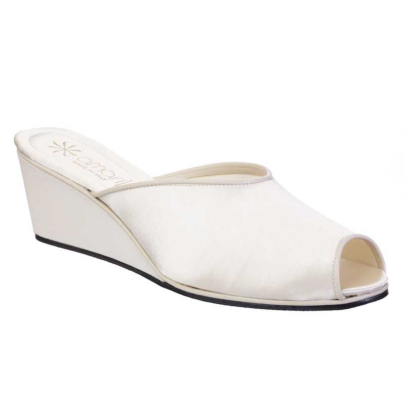 Ciabattine da Sposa, aperte, in raso bianco o avorio fatte in Italia.