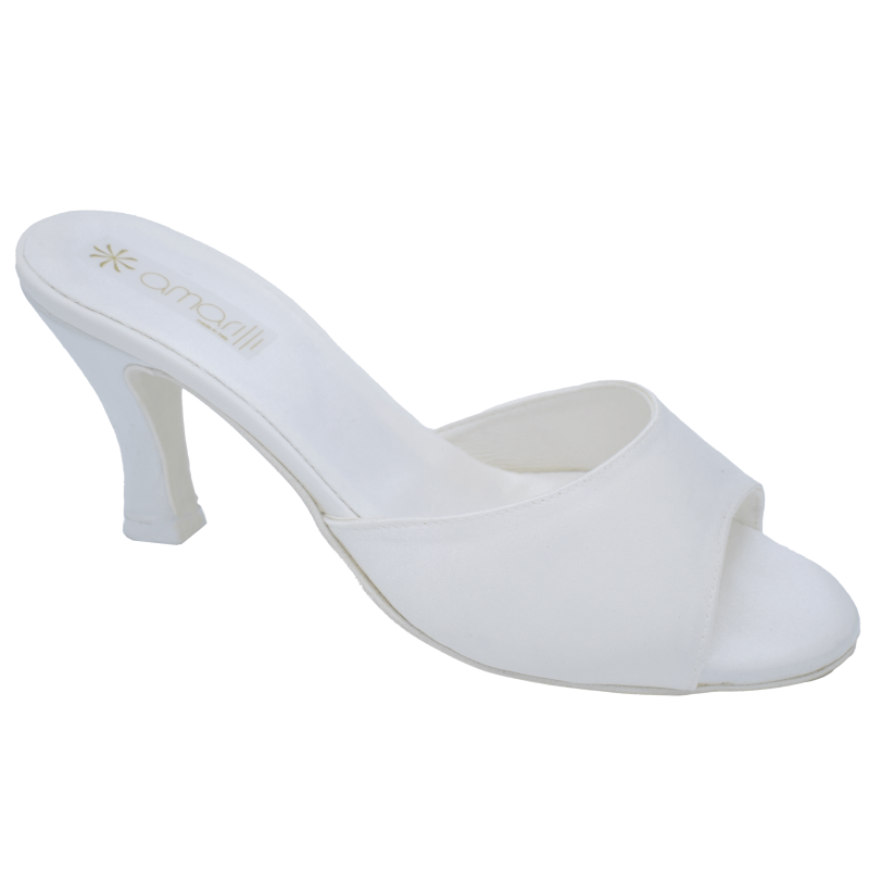Ciabattine da Sposa con tacco alto 5 cm, aperte, in Raso Avorio o Bianco, fatte in Italia.