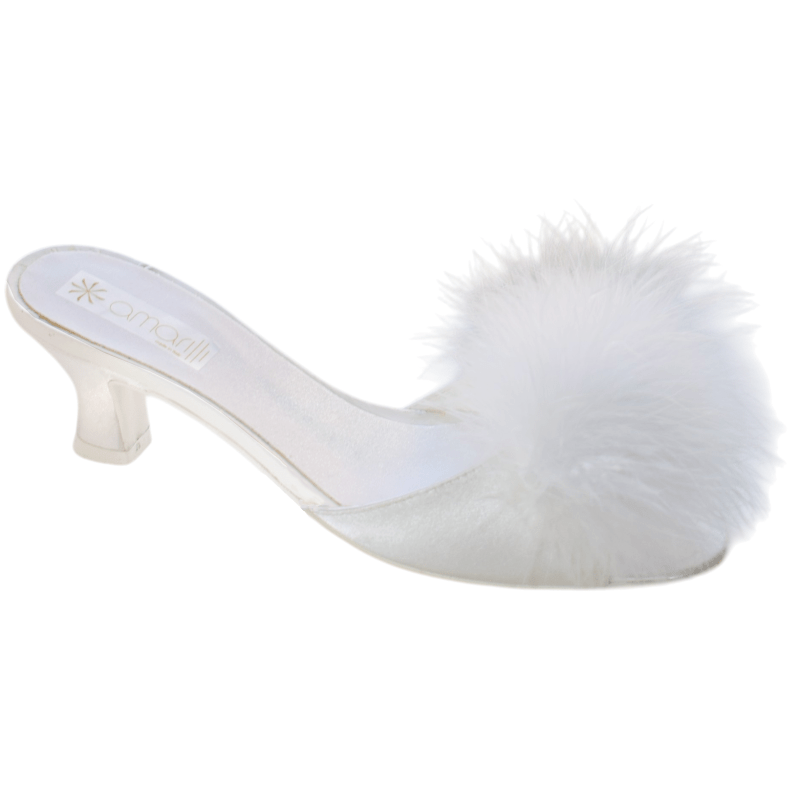 Ciabatte da sposa con piumino Marabou, aperte, in Raso Bianco fatte in Italia.