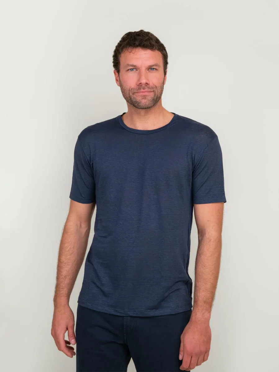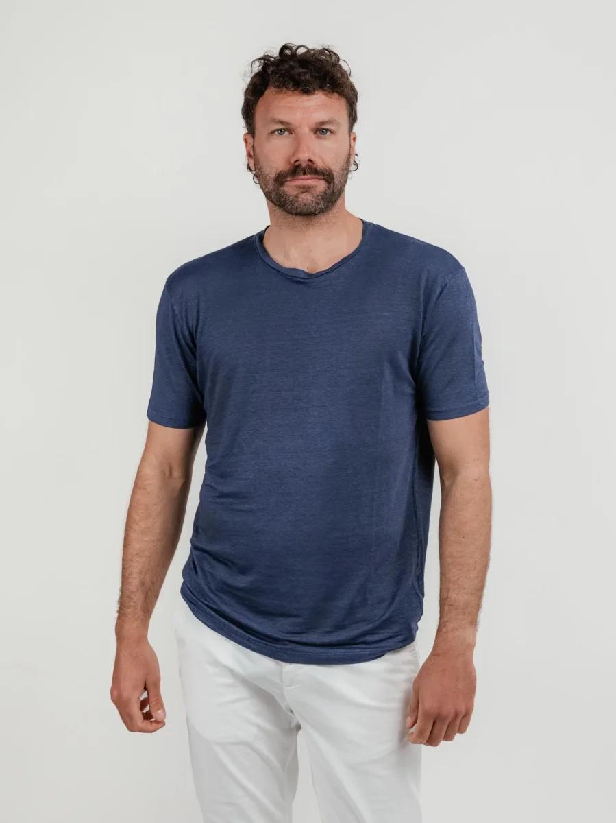T-SHIRT IN LINO A GIROCOLLO BLU