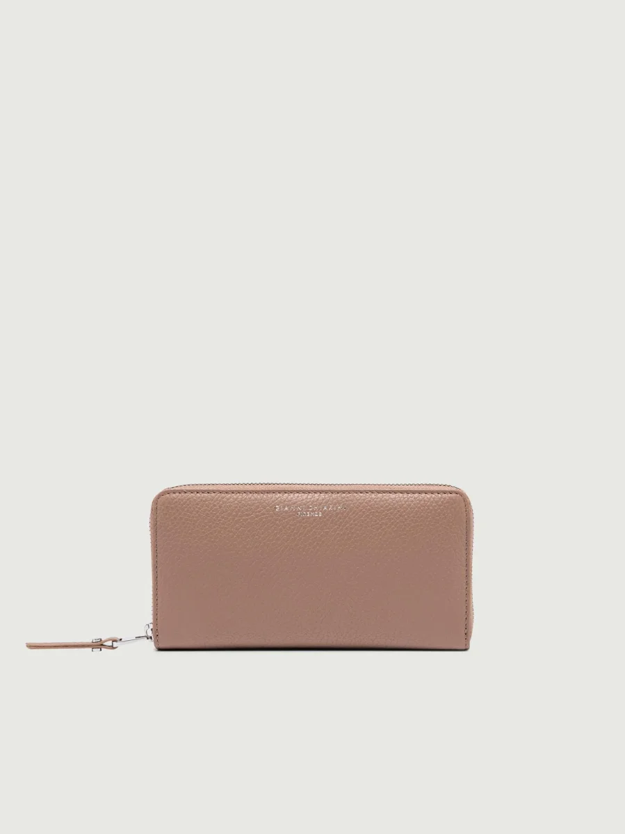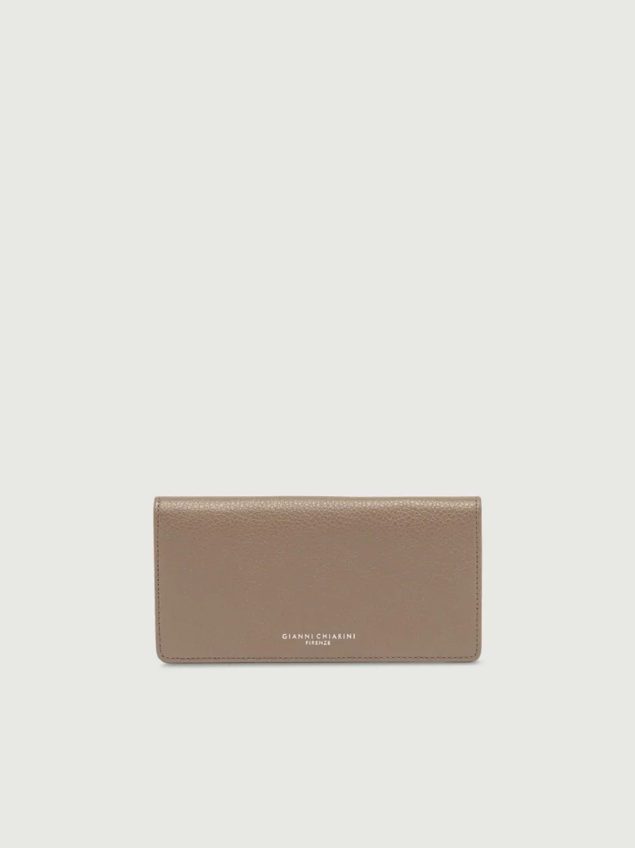 Versione verticale del portafoglio ALV, realizzata in pelle liscia con inserto metallico logato.