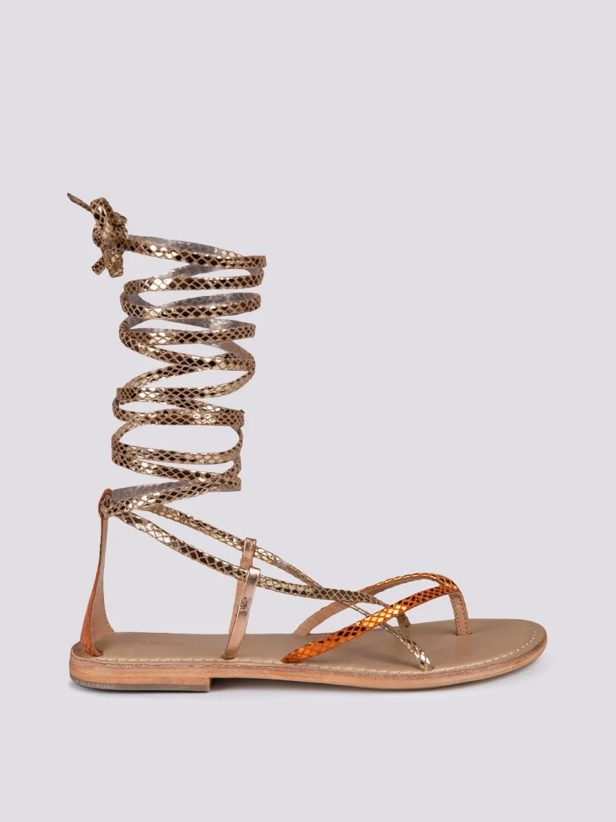Sandalo in pelle laminata arancio con lacci modello schiava