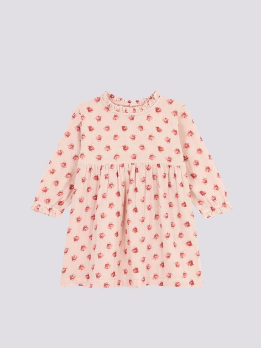 Abito in garza di cotone, un materiale leggero e confortevole. Capo molto raffinato grazie al collo alto, alle arricciature e alla stampa a fiori.