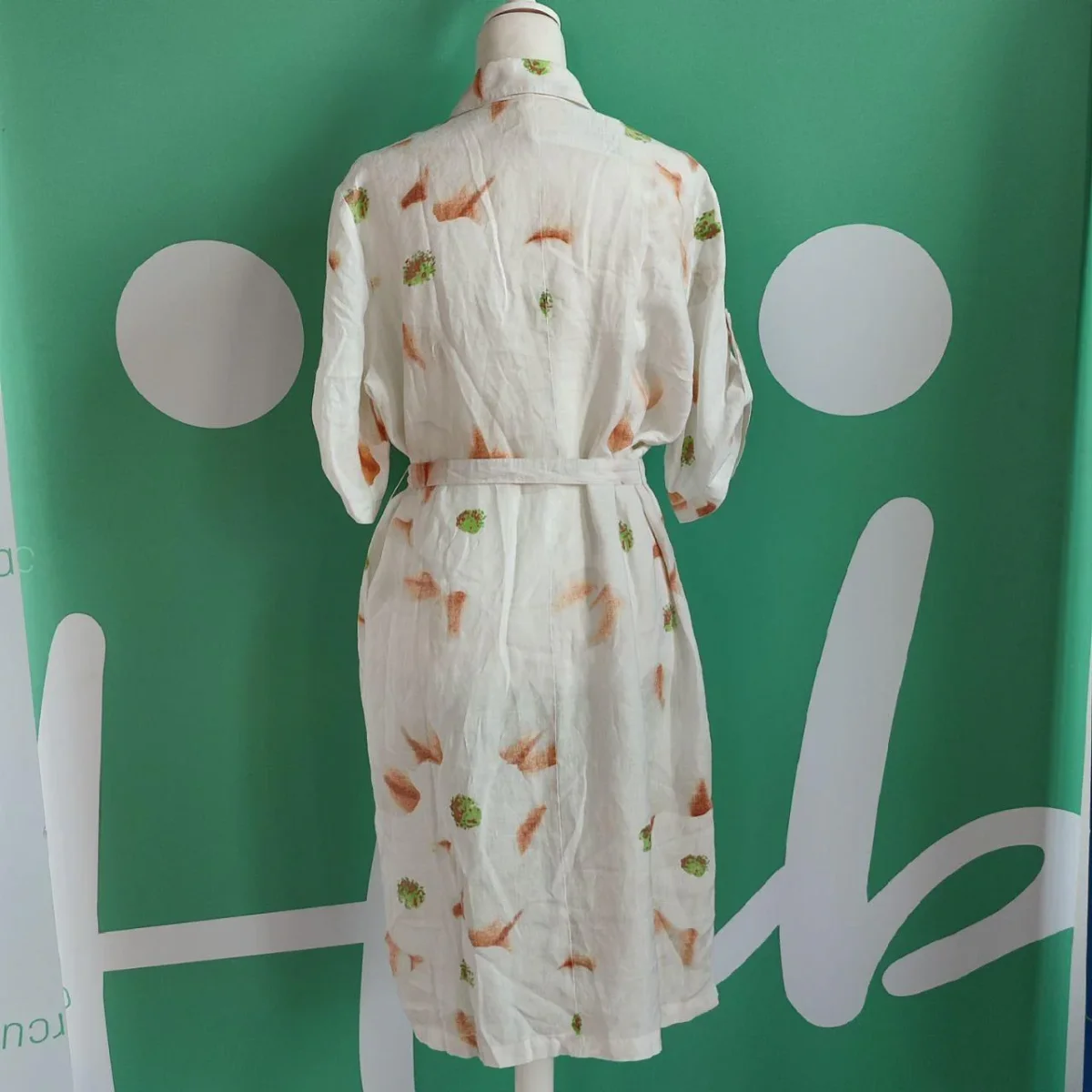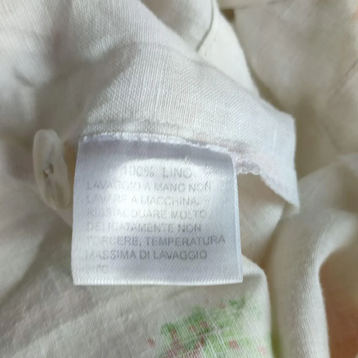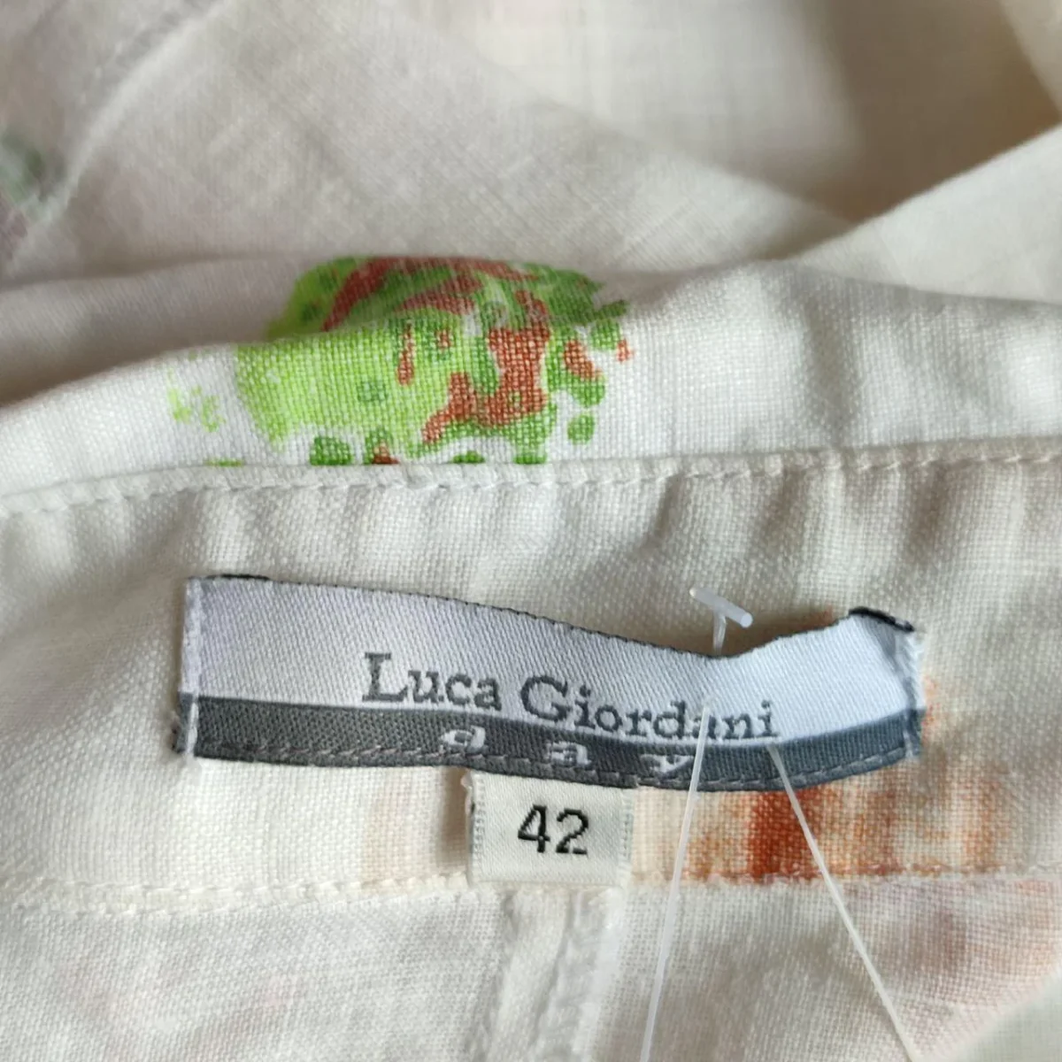Abito estivo della marca Luca Giordani, taglia 42. Il capo si presenta in ottimo stato, di color panna con dei motivi a fiori di colori pastello. Sono presenti dei bottoni in simil madreperla, una cintura sulla vita per facilitarne la chiusura e dei bottoni anche sulle maniche per poterle accorciare a piacimento. Il tessuto del vestito è composto al 100% di Lino, rendendo l’abito molto leggero e perfetto per l’estate
