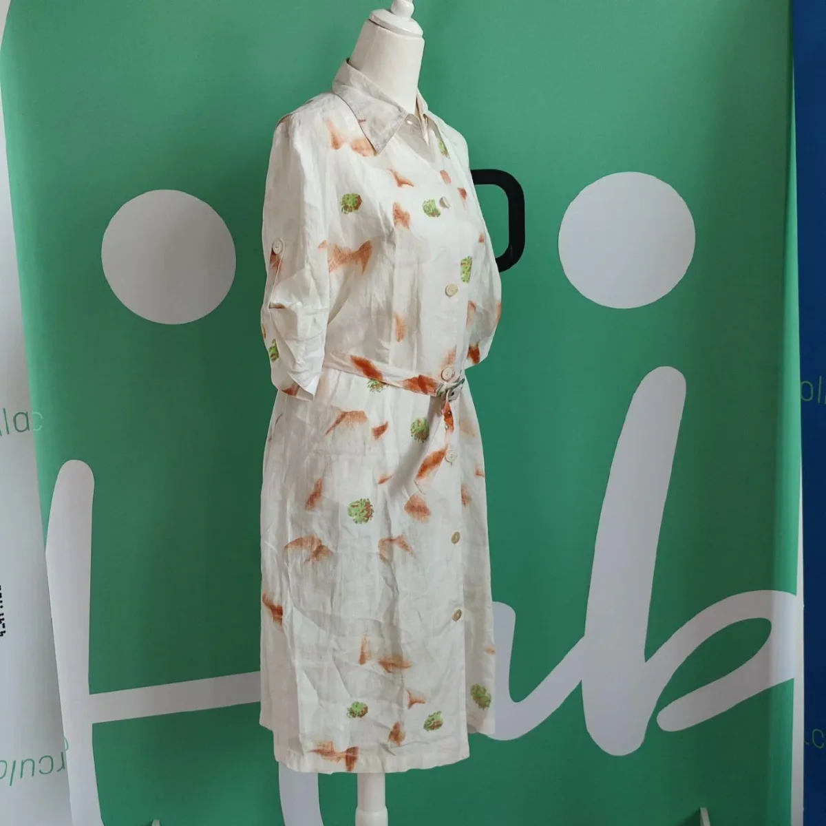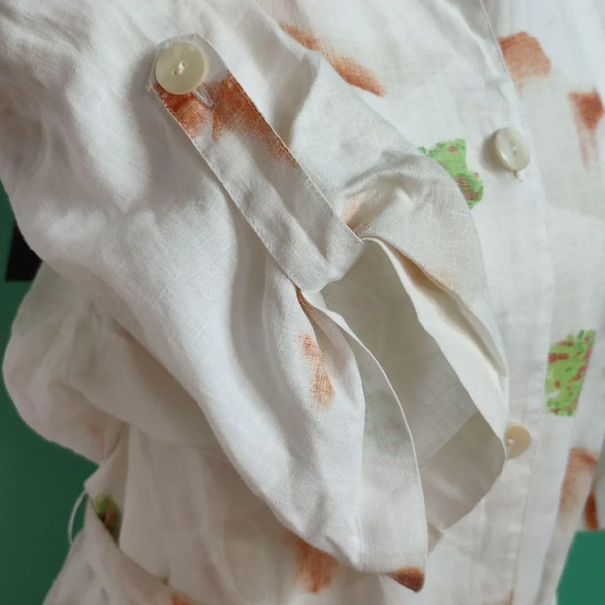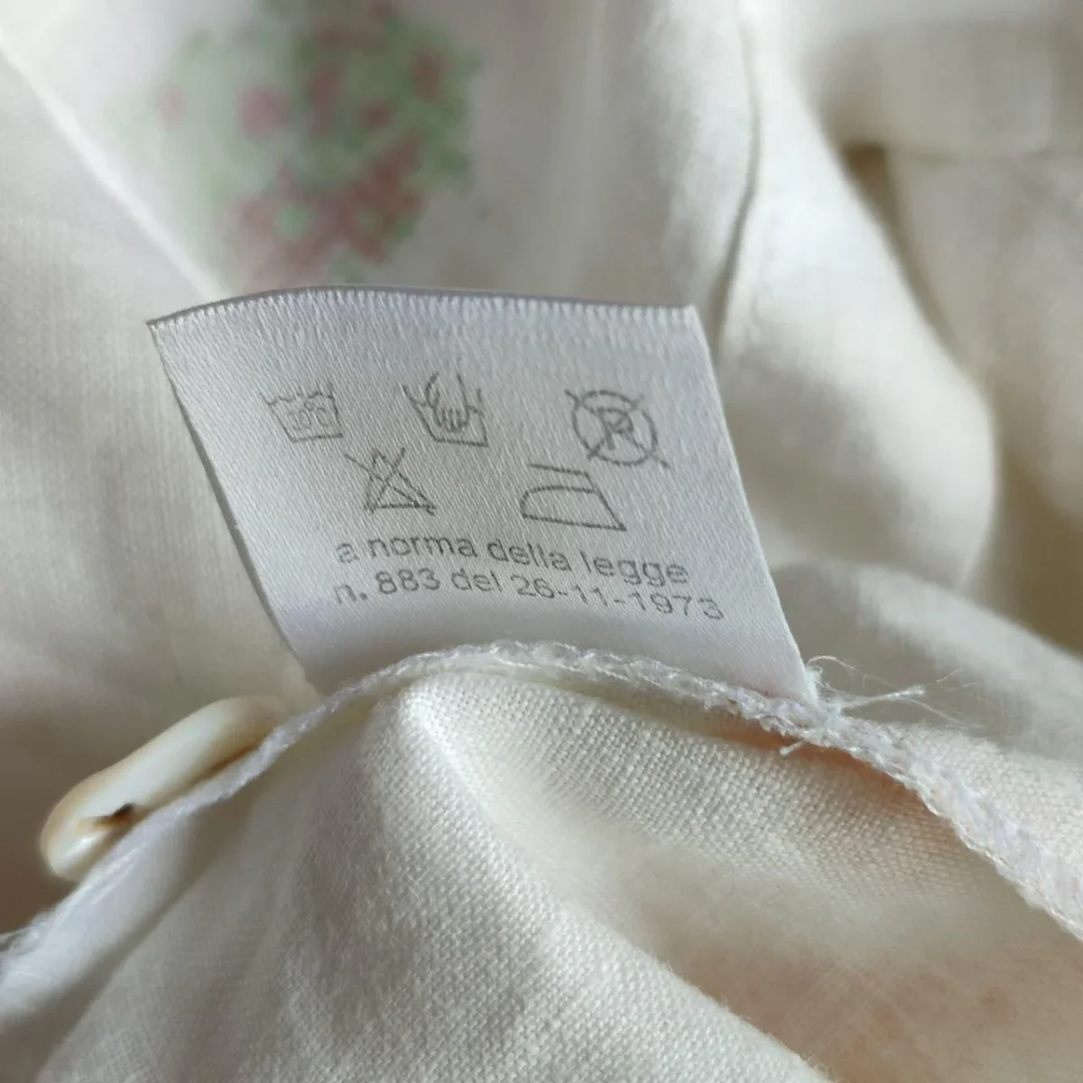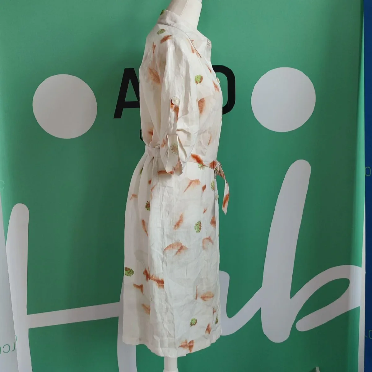 Abito estivo della marca Luca Giordani, taglia 42. Il capo si presenta in ottimo stato, di color panna con dei motivi a fiori di colori pastello. Sono presenti dei bottoni in simil madreperla, una cintura sulla vita per facilitarne la chiusura e dei bottoni anche sulle maniche per poterle accorciare a piacimento. Il tessuto del vestito è composto al 100% di Lino, rendendo l’abito molto leggero e perfetto per l’estate