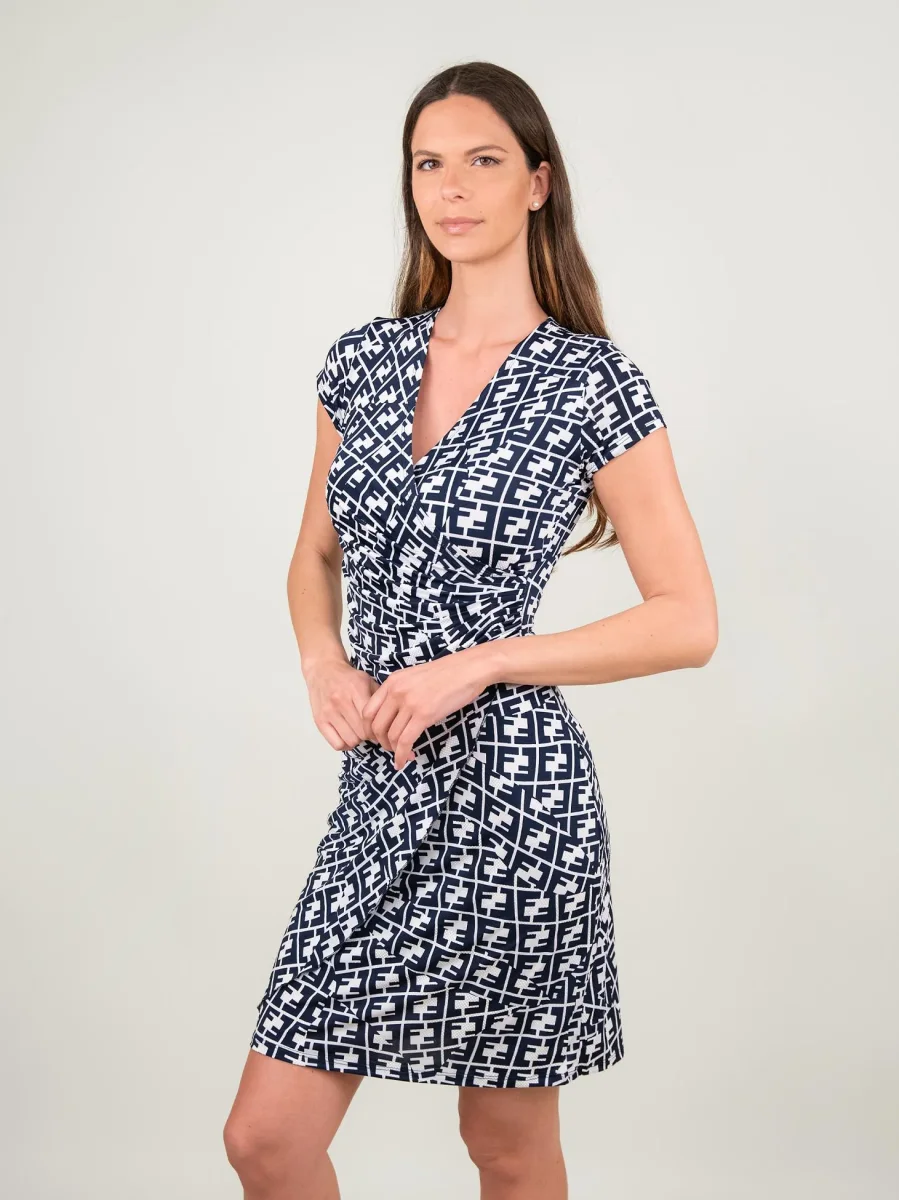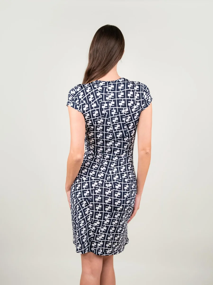 Abito in fantasia con pattern blu su sfondo bianco.