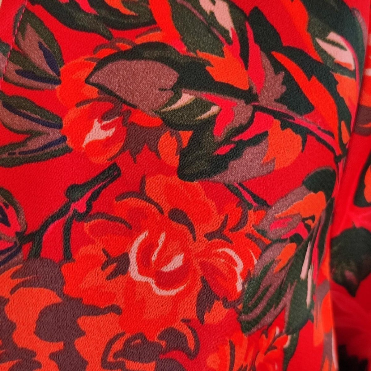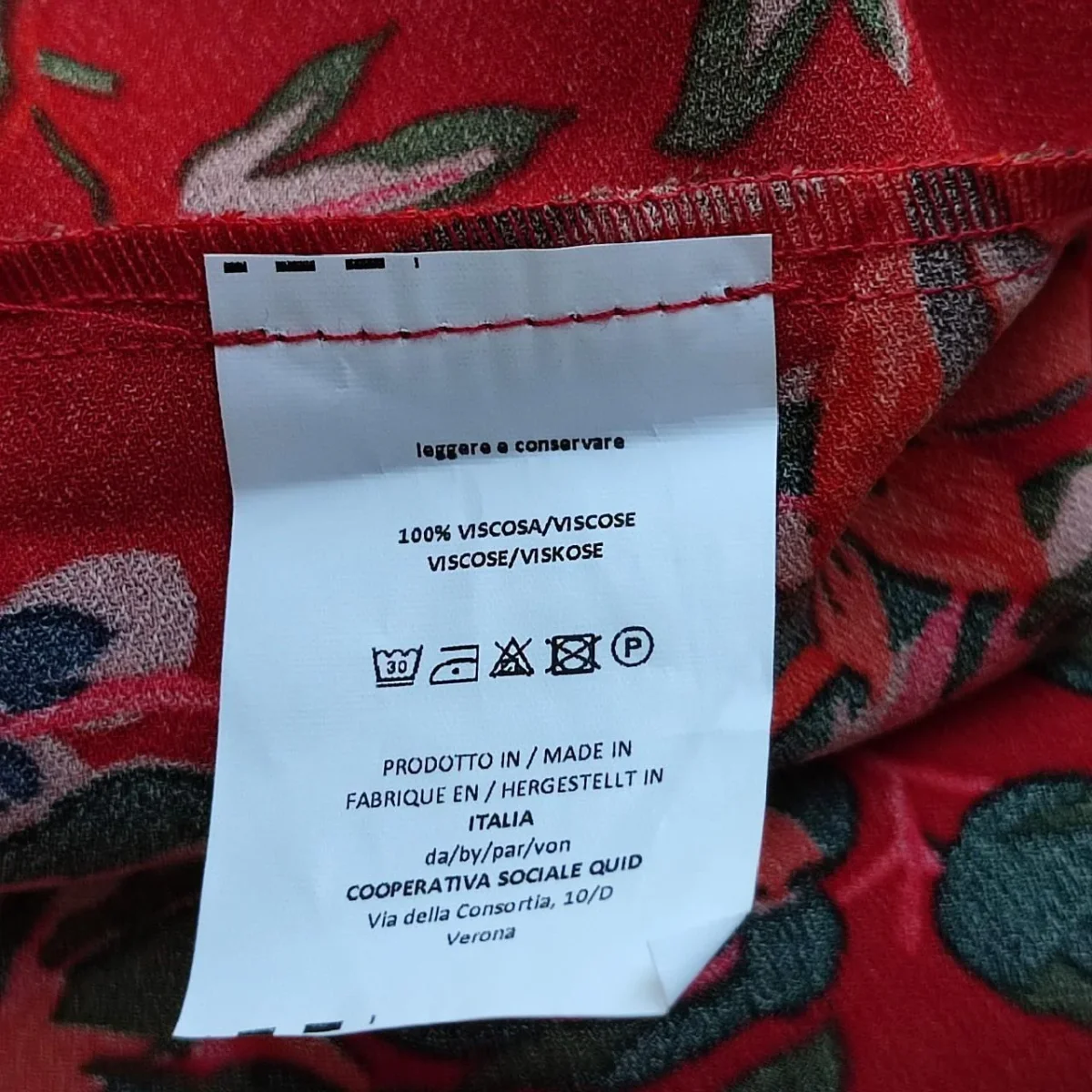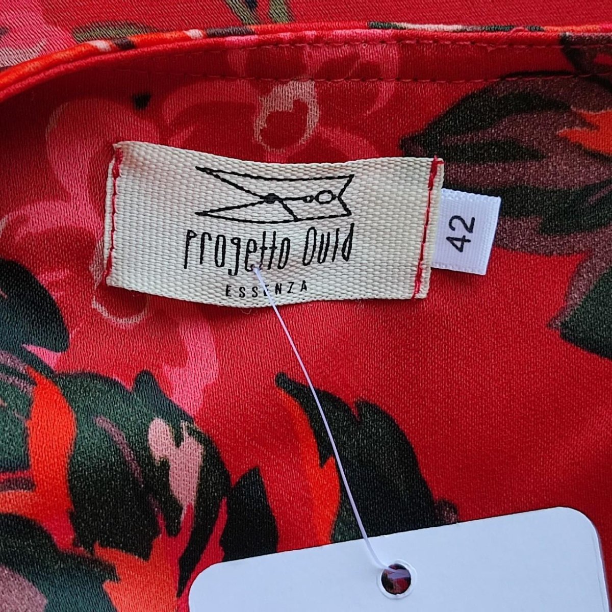 Abito medio-lungo, di colore Rosso. Ha una fantasia a fiori e la taglia è una 42. La marca è Progetto Ouid. È un abito a maniche lunghe, con uno scollo a V poco pronunciato sul davanti. Lo stile è quello classico, sartoriale, dritto. Non sono presenti difetti, il tessuto è in ottimo stato ed è un 100% Viscosa. Preloved, Made in italy.