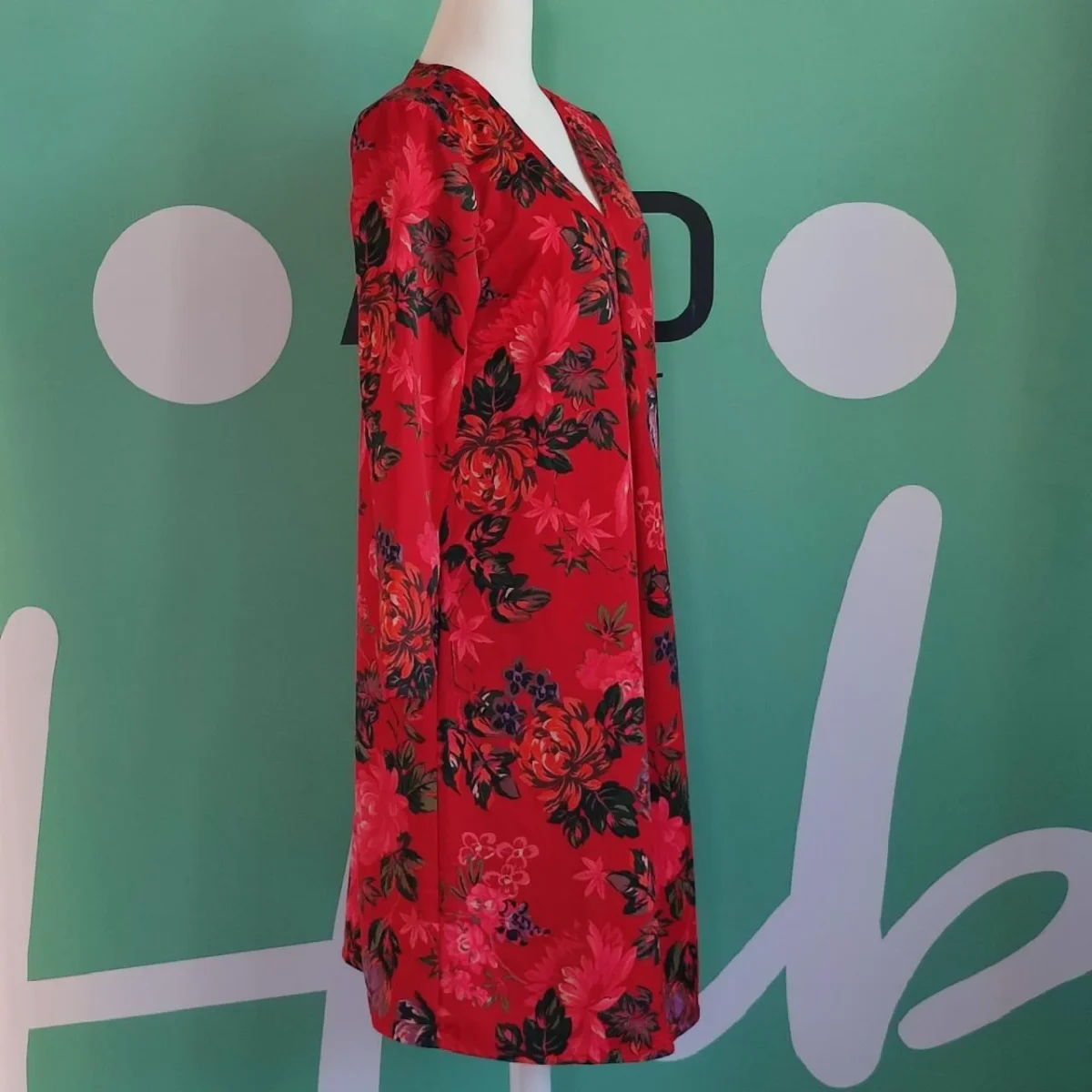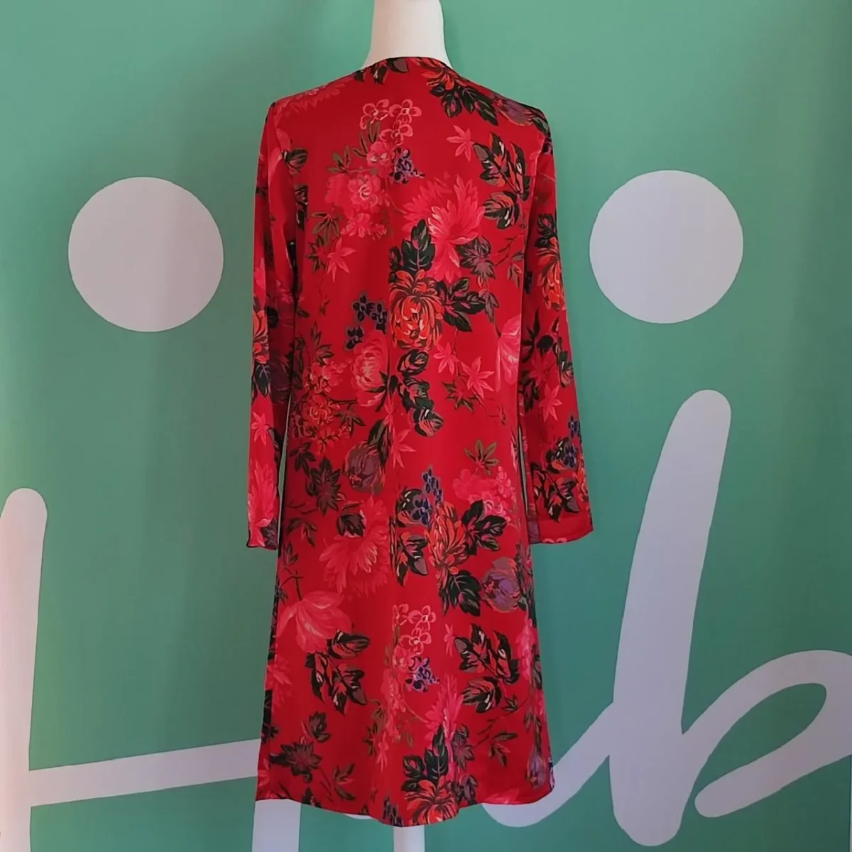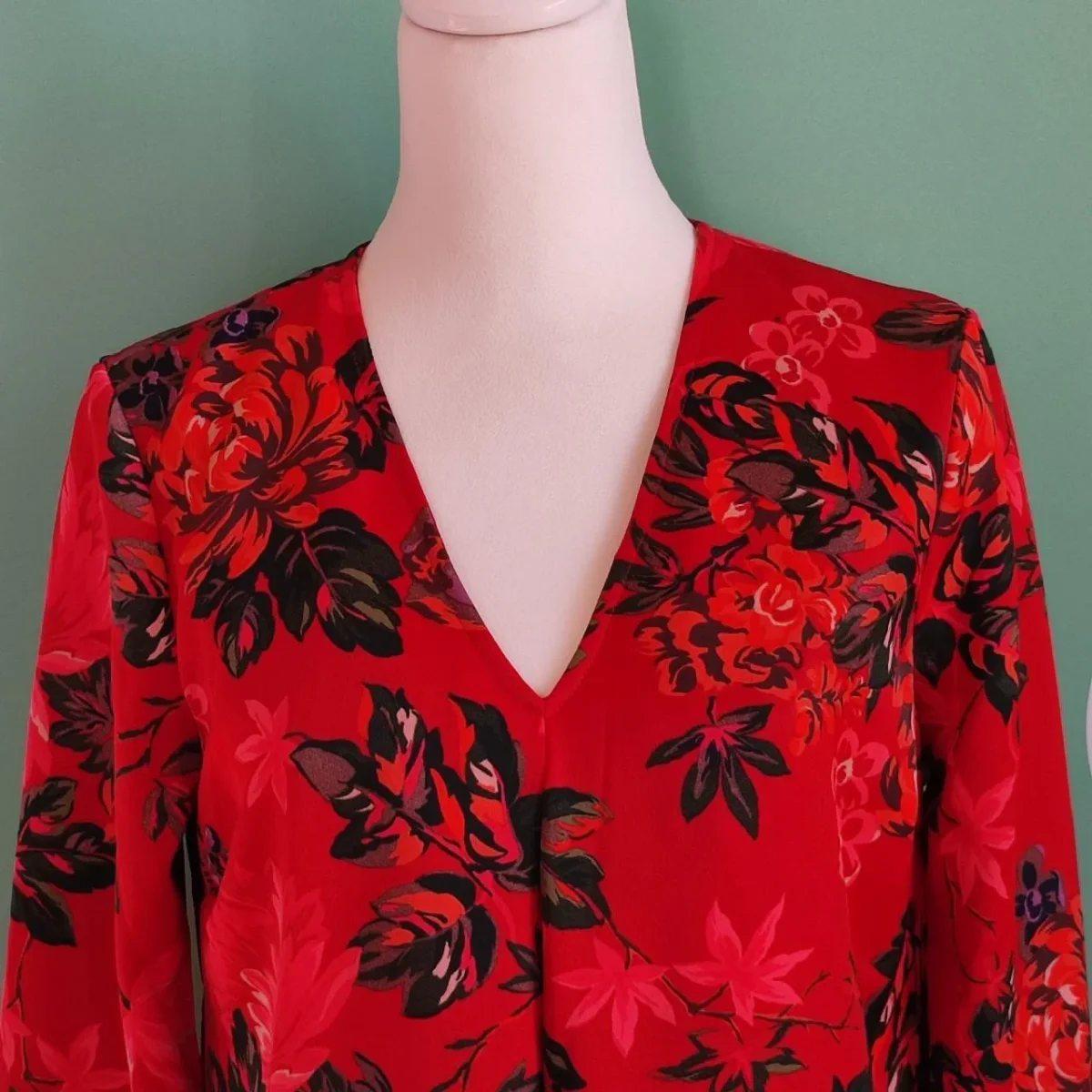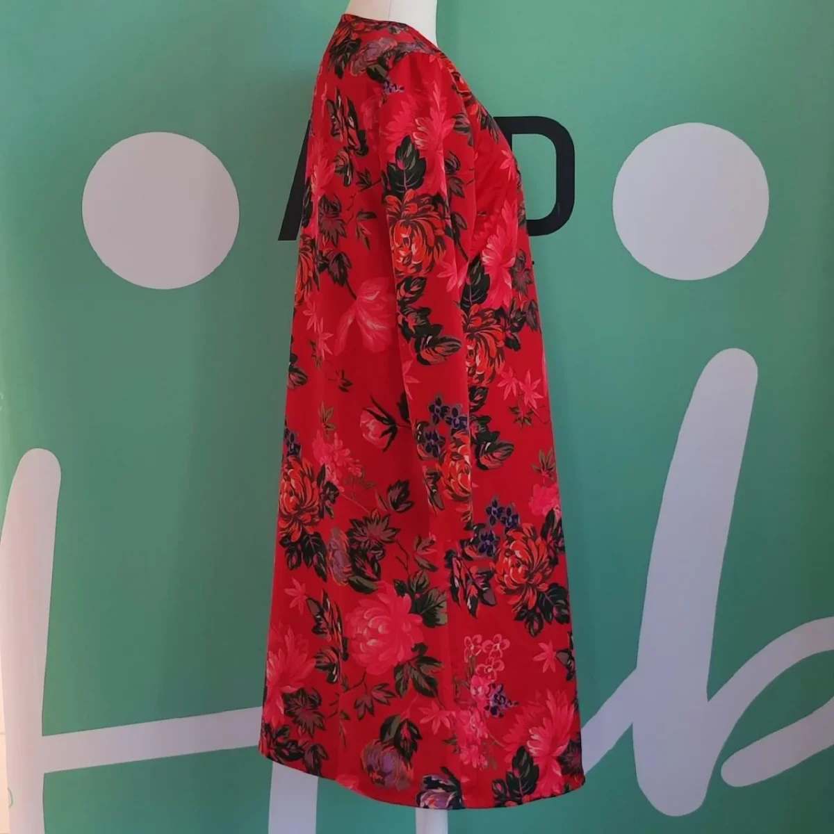 Abito medio-lungo, di colore Rosso. Ha una fantasia a fiori e la taglia è una 42. La marca è Progetto Ouid. È un abito a maniche lunghe, con uno scollo a V poco pronunciato sul davanti. Lo stile è quello classico, sartoriale, dritto. Non sono presenti difetti, il tessuto è in ottimo stato ed è un 100% Viscosa. Preloved, Made in italy.