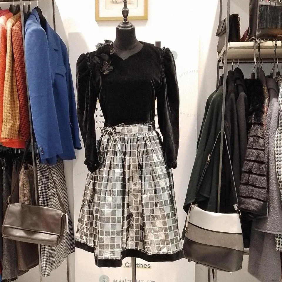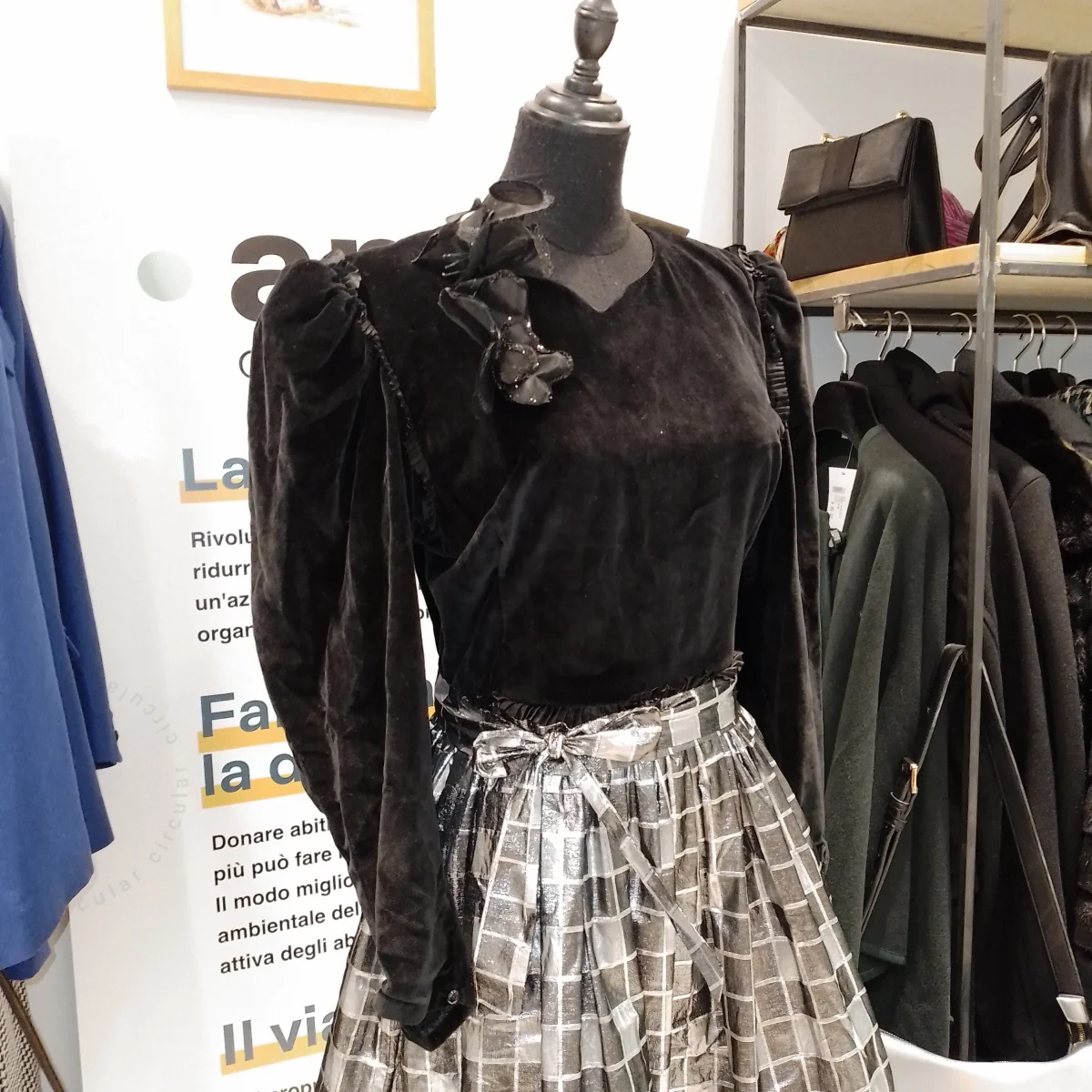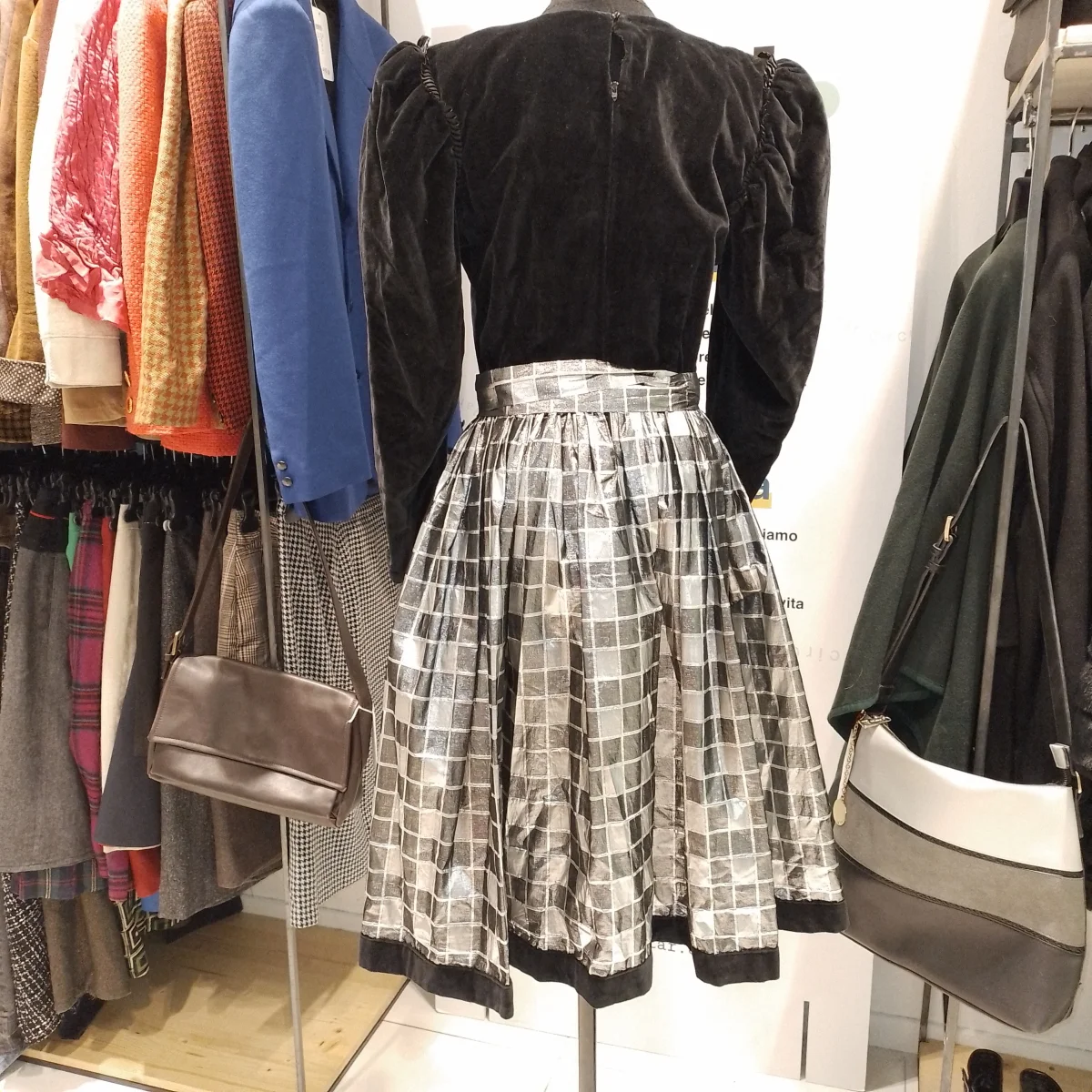 Abito Rocchi, vintage anni ‘80, composto dalla parte superiore in velluto con manica lunga leggermente a palloncino e una spilla adornata a fiori. La parte inferiore invece è composta da una gonna a quadri rifinita in velluto a riprendere la parte alta.