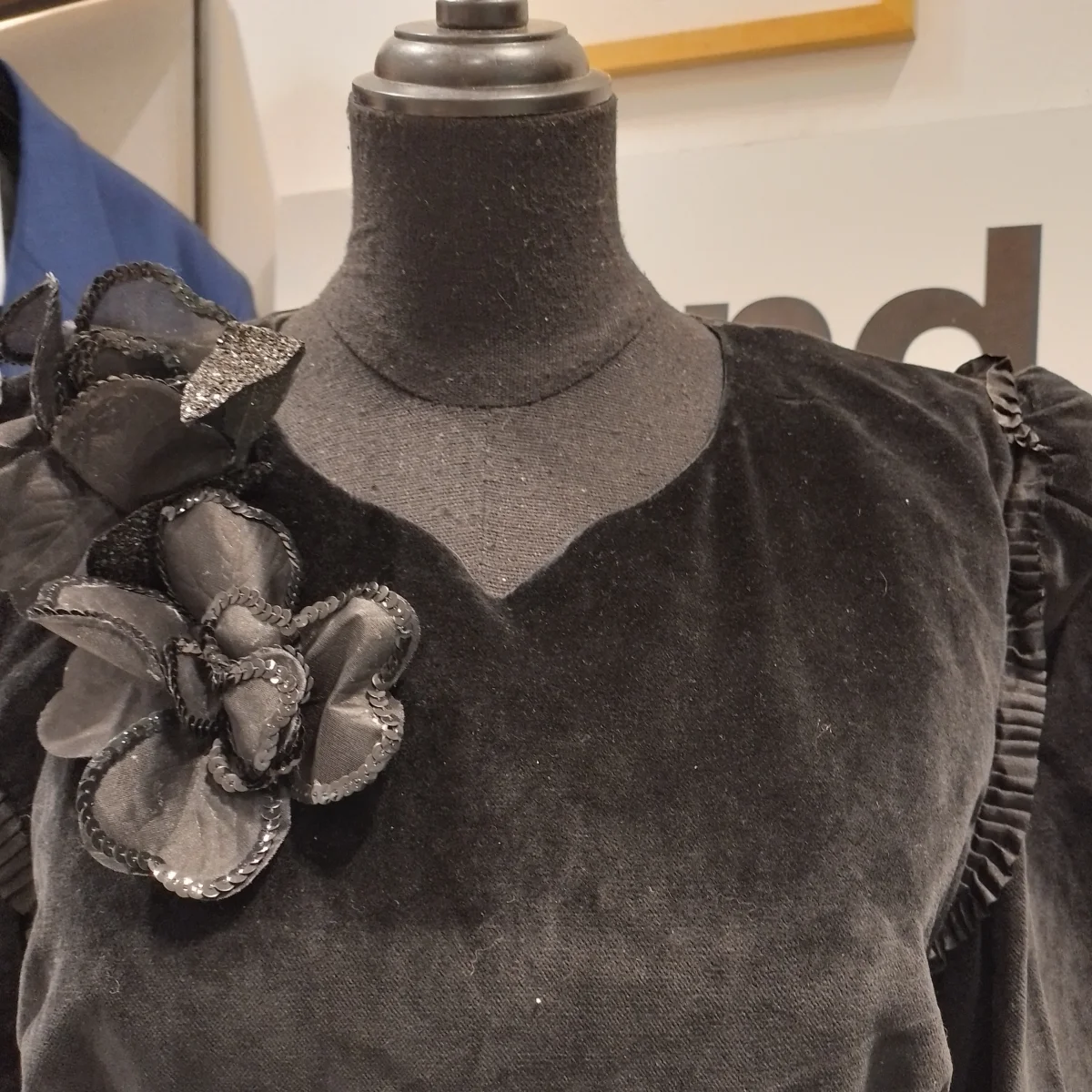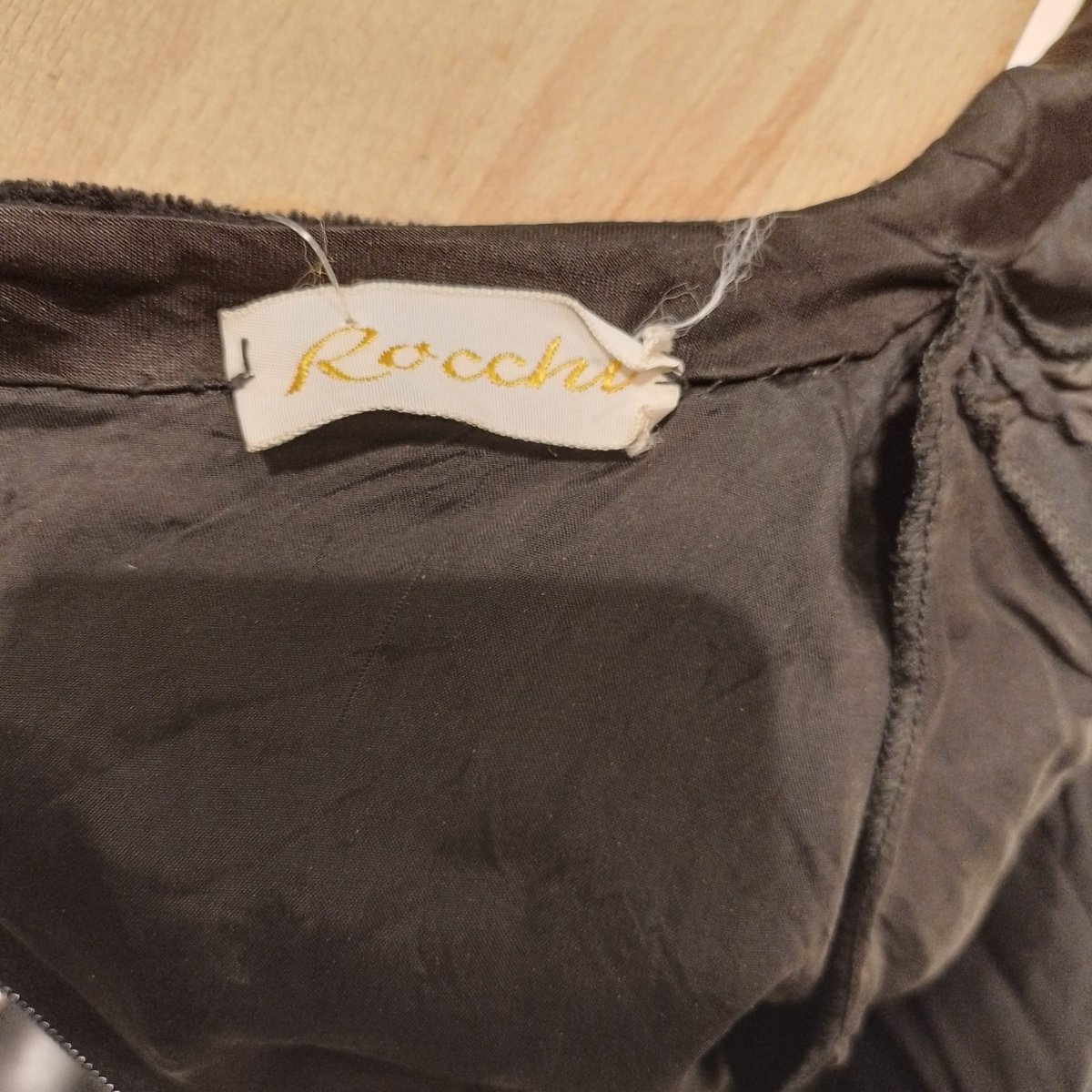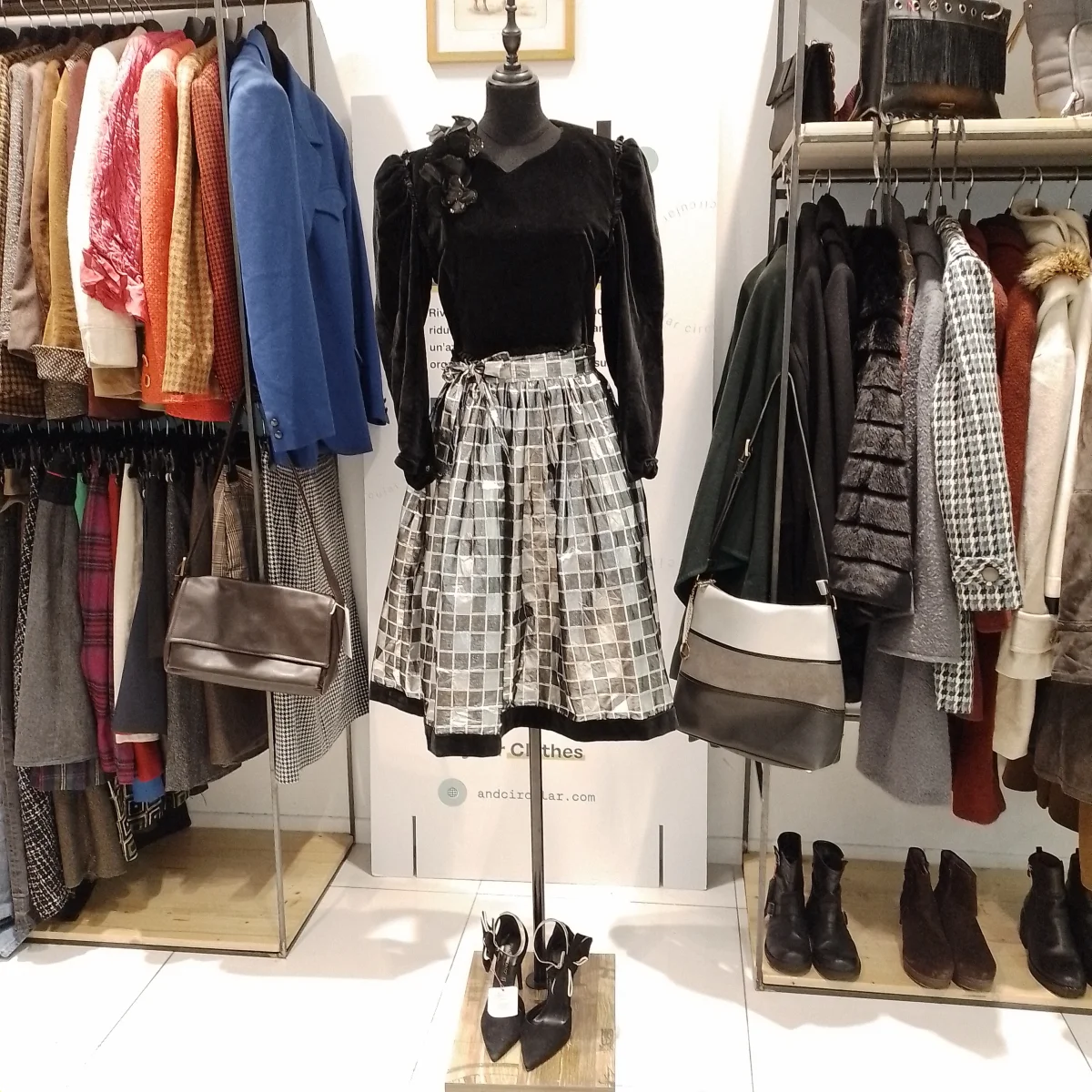 Abito Rocchi, vintage anni ‘80, composto dalla parte superiore in velluto con manica lunga leggermente a palloncino e una spilla adornata a fiori. La parte inferiore invece è composta da una gonna a quadri rifinita in velluto a riprendere la parte alta.