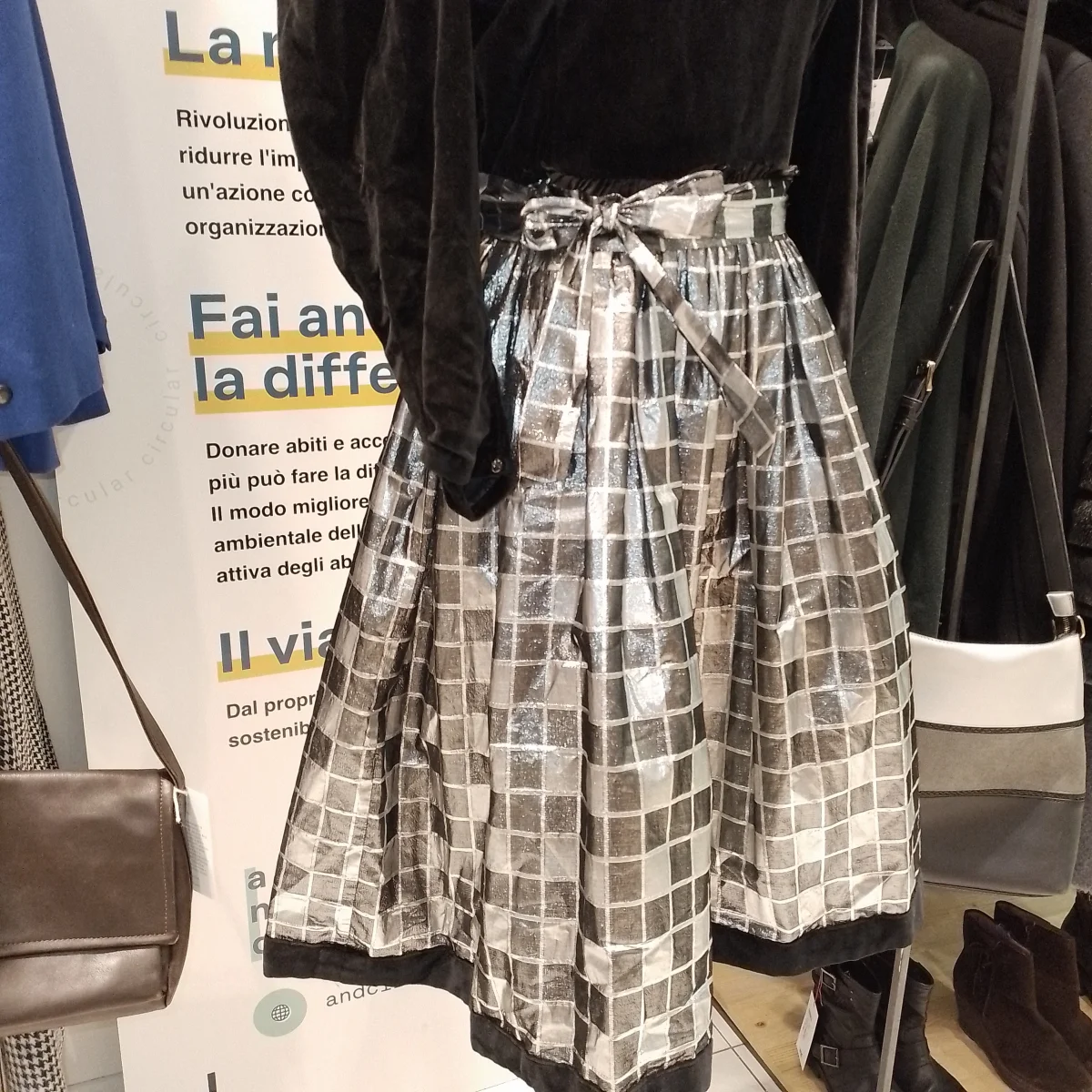 Cinturina rimovibile da poter annodare in vita dello stesso tessuto della gonna. Completamente foderata, con sotto gonna. Posteriormente cernierato e piccolo bottoncino.
