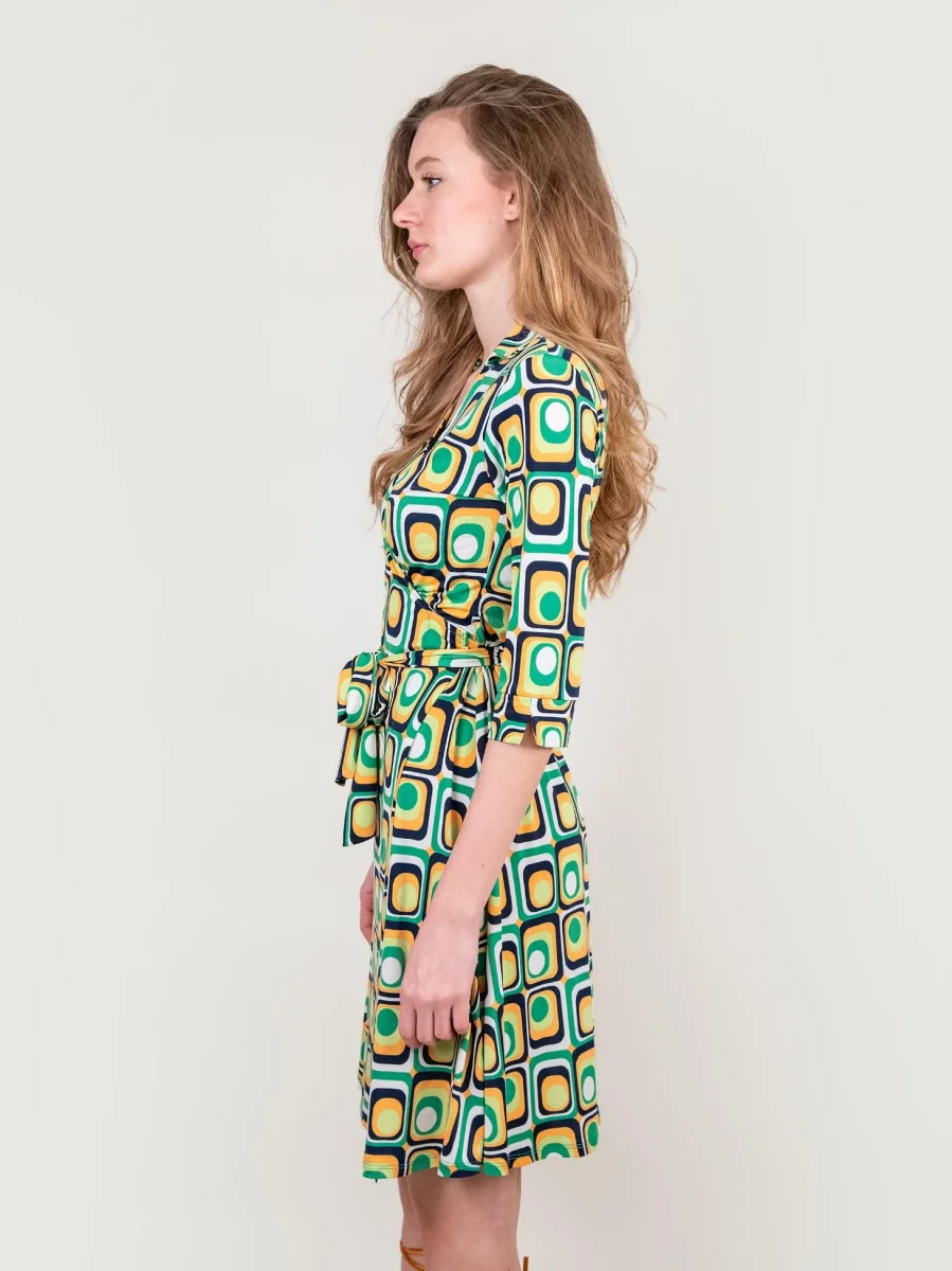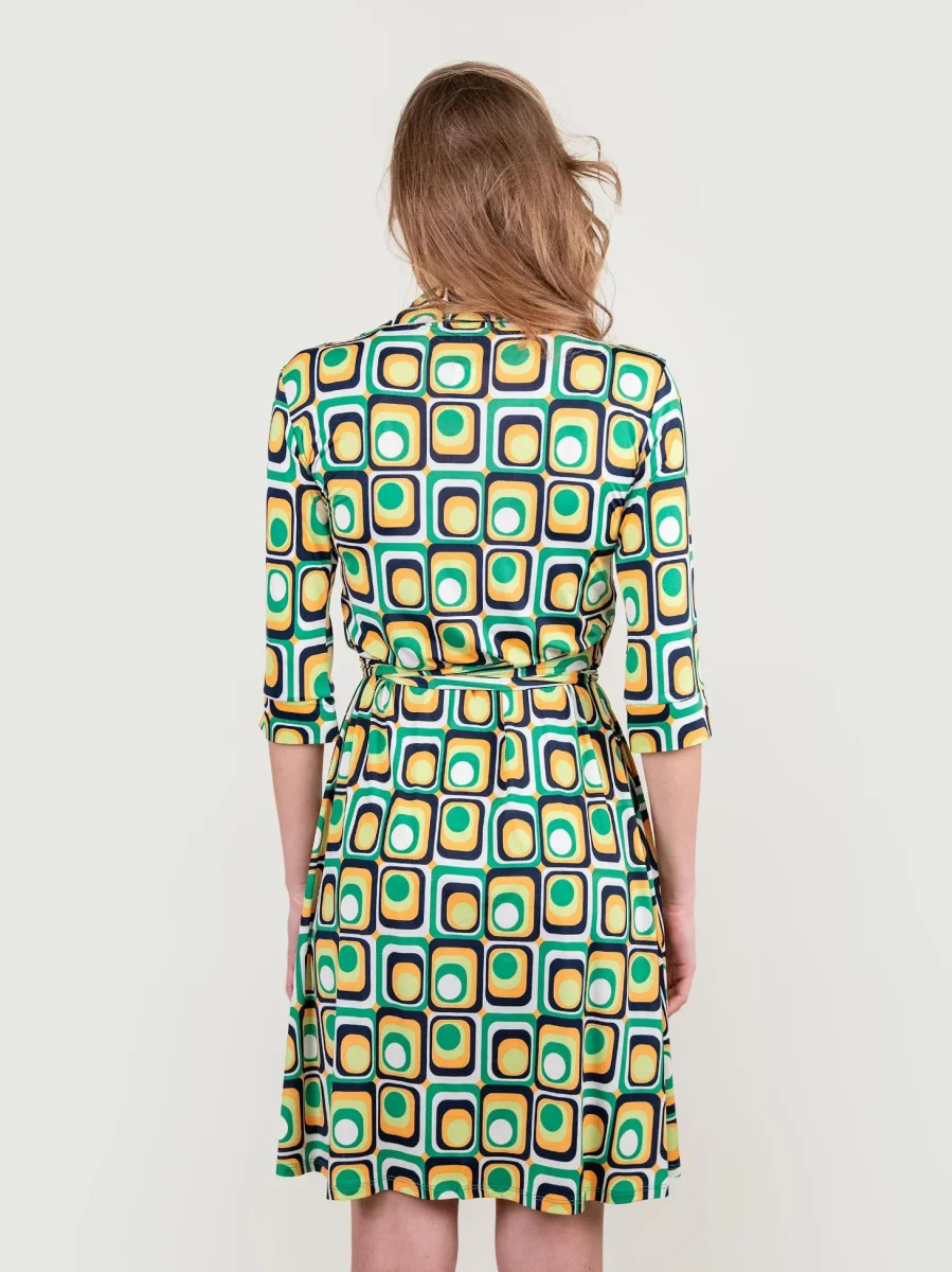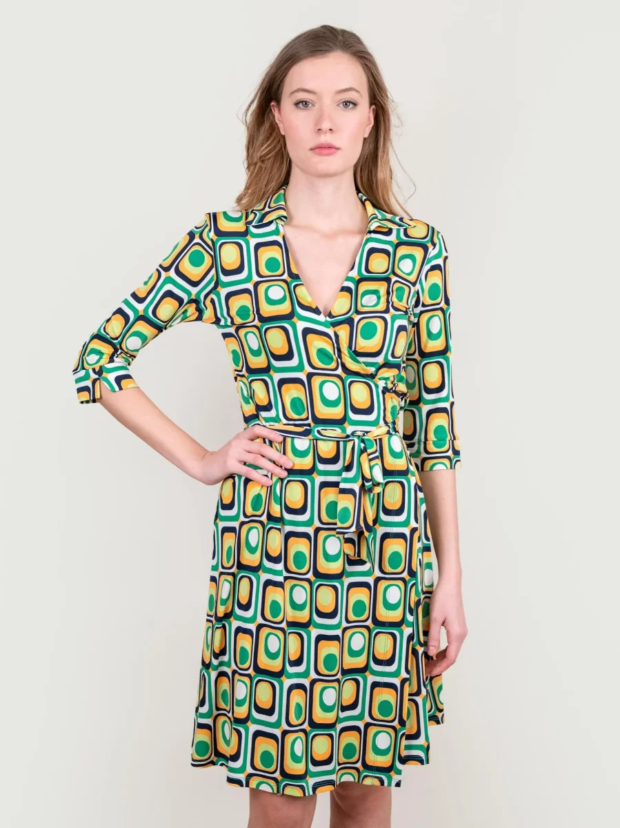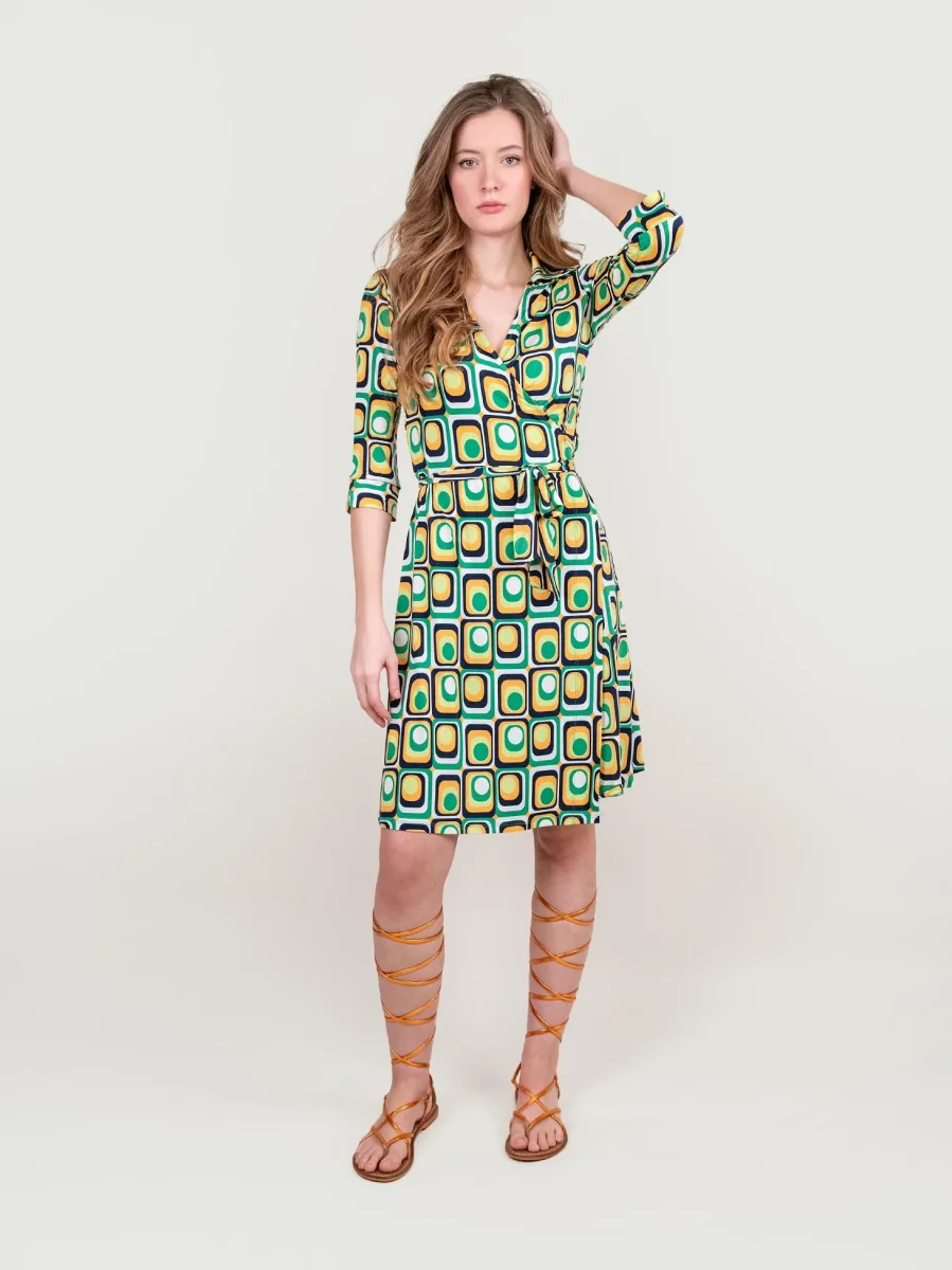 Abito kimono in fantasia optical verde multicolor. Dettaglio cintura in vita in tonalità. Manica tre quarti. Scollo a V. Leggero spacco laterale. Dettaglio colletto tipo camicia. Il tessuto elasticizzato di questo abito avvolge il corpo esaltandone la silhouette. Vestibilità regolare super confortevole. Peso medio.