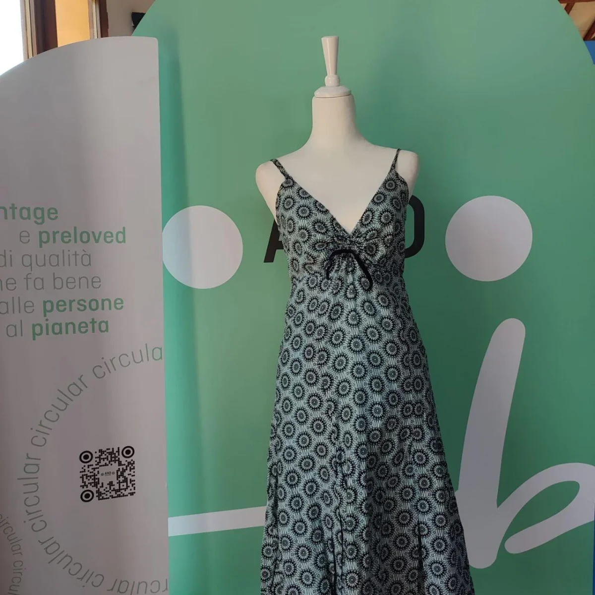Abito a manica lunga. Marca Scatola Magica. Tg. 46. Composizione non presente, ma al tatto Poliestere. Colore Viola con fiori sempre nelle tonalità del viola e file parallele in Lurex color Oro ad illuminare l’intero abito. La scollatura a V profonda, dalle spalle una serie di pence aperte che drappeggiano lessermente il corpetto. In vita l’elastico e la sua fascia del medesimo tessuto da legare in cintura con i suoi sottili passanti e sempre le pence aperte a donare ampiezza al tessuto, pur cadendo morbido. Il giromanica sinistro andrebbe meglio assicurato, come da foto. Buone condizioni.