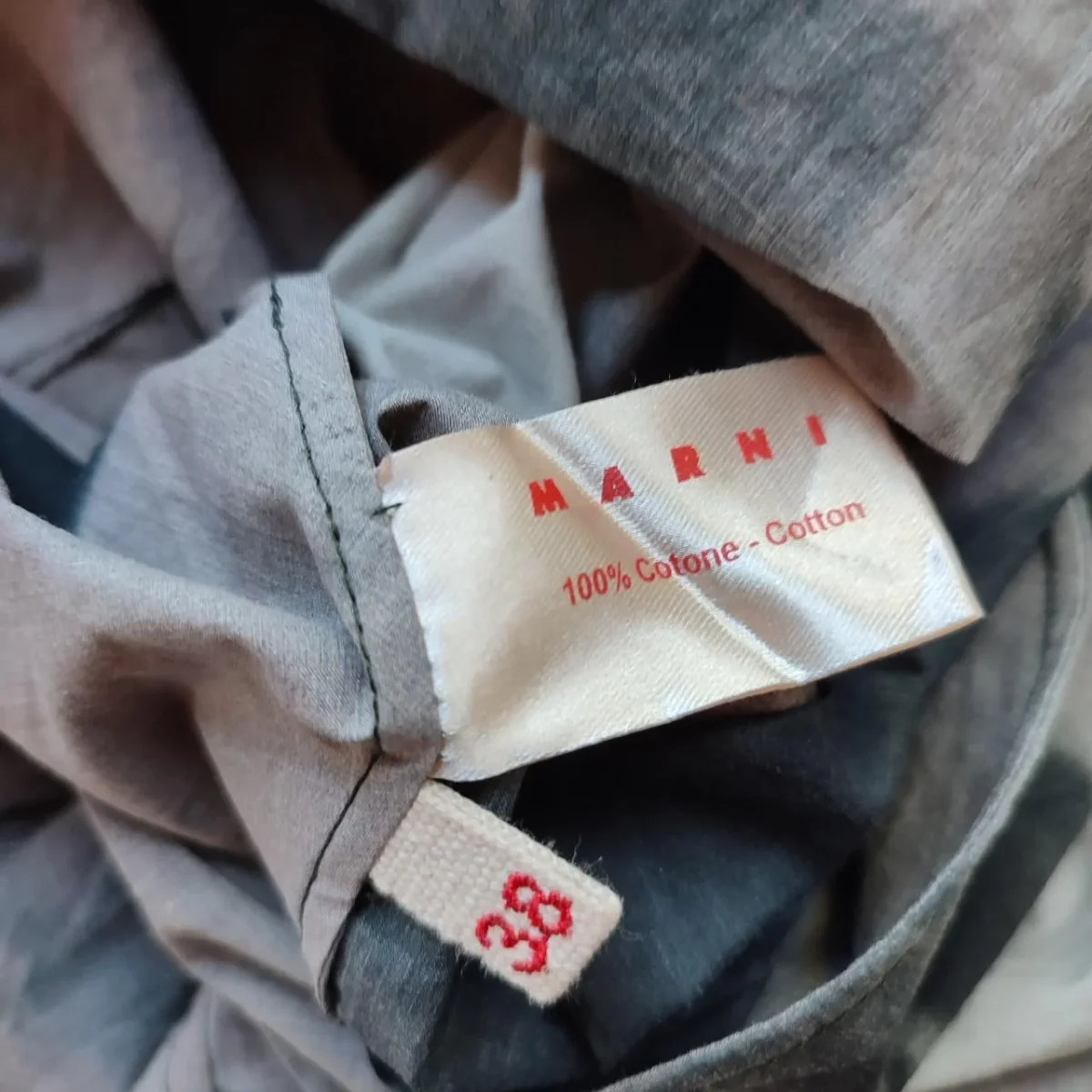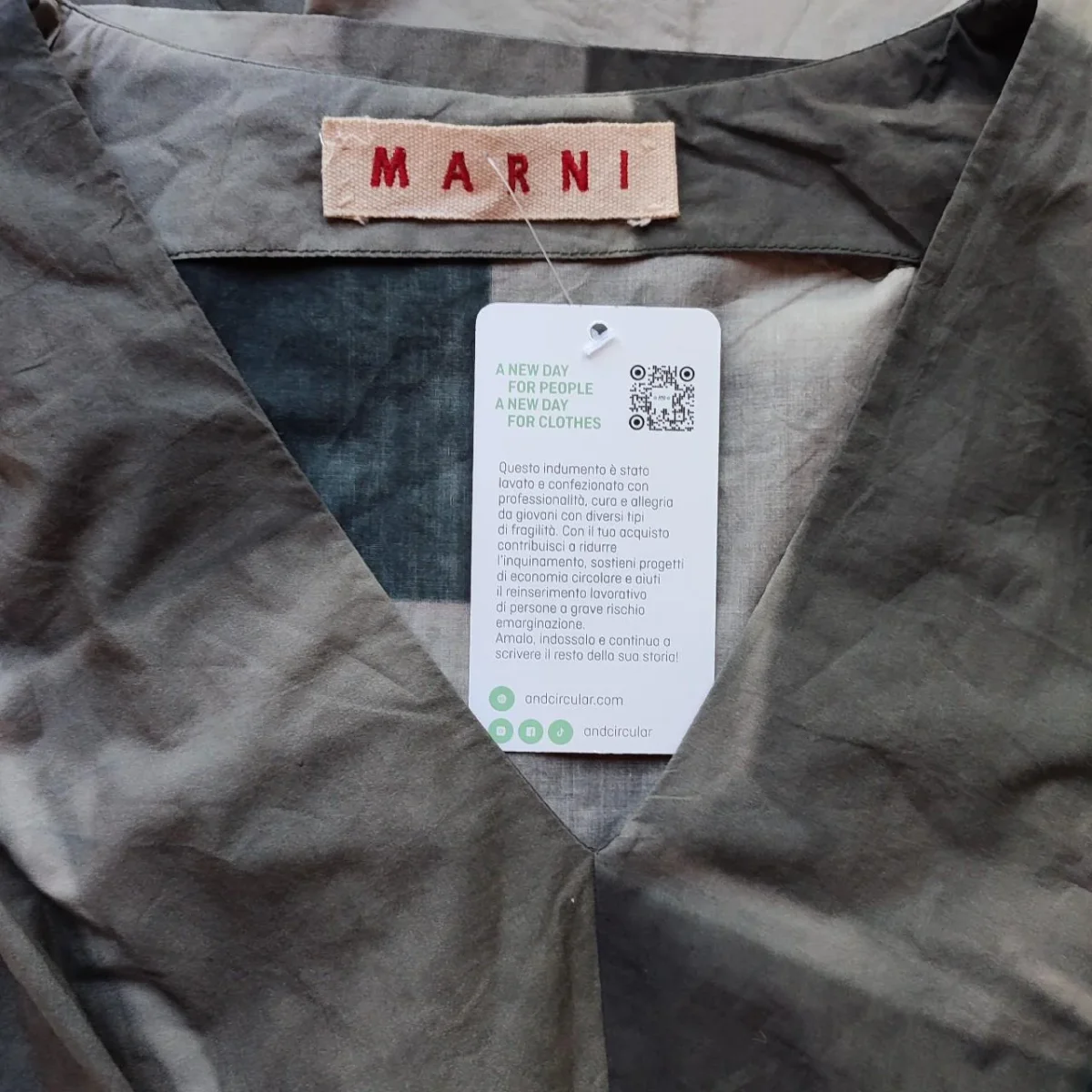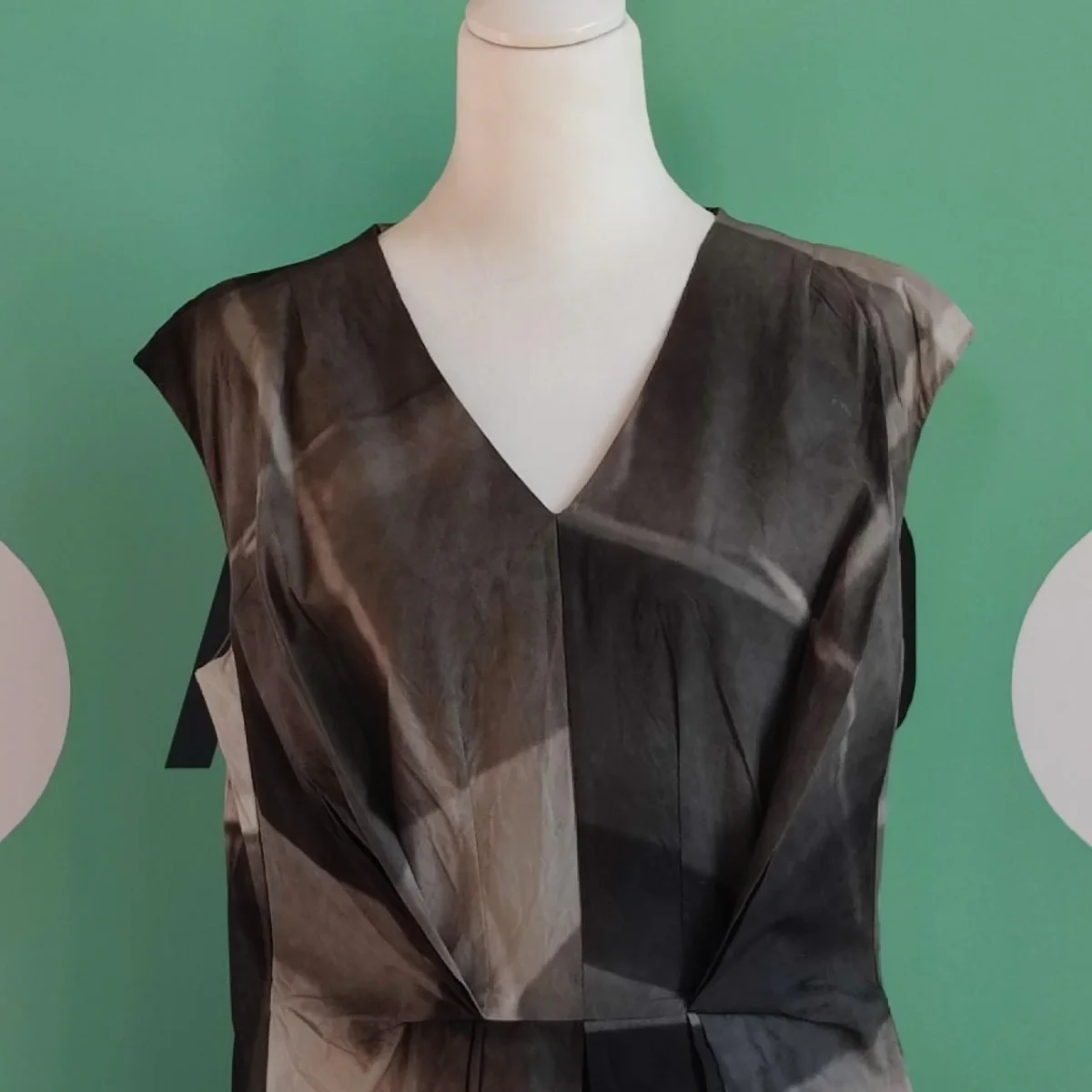 Abito a spalla larga senza maniche. Marca Marni. Tg. 38. 100% Cotone. Colore fantasia geometria astratta e sfumata nelle tonalità che virano dal Nero al Grigio perla chiaro. Abito che non presenta nessun tipo di chiusura. Lo scollo a V è sottolineato da due pieghe aperte verticali. In vita, ancora due pieghe verticali aperte creano un bel movimento e allargano il fondo. Le tasche a filetto verticale, donano al capo quella informalita’, pur restando un abito di grande eleganza. Buone condizioni