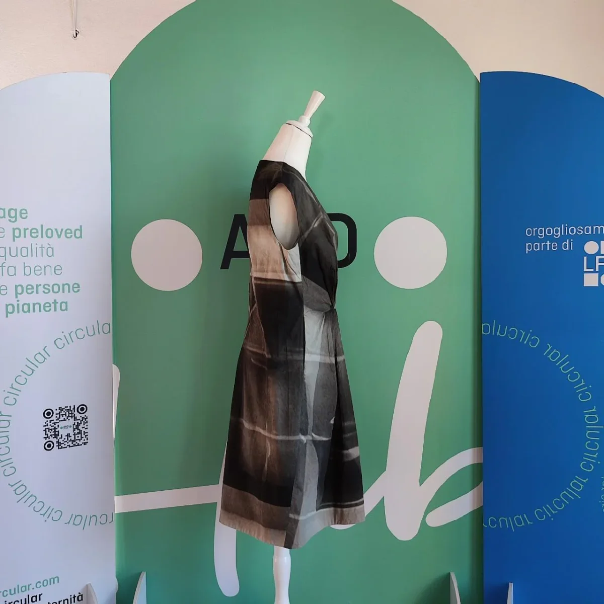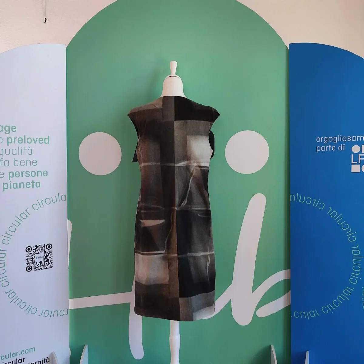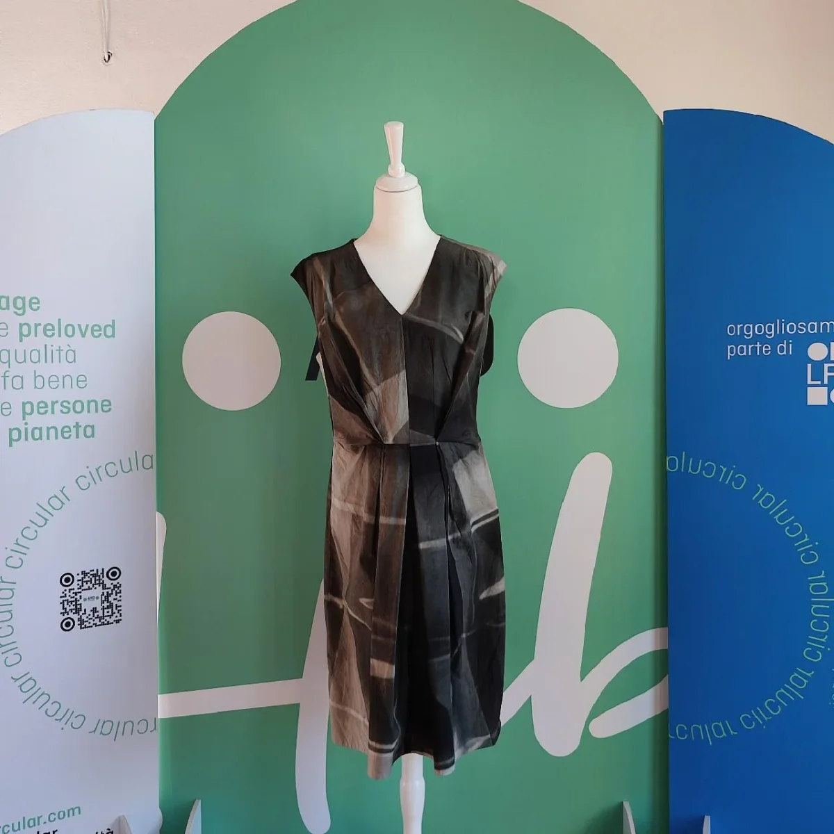 Abito a spalla larga senza maniche. Marca Marni. Tg. 38. 100% Cotone. Colore fantasia geometria astratta e sfumata nelle tonalità che virano dal Nero al Grigio perla chiaro. Abito che non presenta nessun tipo di chiusura. Lo scollo a V è sottolineato da due pieghe aperte verticali. In vita, ancora due pieghe verticali aperte creano un bel movimento e allargano il fondo. Le tasche a filetto verticale, donano al capo quella informalita’, pur restando un abito di grande eleganza. Buone condizioni