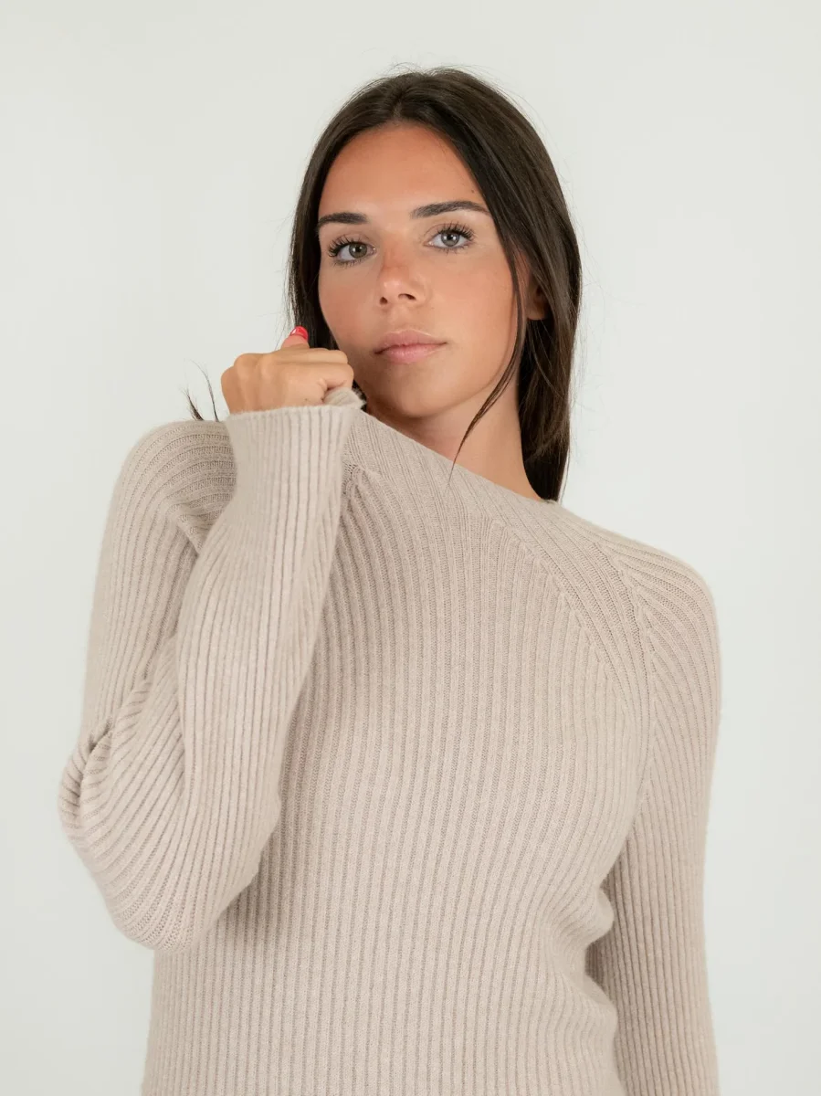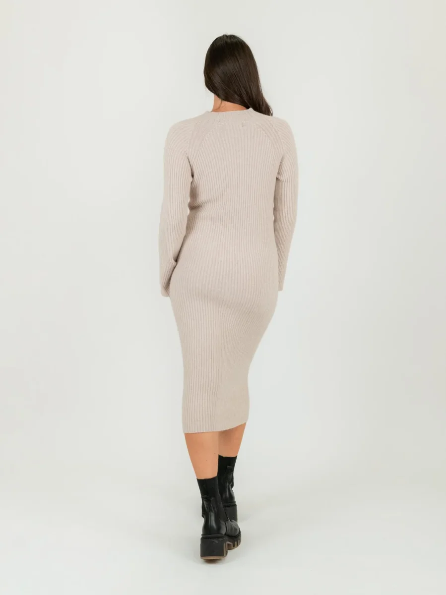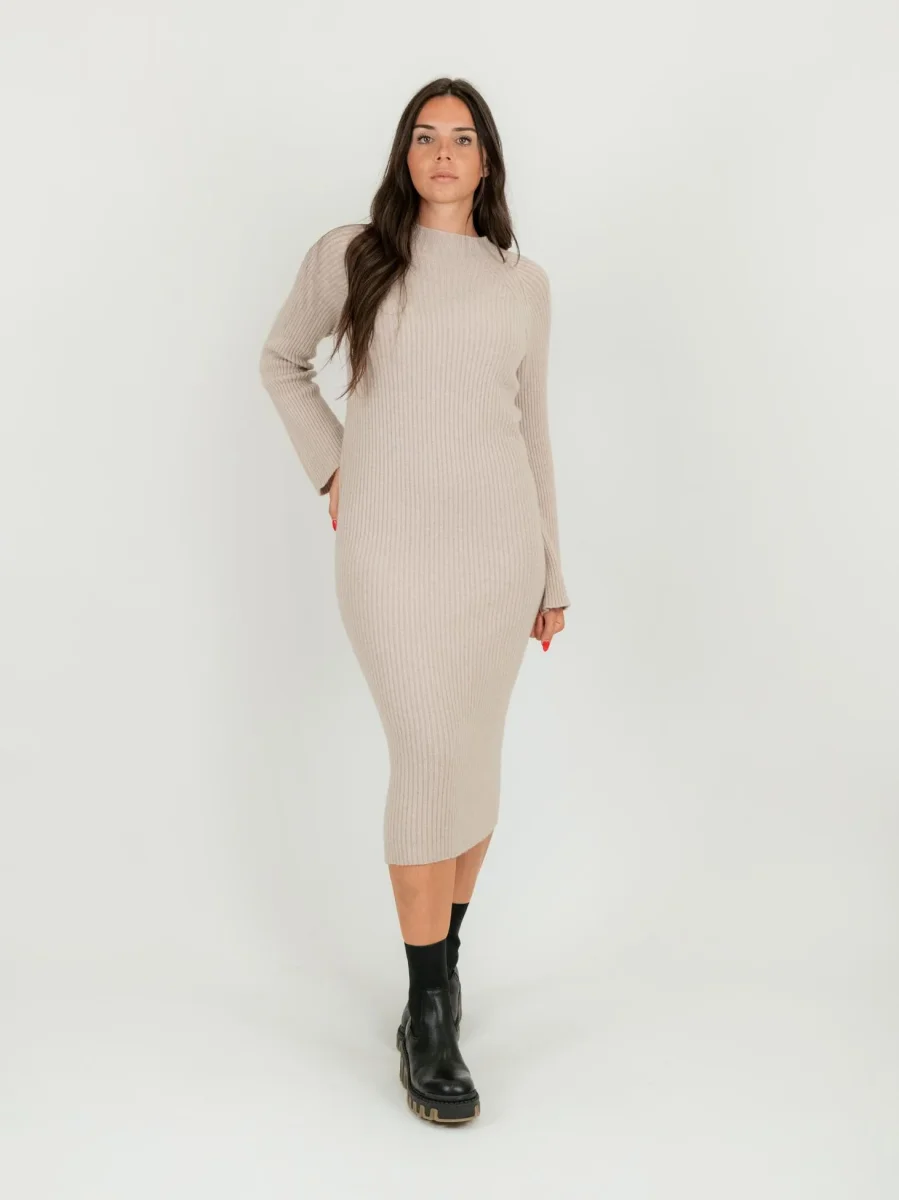 Vestito midi in maglia beige a costine con maniche raglan leggermente svasate.