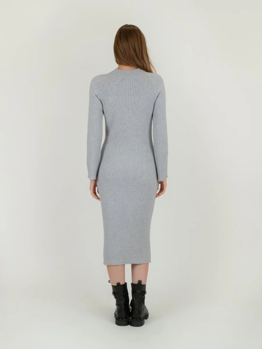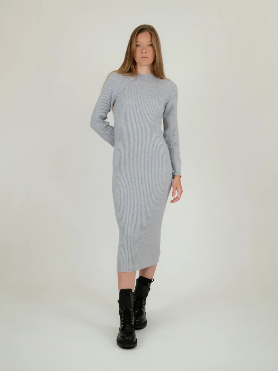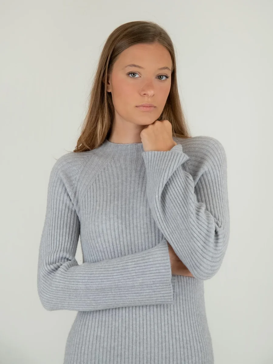 Vestito midi in maglia grigio perla con maniche raglan leggermente svasate.