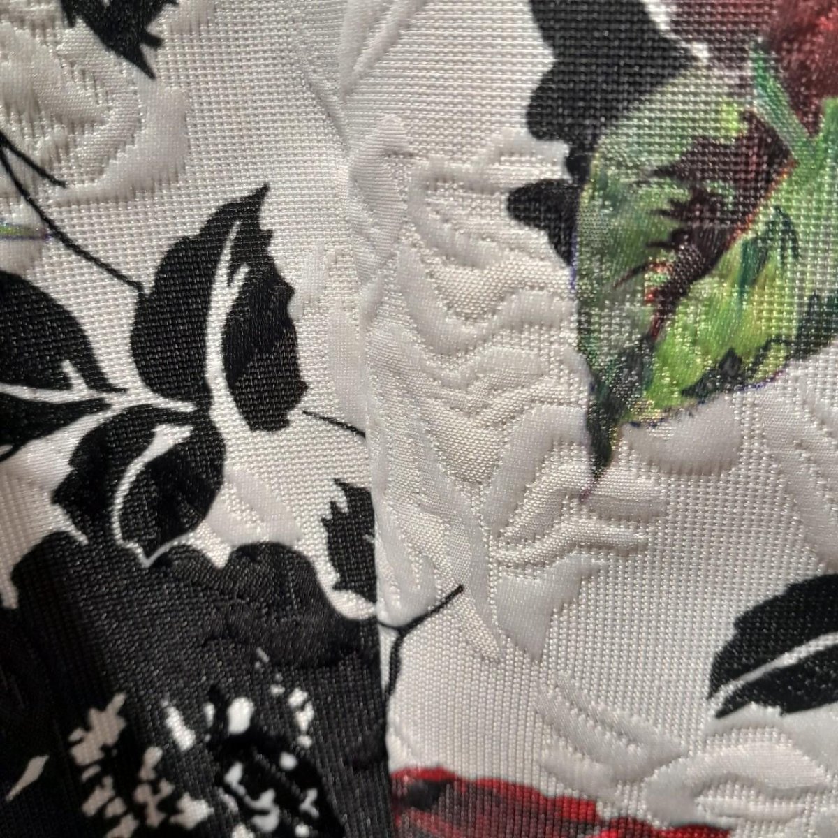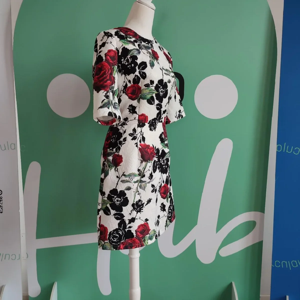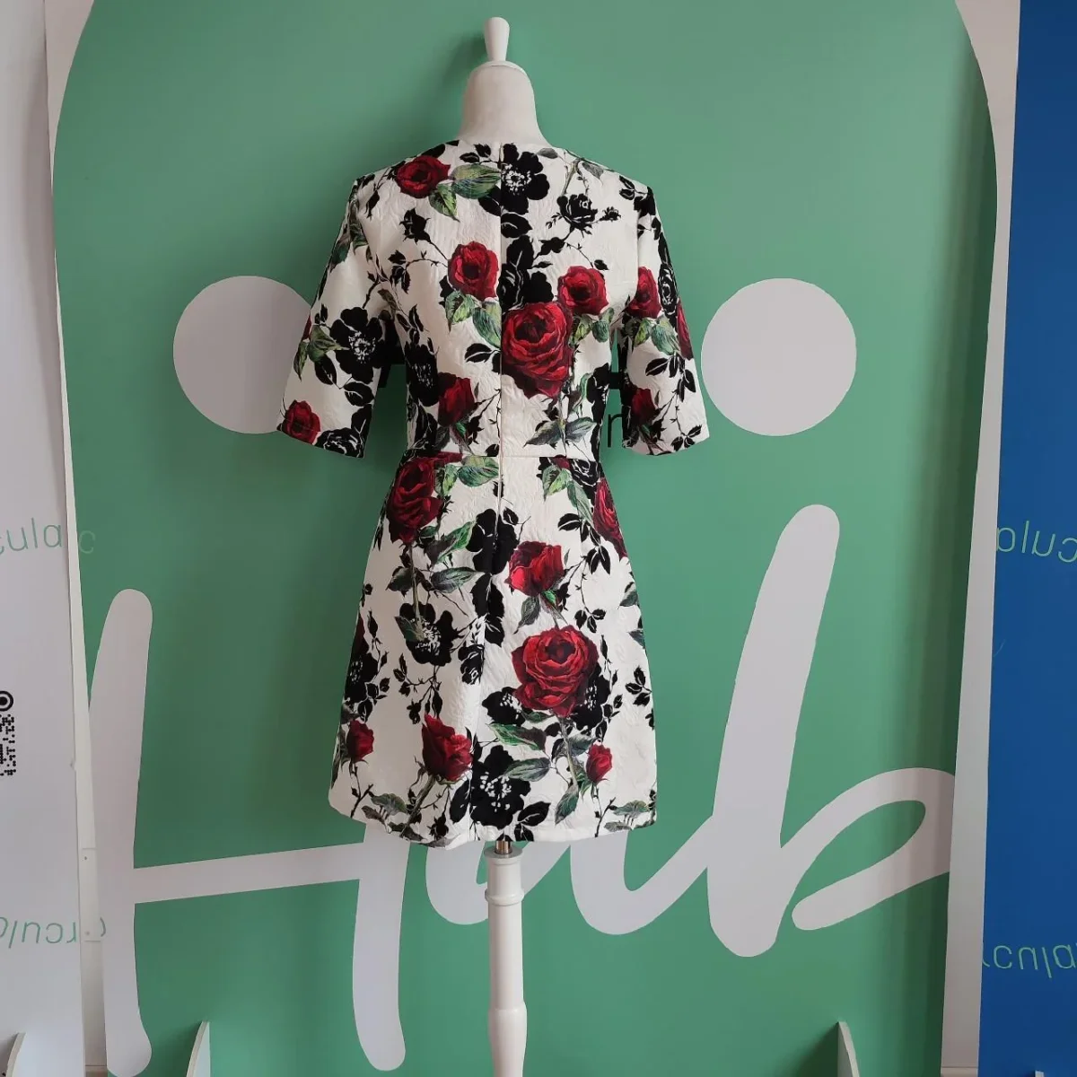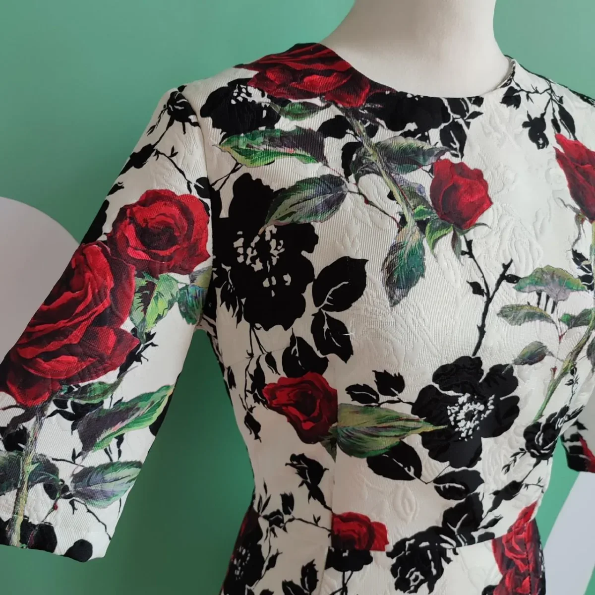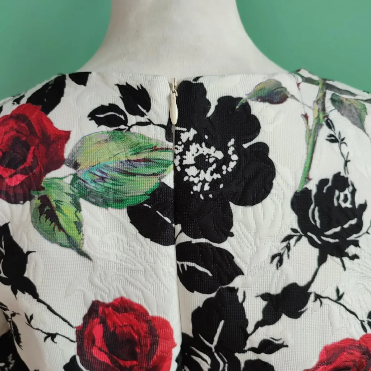 Abito con scollo rotondo e maniche sopra al gomito. La forma è leggermente a clessidra, che meglio valorizza il girovita. 100% Poliestere. Tg. S. Colore fantasia floreale con Rose Rosse estremamente realistiche, Rose Nere stilizzate su fondo Bianco, dove anche la leggera lavorazione in rilievo del tessuto, ripropone la regina dei fiori, rendendo questo capo molto romantico ed elegante. Nel retro, al centro, un cerniera di cm. 47 agevola l’indosso. Buone condizioni.