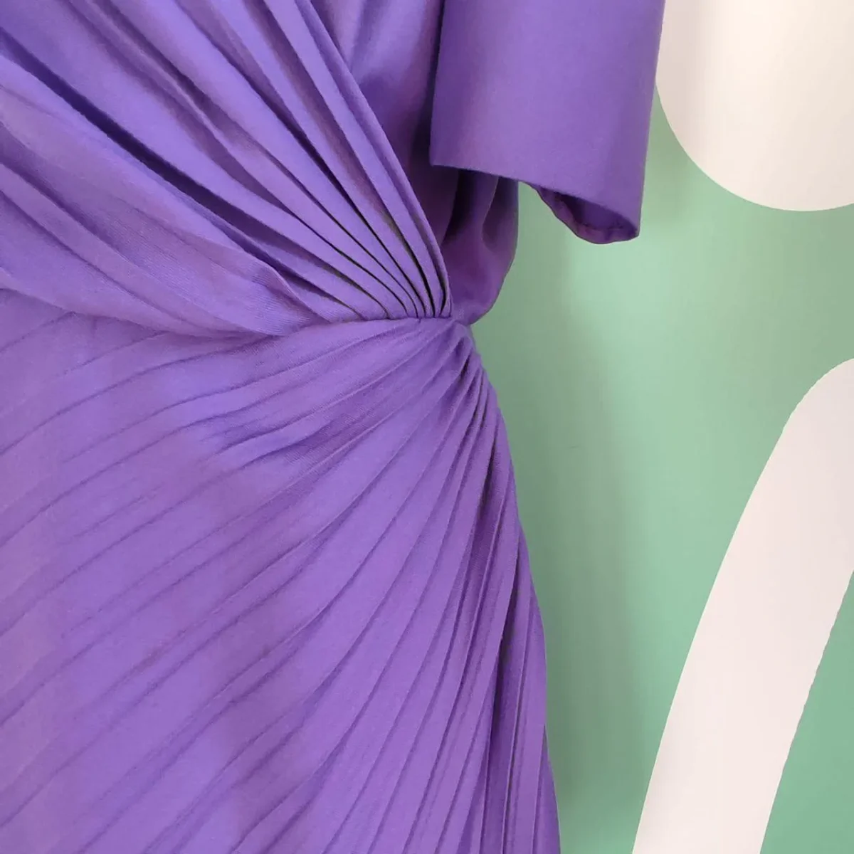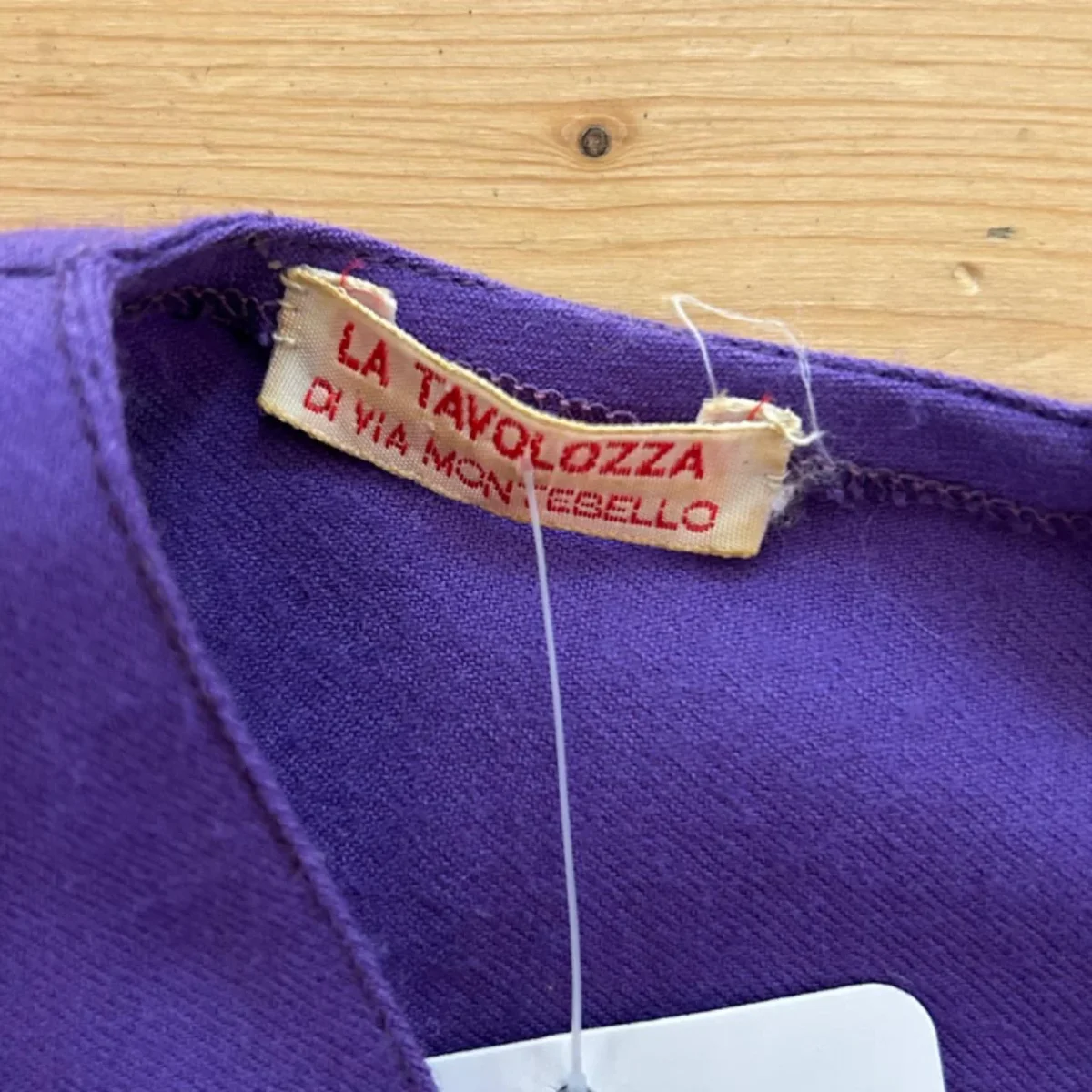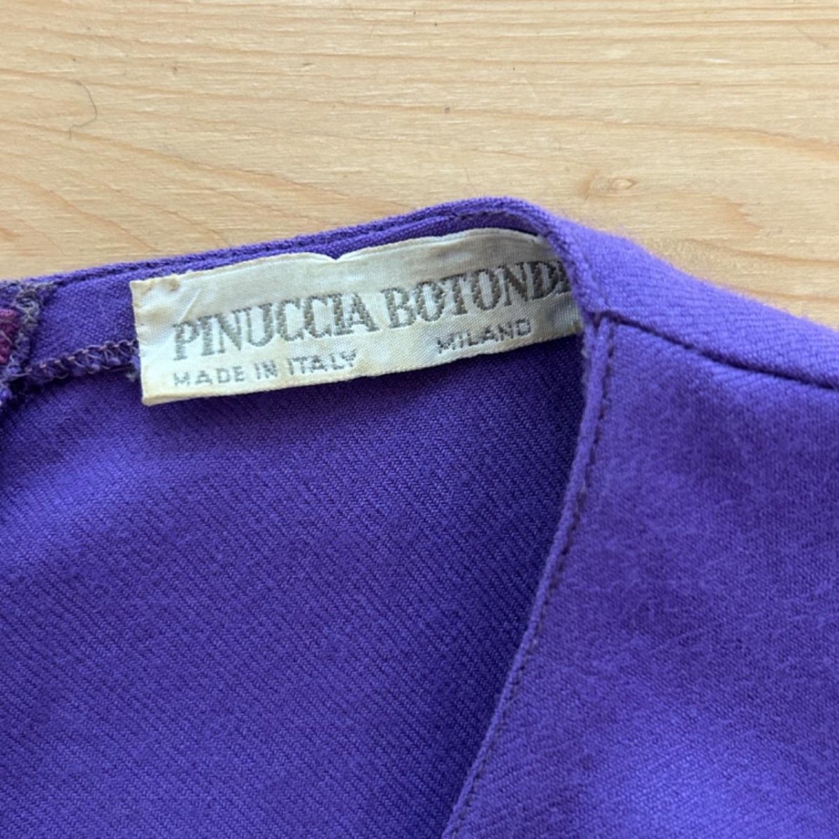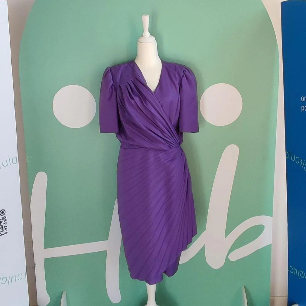 Abito di colore viola, la taglia purtroppo non è presenta ma alla vista si direbbe una M, marca Pinuccia Botondi. Il capo è in ottime condizioni, senza dei particolari difetti, se non per qualche piccolo segno di usura che può essere visto per esempio sulle etichette. Presenta delle pieghe su tutto l’abito, che conferiscono un bel movimento al tessuto accentuando la zona della vita. Dietro è presente una piccola cerniera. La composizione del tessuto non è presente, ma l’abito è sicuramente in cotone, mentre la fodera interna della gonna è quasi sicuramente in poliestere.