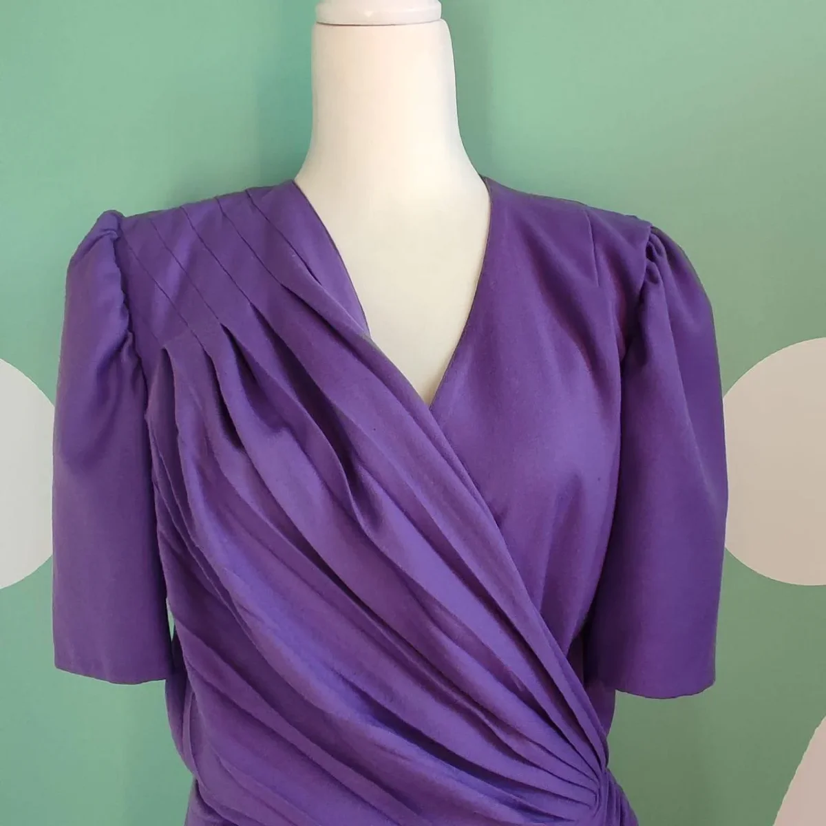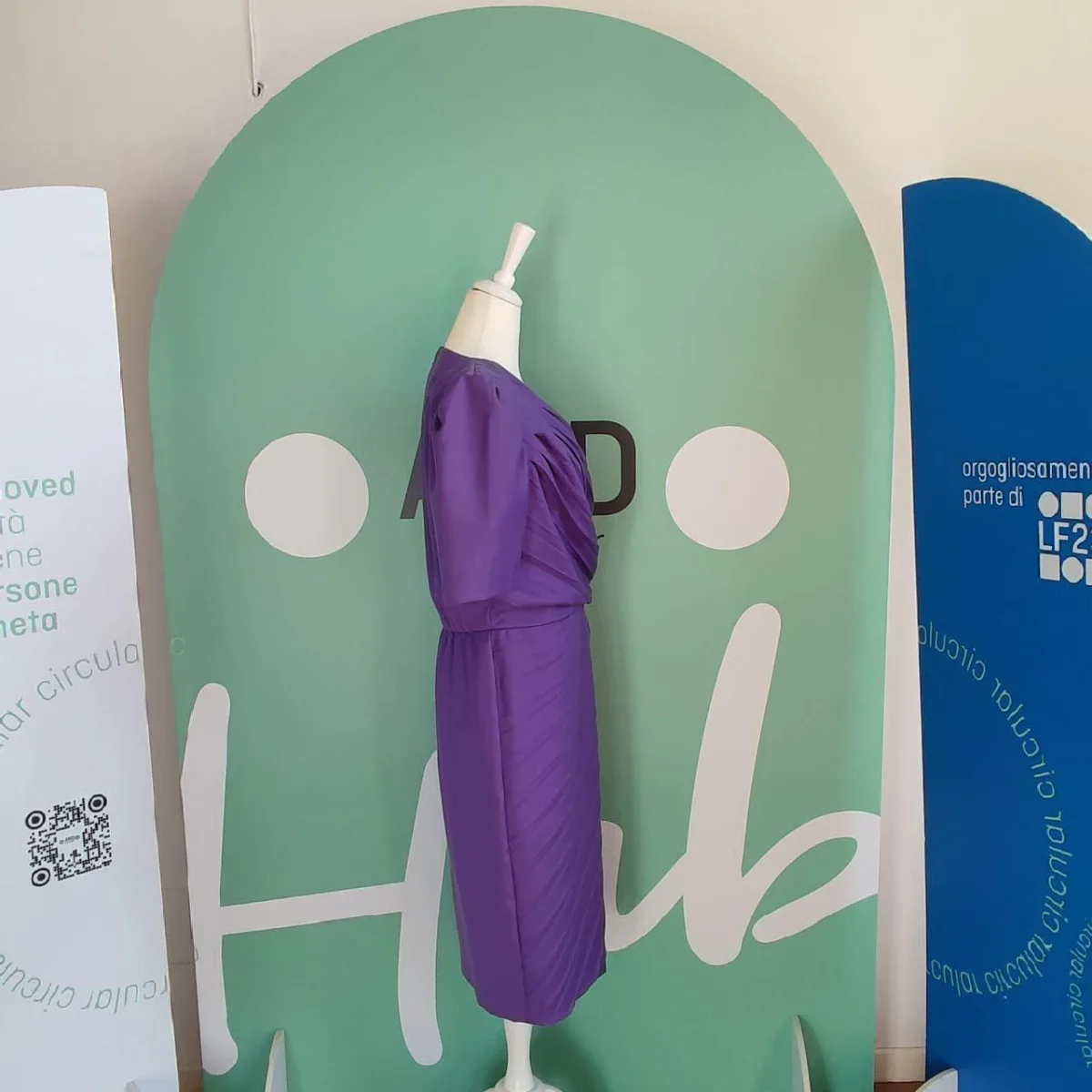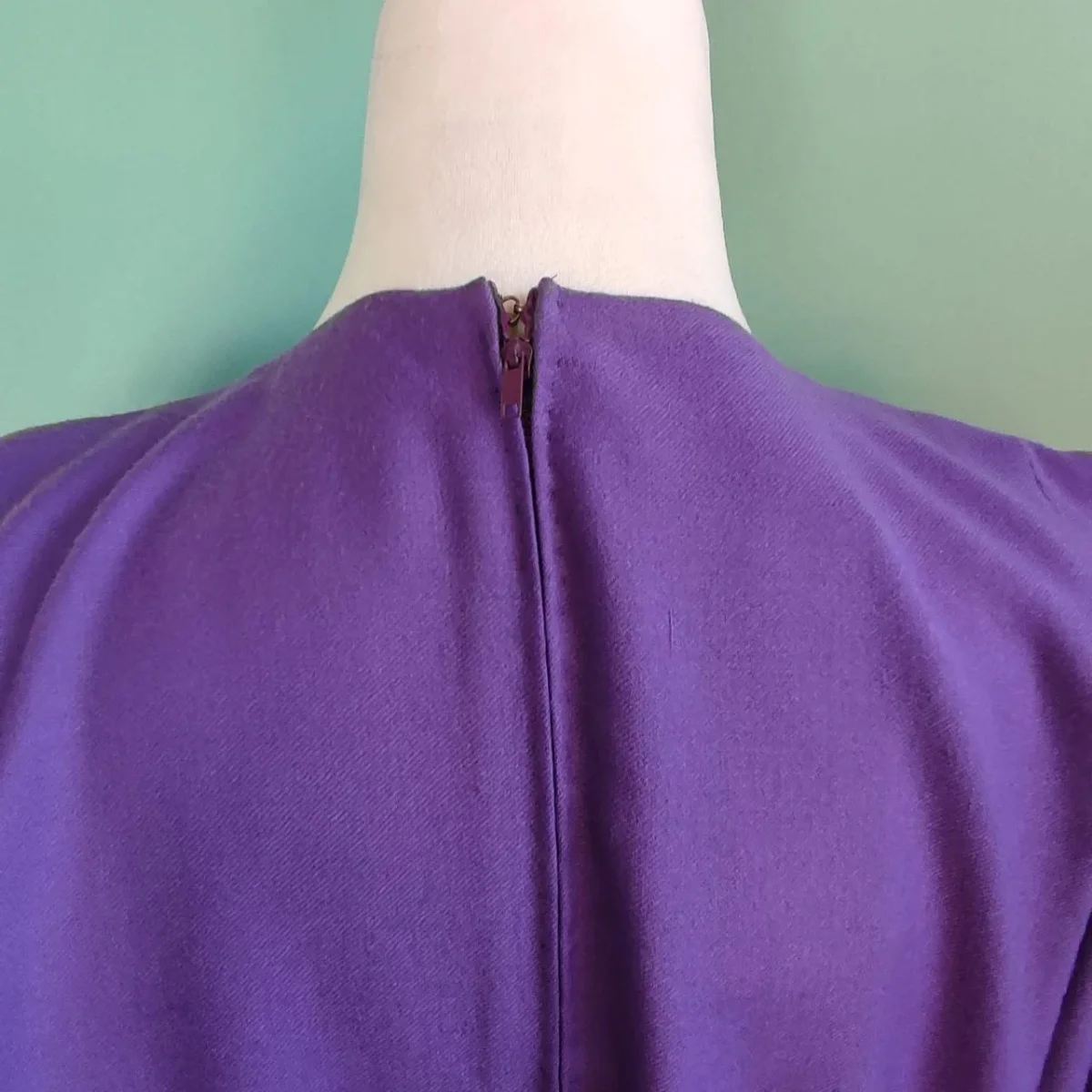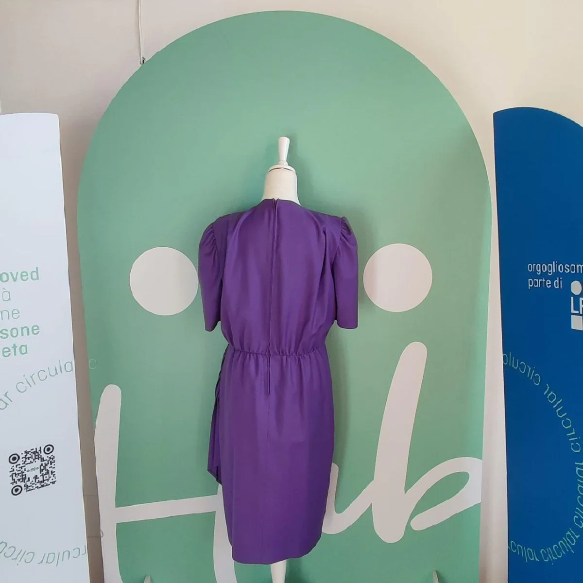 Abito di colore viola, la taglia purtroppo non è presenta ma alla vista si direbbe una M, marca Pinuccia Botondi. Il capo è in ottime condizioni, senza dei particolari difetti, se non per qualche piccolo segno di usura che può essere visto per esempio sulle etichette. Presenta delle pieghe su tutto l’abito, che conferiscono un bel movimento al tessuto accentuando la zona della vita. Dietro è presente una piccola cerniera. La composizione del tessuto non è presente, ma l’abito è sicuramente in cotone, mentre la fodera interna della gonna è quasi sicuramente in poliestere.
