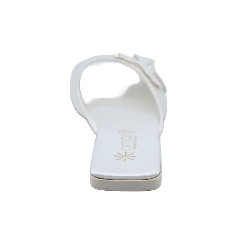 Realizzate con tomaia a fascia singola in raso bianco, le ciabatte da sposa Alice sono impreziosite dal fiocco di perle e strass applicato.