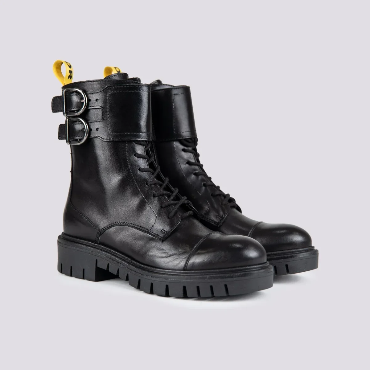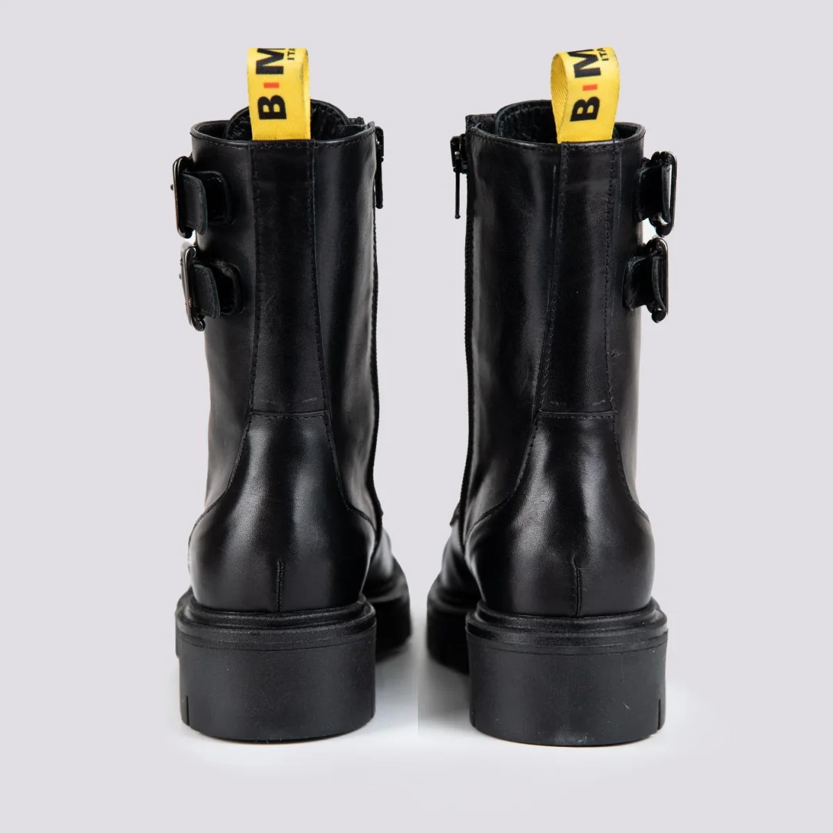 Anfibio nero in morbida pelle nappa con doppia fibbia alla caviglia regolabile a seconda delle preferenze. Zip laterale sulla parte interna e allacciatura lungo tutto il collo del piede. Altezza para: 3.5 cm. Cuciture in tonalità. Calzata regolare. Tomaia e fodera in vera pelle. Suola in gomma. Tiretto in tessuto giallo con logo BiMOR stampato.