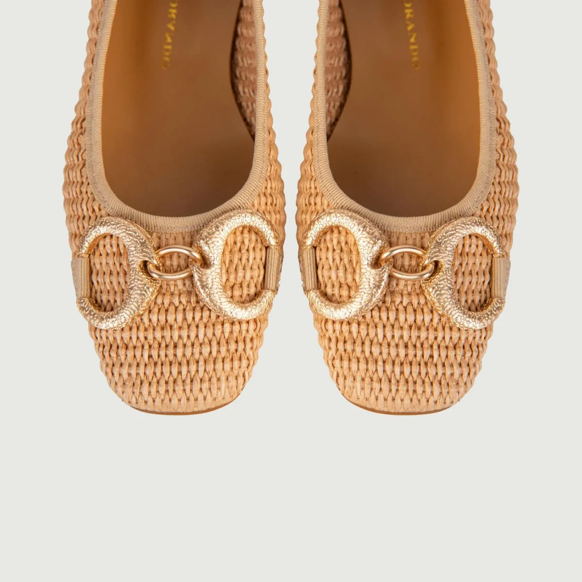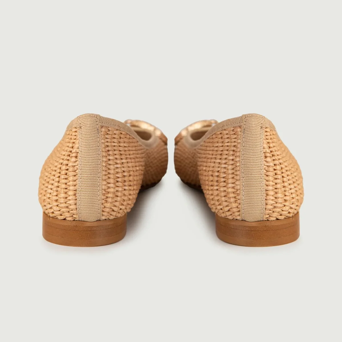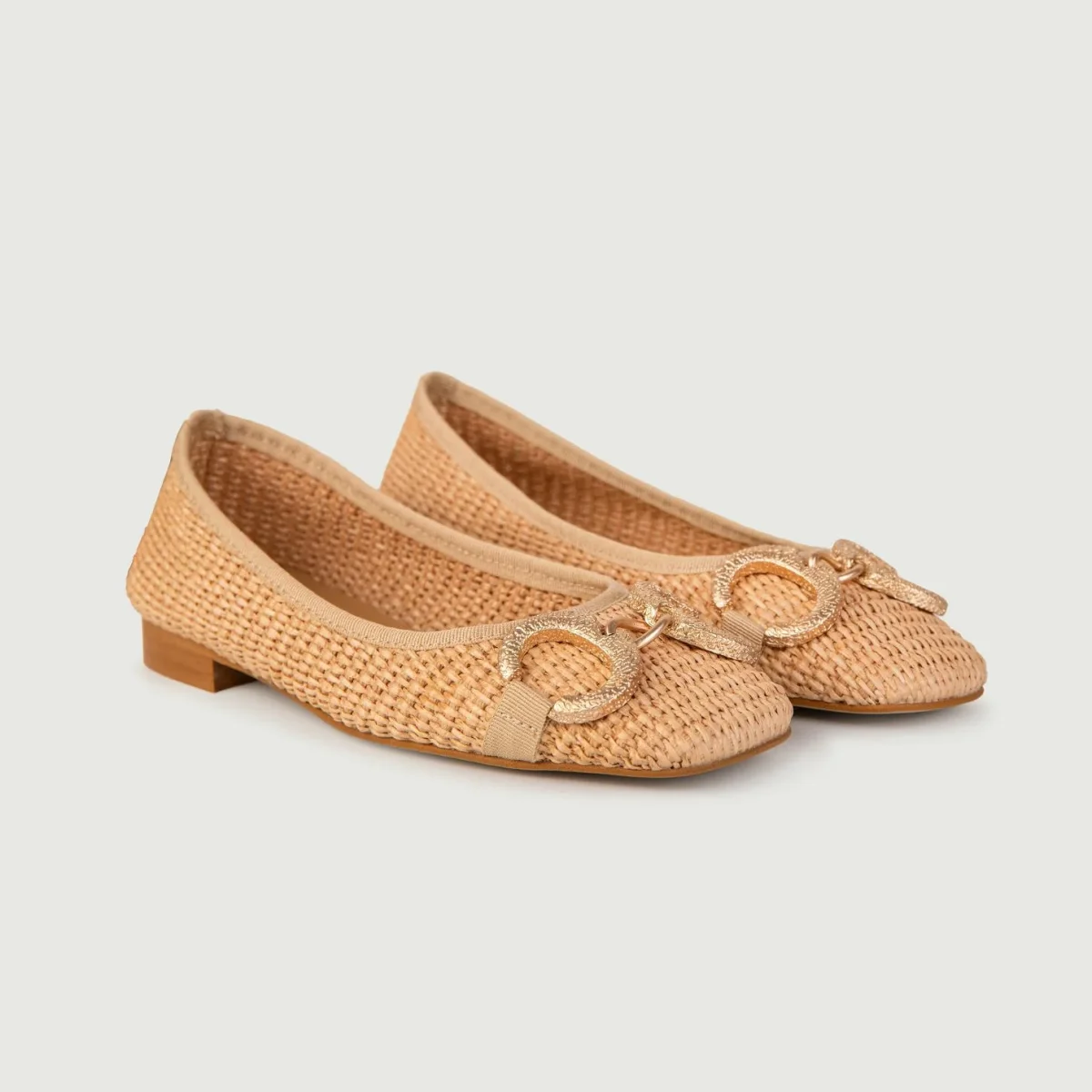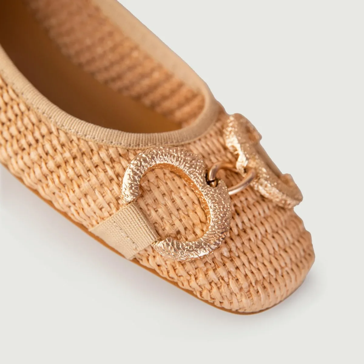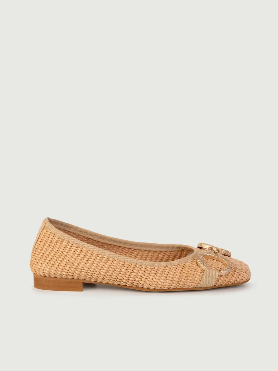 Ballerine in rafia intrecciata naturale con fibbia frontale doppio anello in metallo dorato.