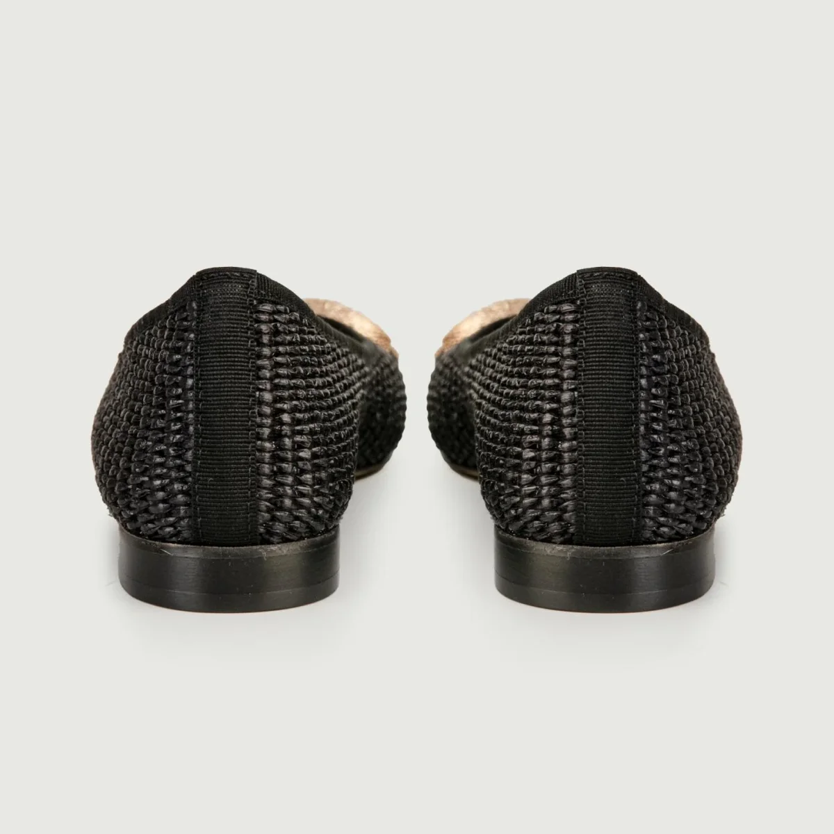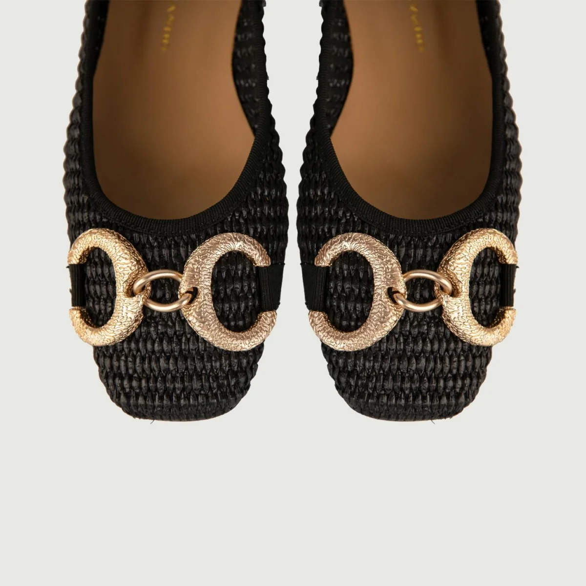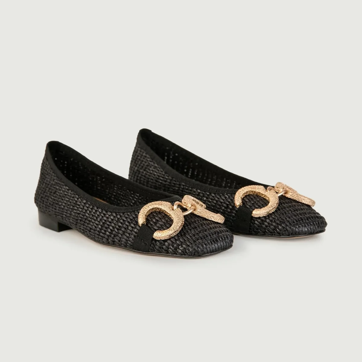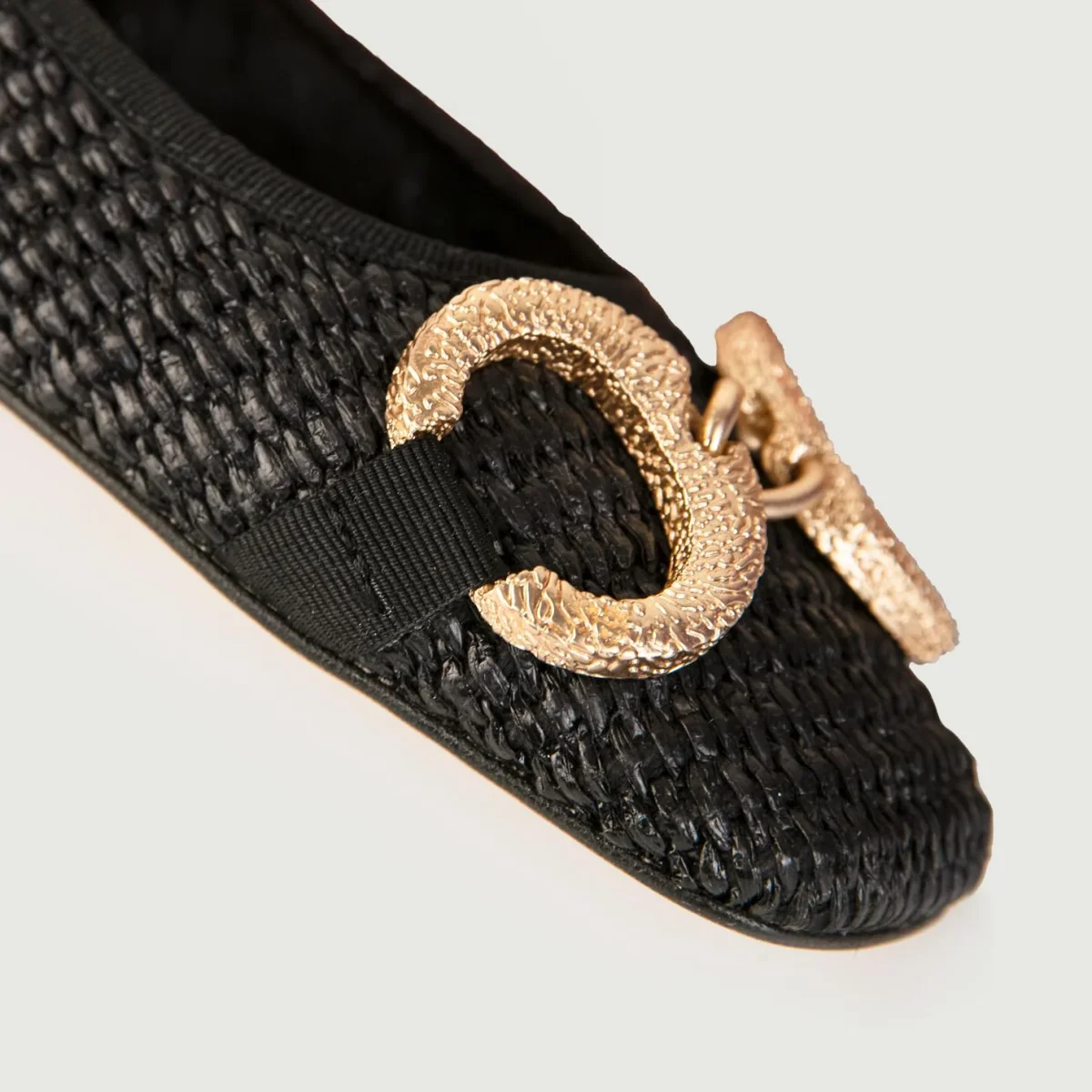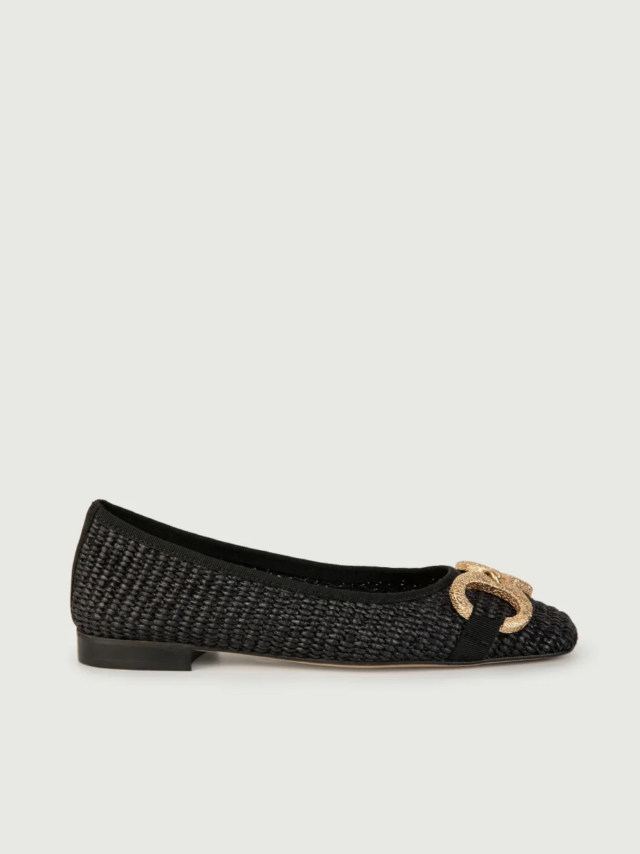 Ballerine in rafia intrecciata nera con fibbia frontale doppio anello in metallo dorato.