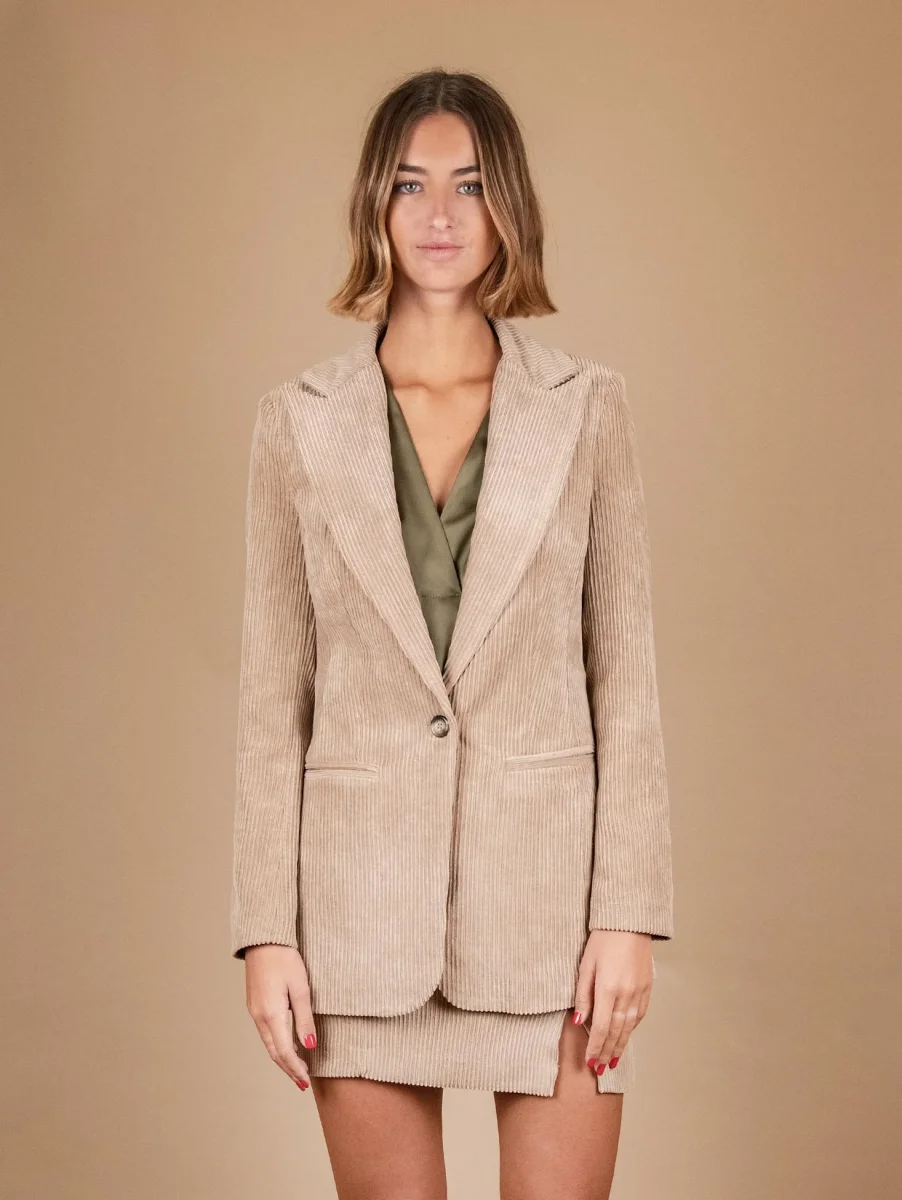 Blazer doppiopetto in lino beige.