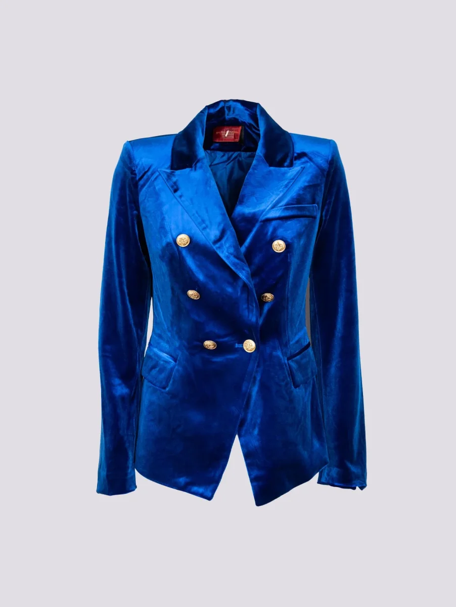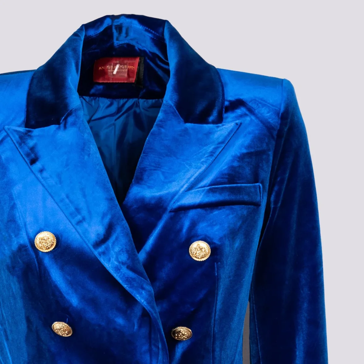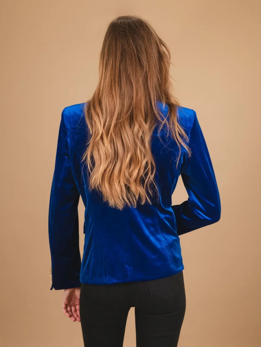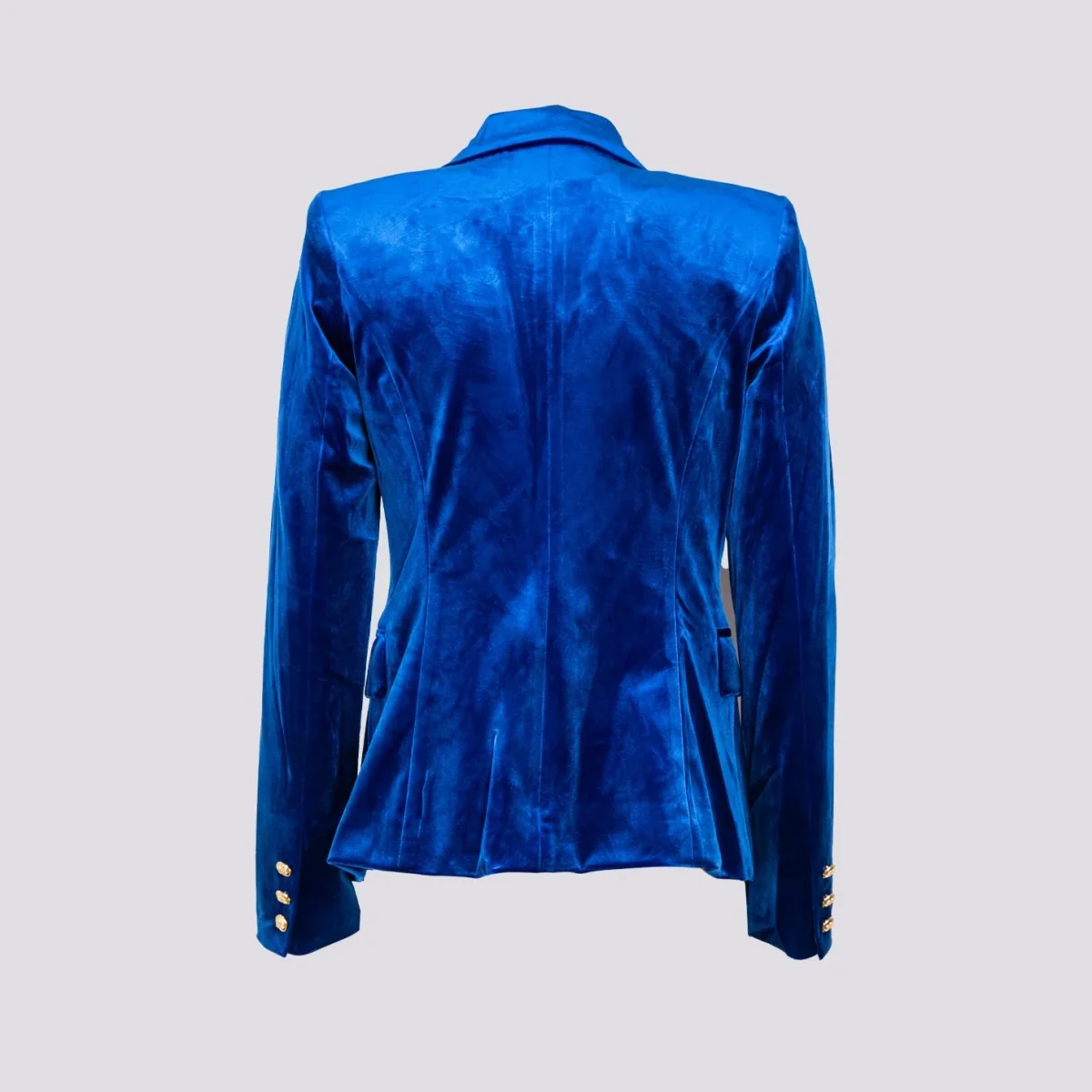 Blazer doppiopetto in velluto blu elettrico. Dettaglio bottoni oro. Le spalle leggermente imbottite rendono la struttura del capo più importante ed elegante. Interno foderato in tessuto nero. Finte tasche applicate su entrambi i lati. Peso medio. Vestibilità regolare con taglie francesi. AM consiglia: il blazer è un capo che non può mancare all’interno dell’armadio di una donna, specie se in carriera. Scegli la variante in velluto per un risultato elegante e business allo stesso tempo.