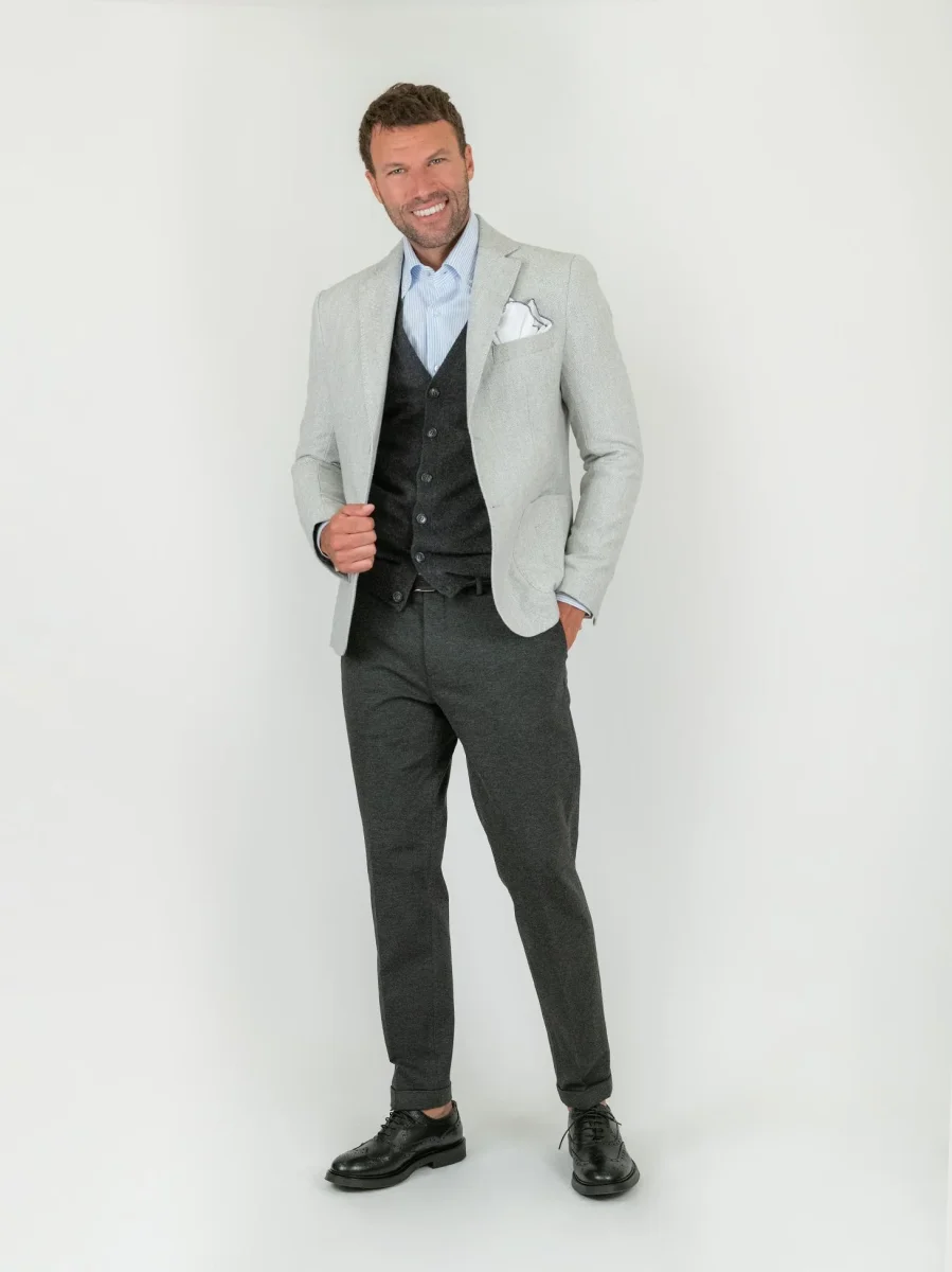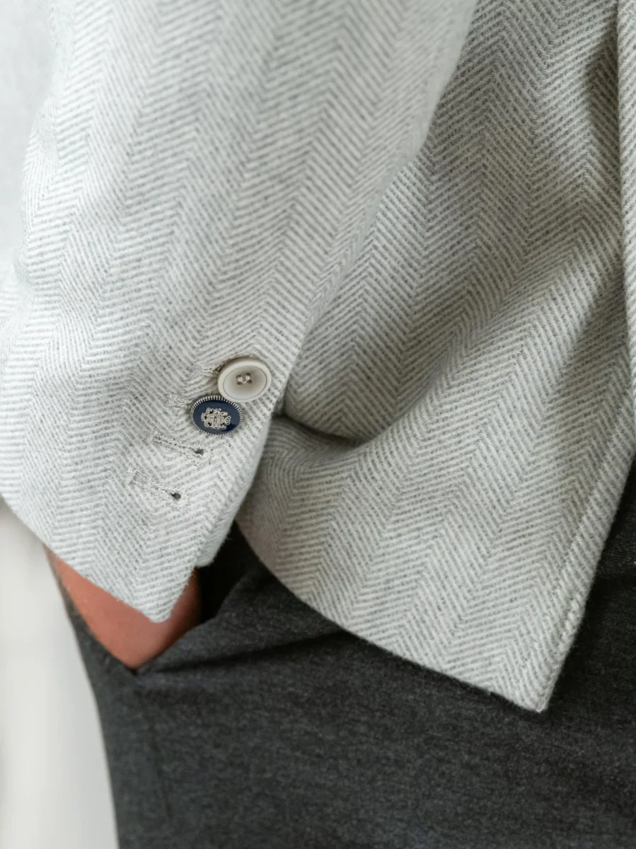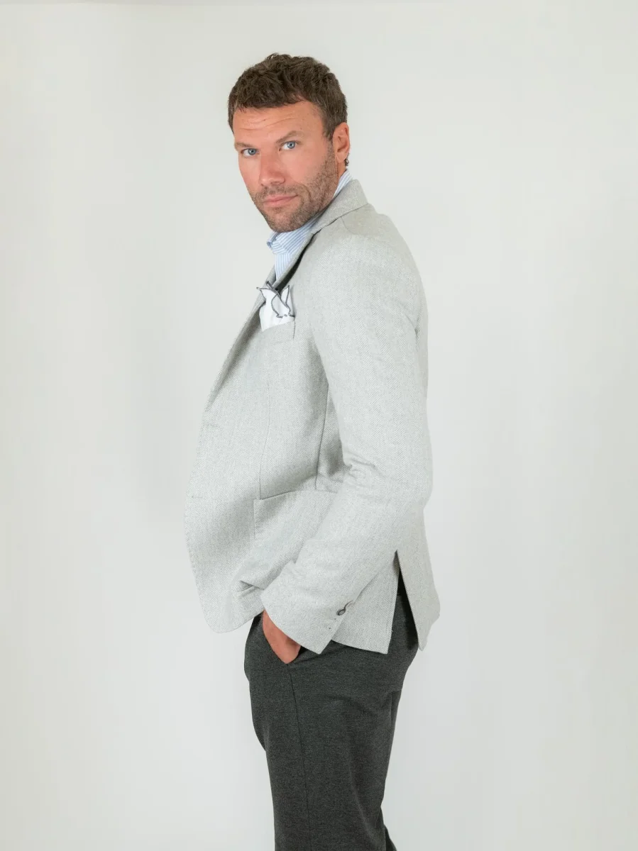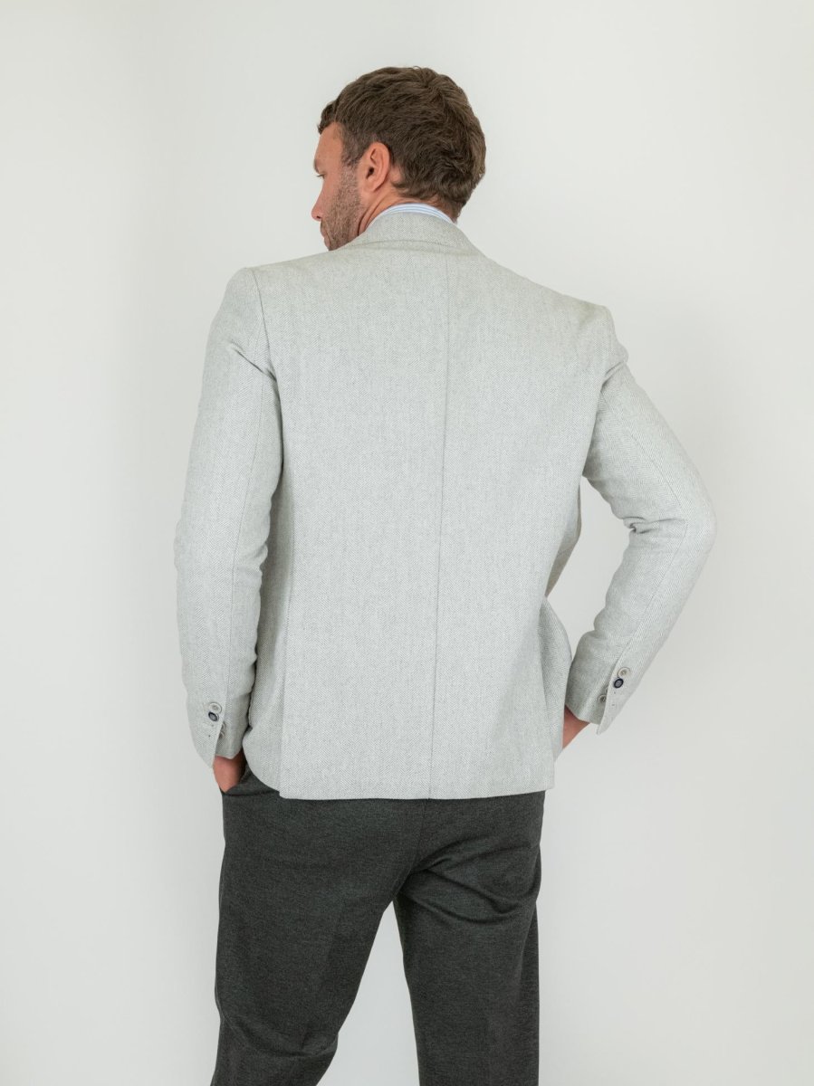 Blazer in tessuto misto lana e cotone spigato grigio chiaro tono su tono.