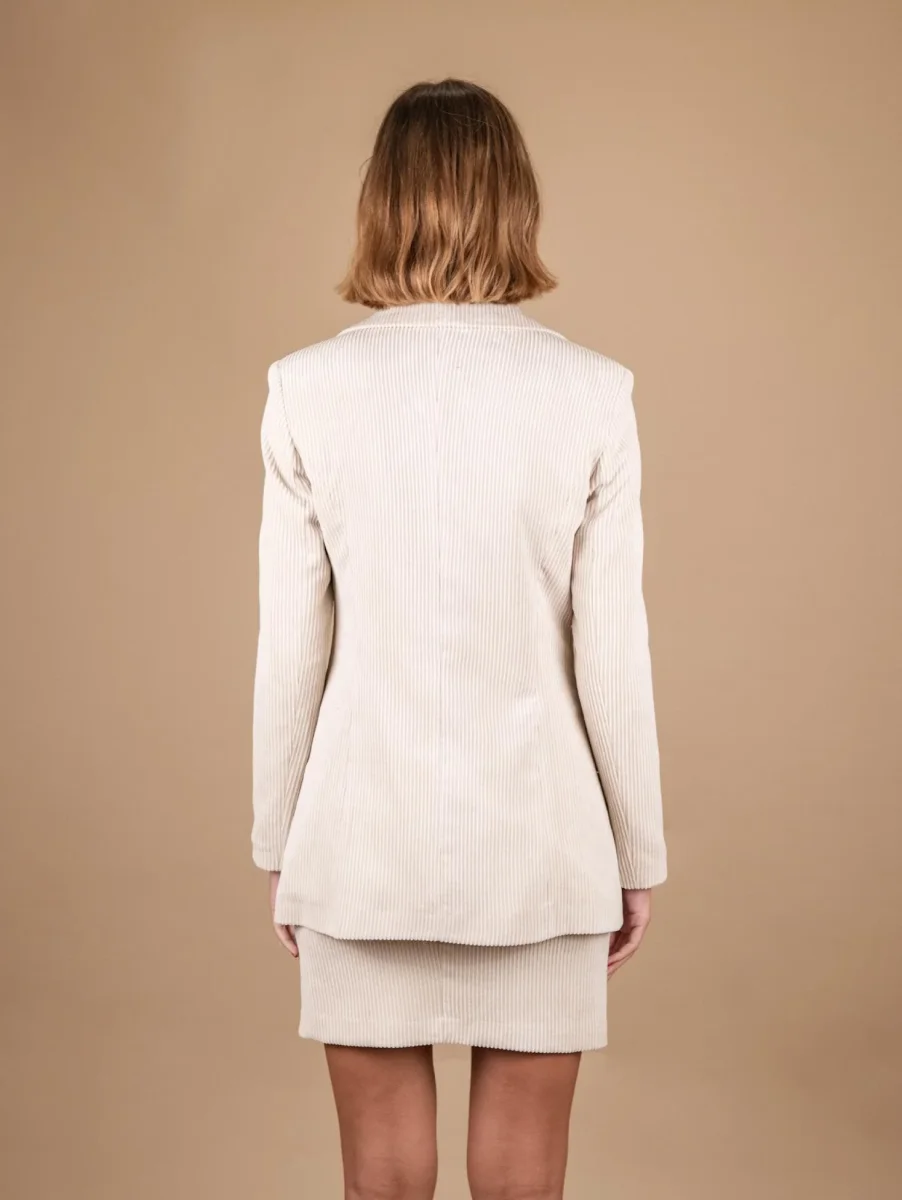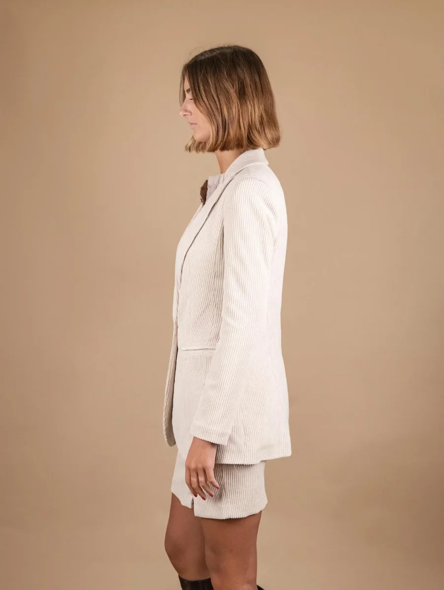 Blazer mopetto in velluto a coste panna. Dettaglio rever a lancia. La spalla leggermente imbottita conferisce al capo un tocco di importanza. Dettaglio costine su tutto il capo. Doppia finta tasca applicata. Vestibilità regolare, aderente sul punto vita e più morbida sui fianchi. Peso medio. Composizione: 100% pl. La modella è alta 1,81 e indossa una 40.