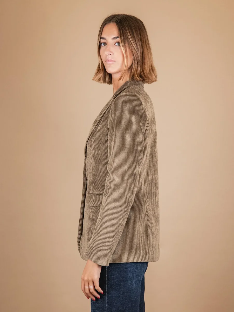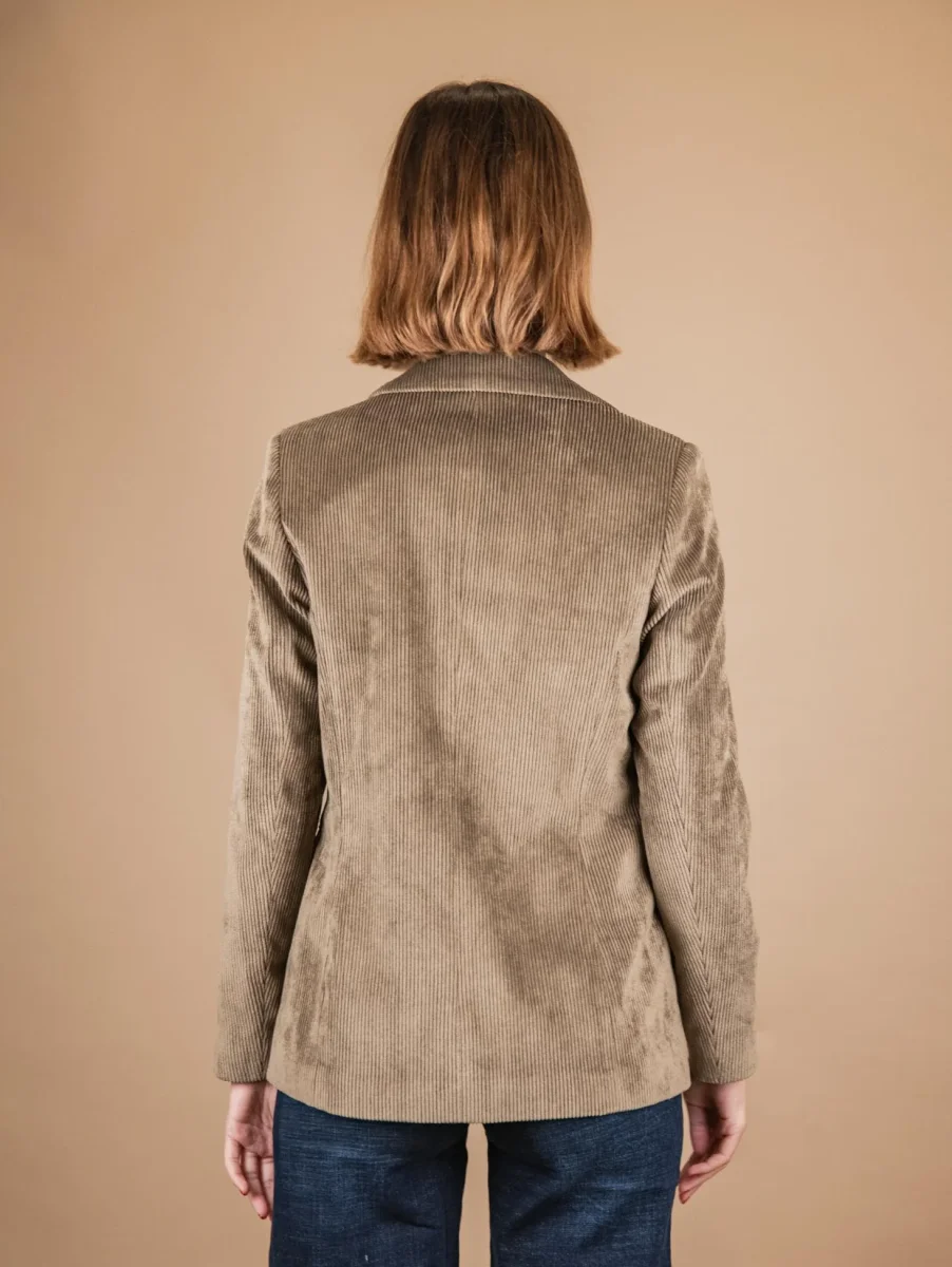 Blazer mopetto in velluto a coste verde salvia. Dettaglio rever a lancia. La spalla leggermente imbottita conferisce al capo un tocco di importanza. Dettaglio coste su tutto il capo. Doppia finta tasca applicata. Vestibilità regolare, aderente sul punto vita e più morbida sui fianchi. Peso medio. Composizione: 56% pl, 12% ny, 2% el. La modella è alta 1,81 e indossa una 40.