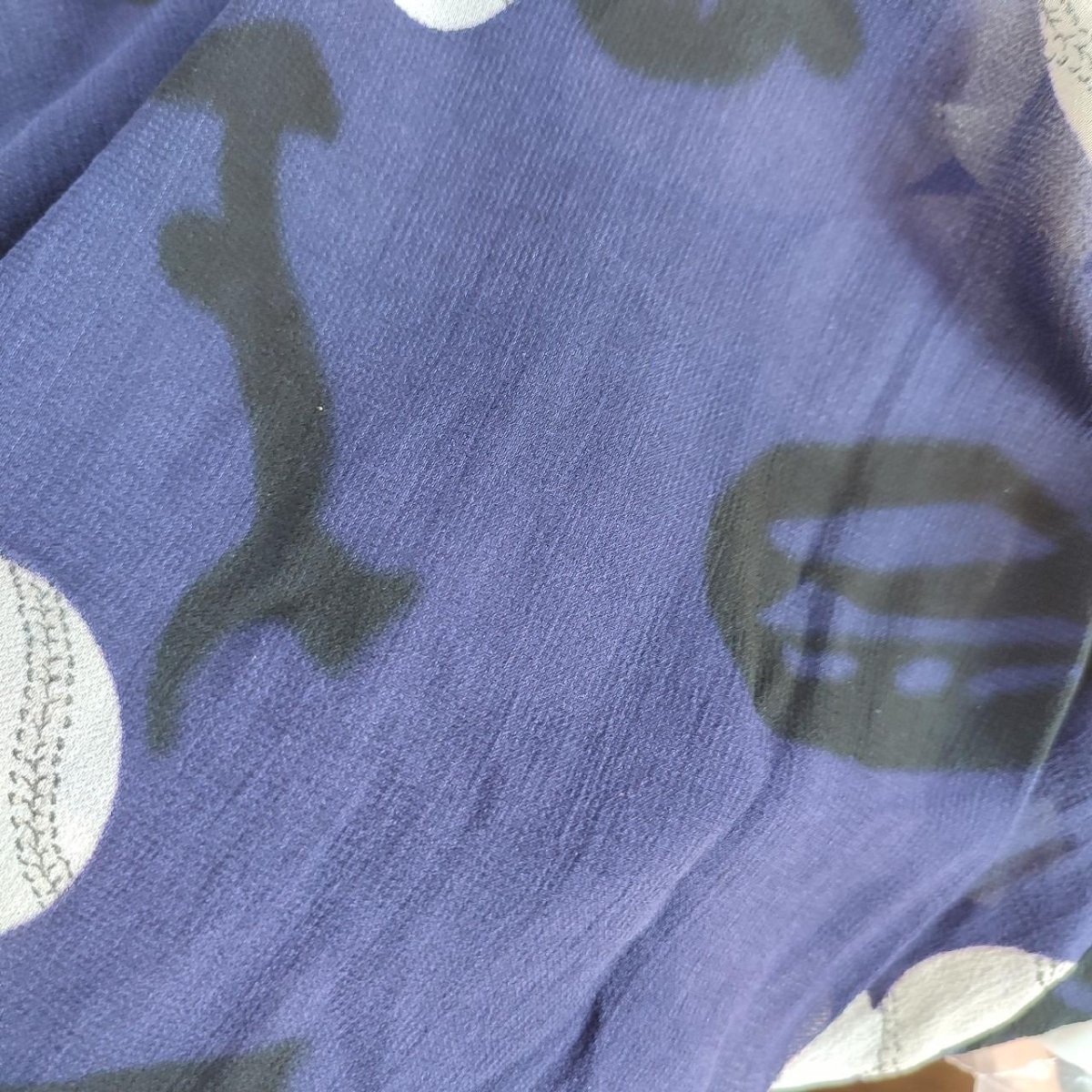 T- shirt viola con fantasie bianche e nere. In buone condizioni. La taglia non è presente, ma a vista sembra essere una M, anche la composizione manca, al tatto sembra essere seta.