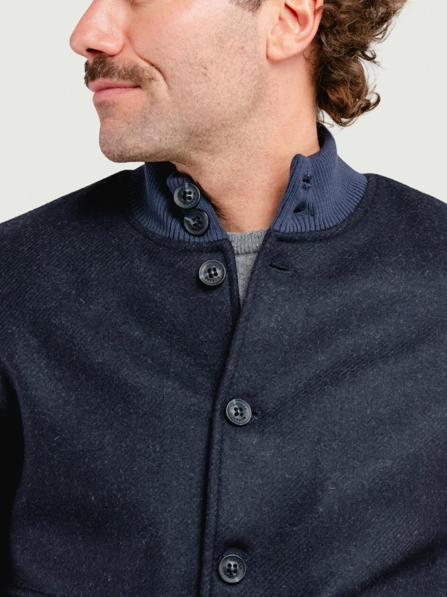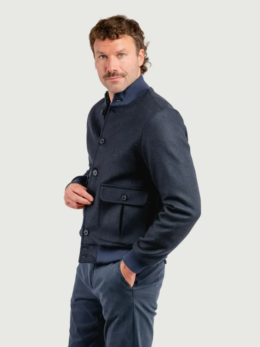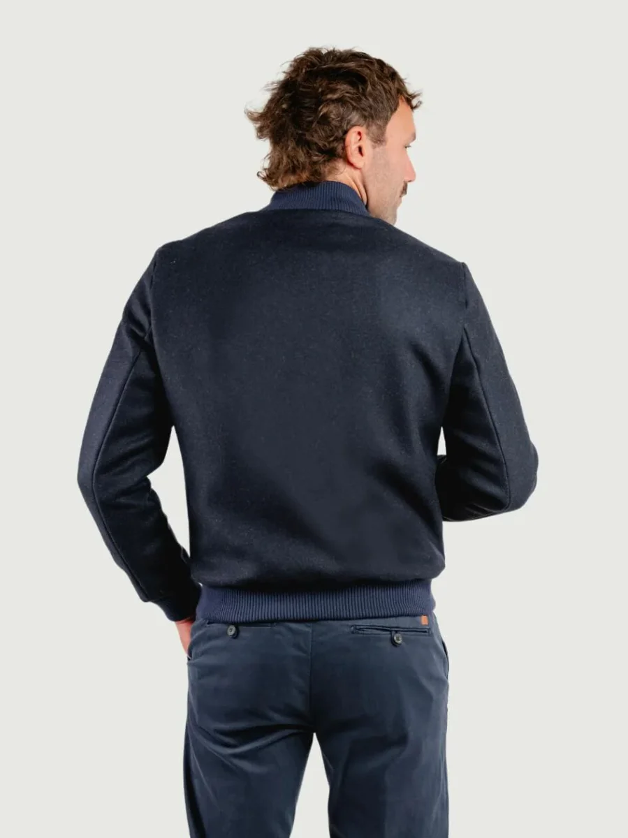 Bomber in lana navy con dettaglio a coste su fondo, polsini e colletto.