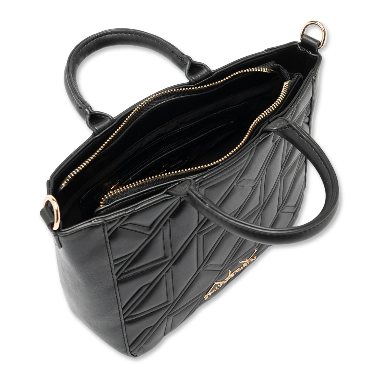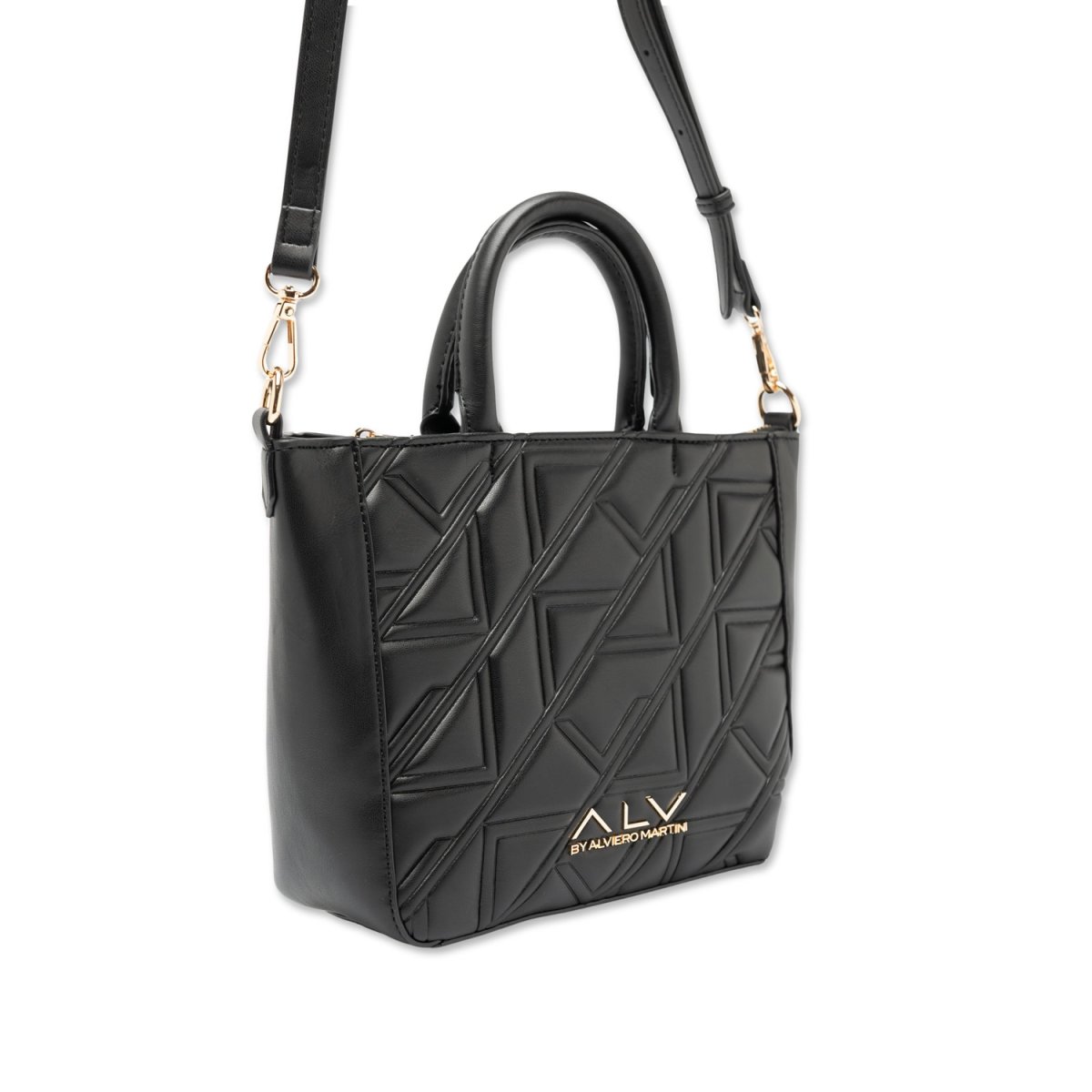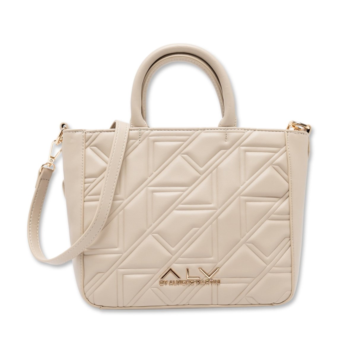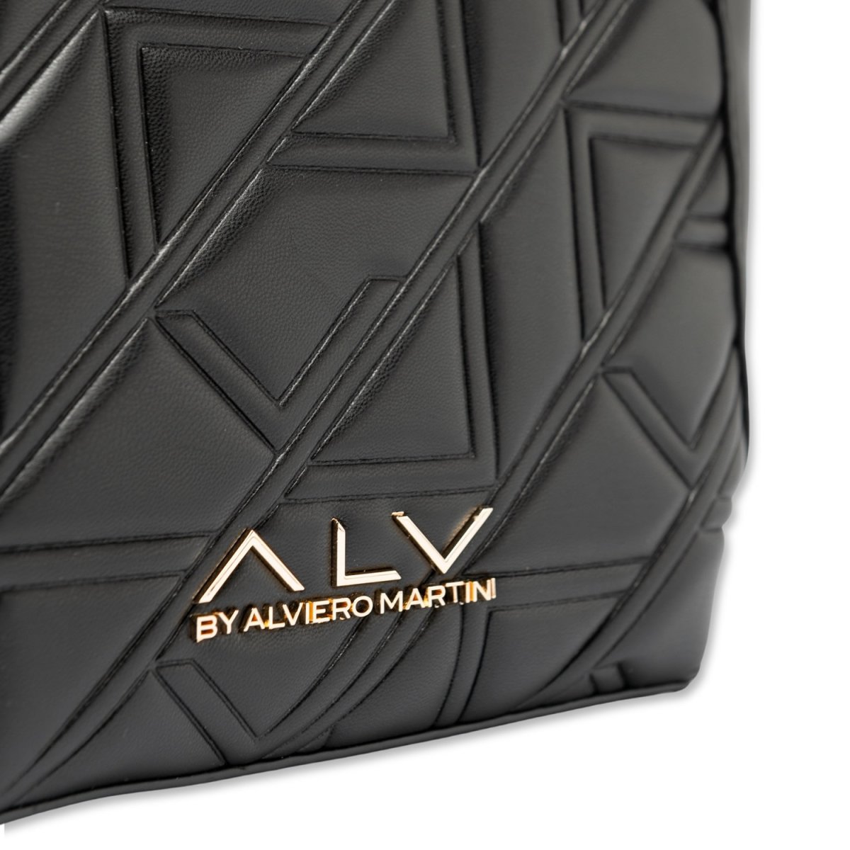 Realizzata con una texture trapuntata dal disegno geometrico in rilievo, si distingue per l’inconfondibile logo ALV in metallo dorato applicato sul fronte, simbolo di classe e originalità.