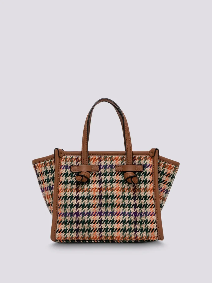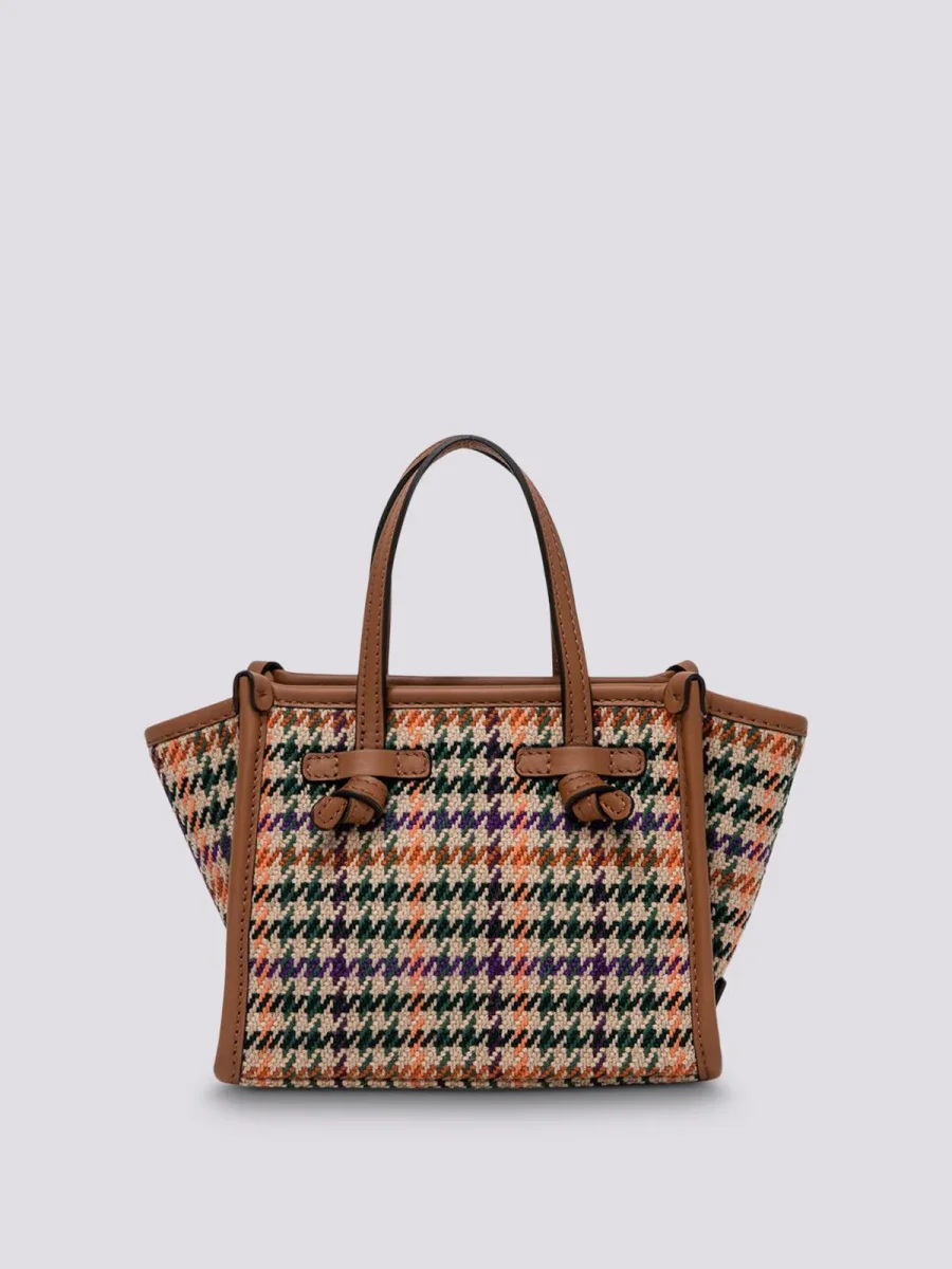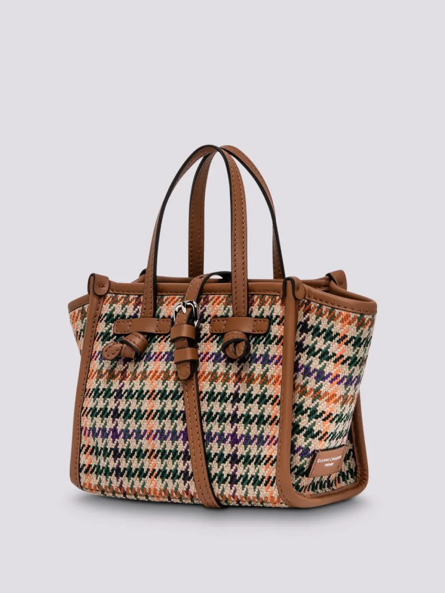 Borsa a mano Miss Marcella in tessuto Pied de Poule con profili e manici in pelle a contrasto. Chiusura con zip in testa. Portabilità a mano o crossbody, grazie alla tracolla di servizio in pelle di cui è corredata.