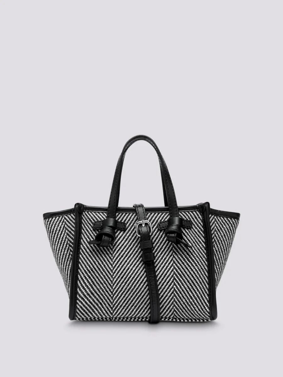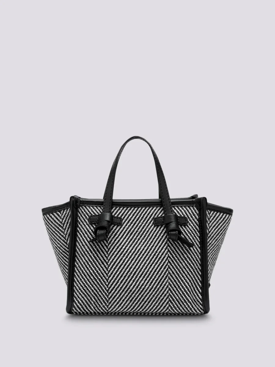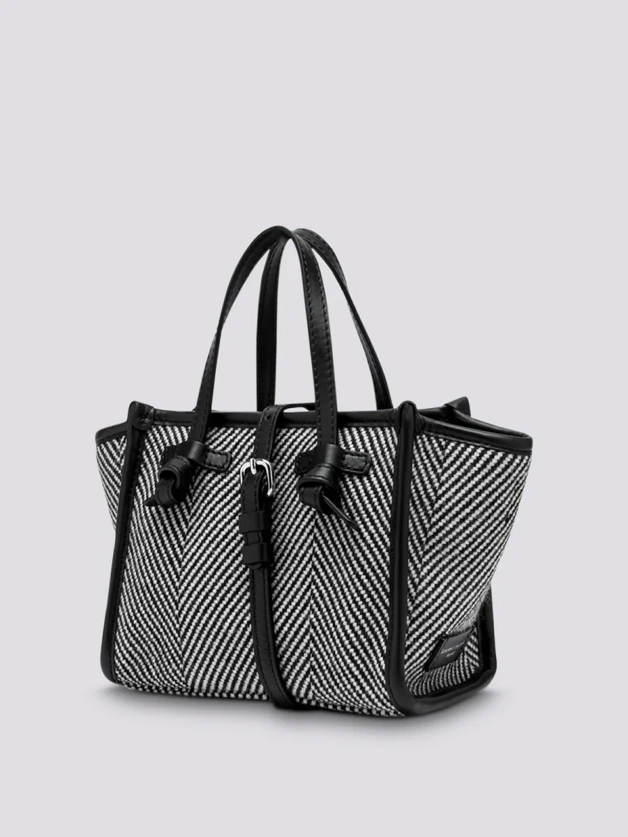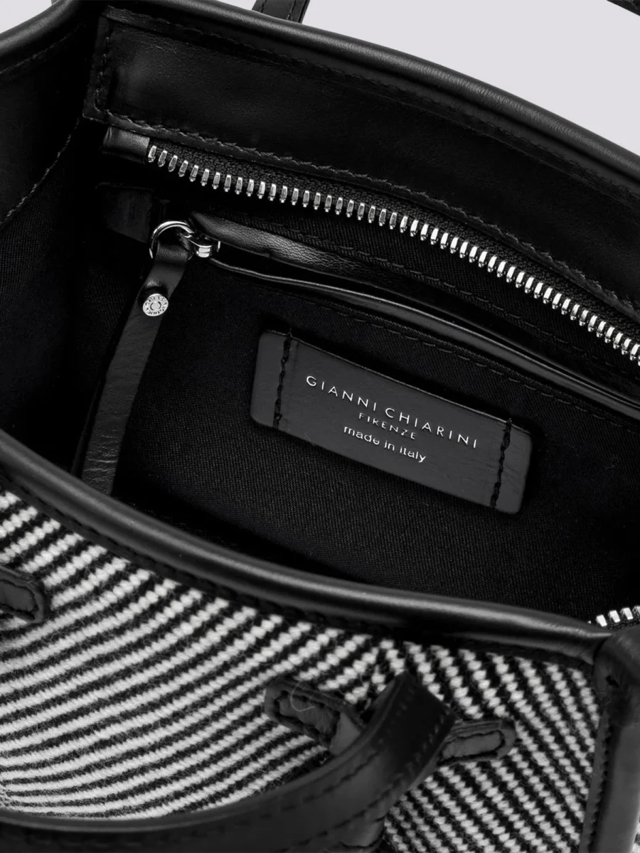 Borsa a mano Miss Marcella in tessuto spigato bicolore con profili e manici in pelle a contrasto. Chiusura con zip in testa. Portabilità a mano o crossbody, grazie alla tracolla di servizio in pelle di cui è corredata.