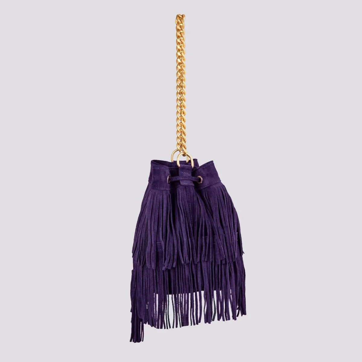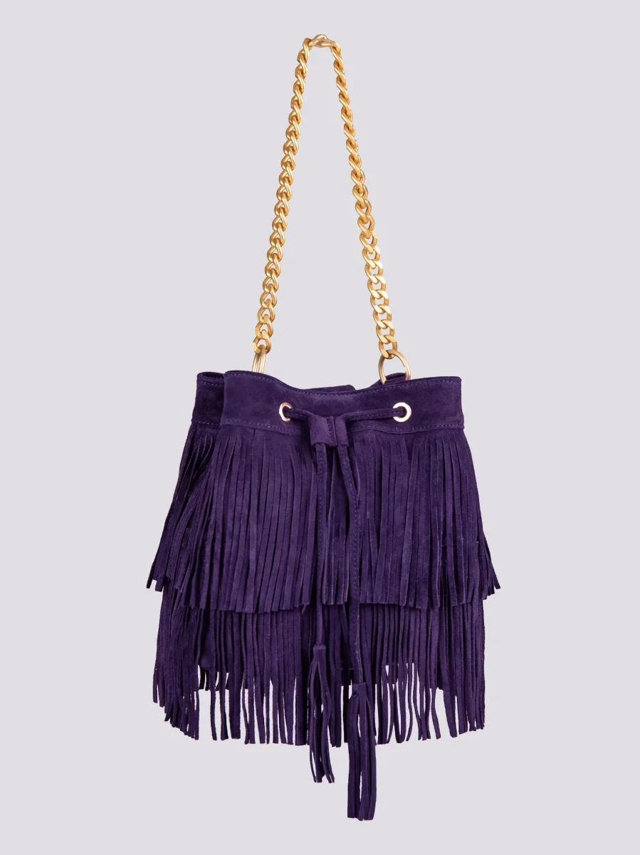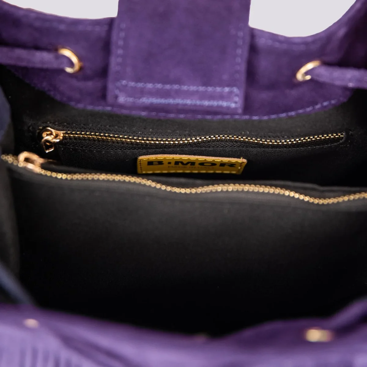 Borsa a secchiello con frange in camoscio viola WILD, un accessorio sportivo e grintoso allo stesso tempo. Disponibile in più varianti colore, questa BiMOR può essere indossata a spalla con l’apposito manicotto in catena o a tracolla con la tracolla aggiuntiva in cotone rigenerato che presenta il logo BiMOR stampato in tonalità. L’interno della borsa presenta due scompartimenti profondi separati una tasca con chiusura a zip in metallo e un taschino porta cellulare. Fodera interna nera.