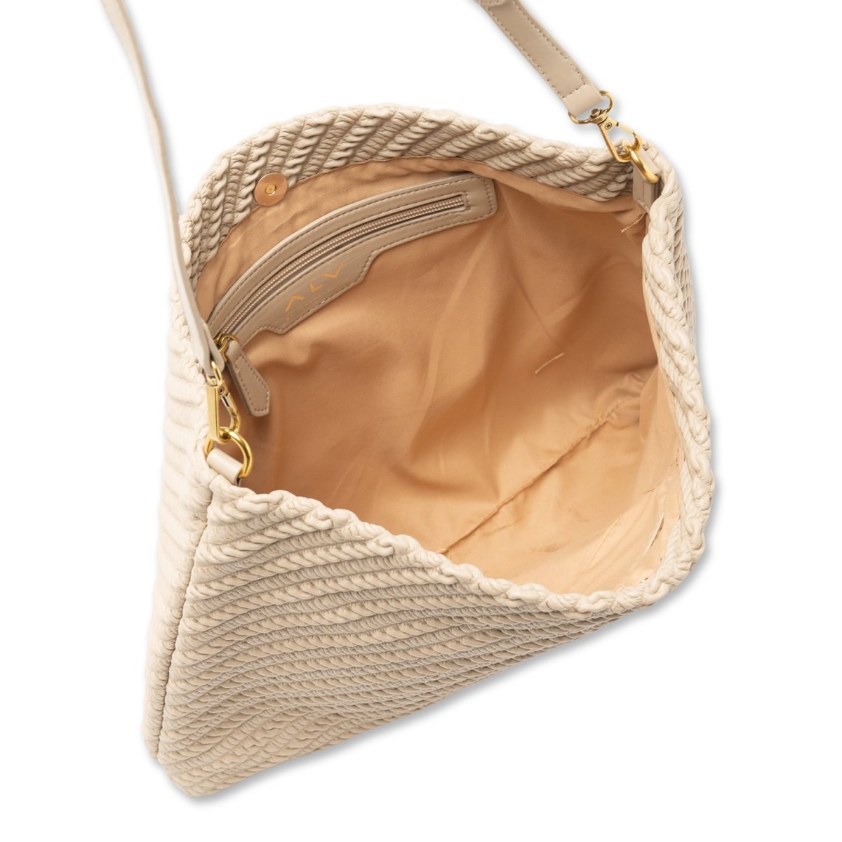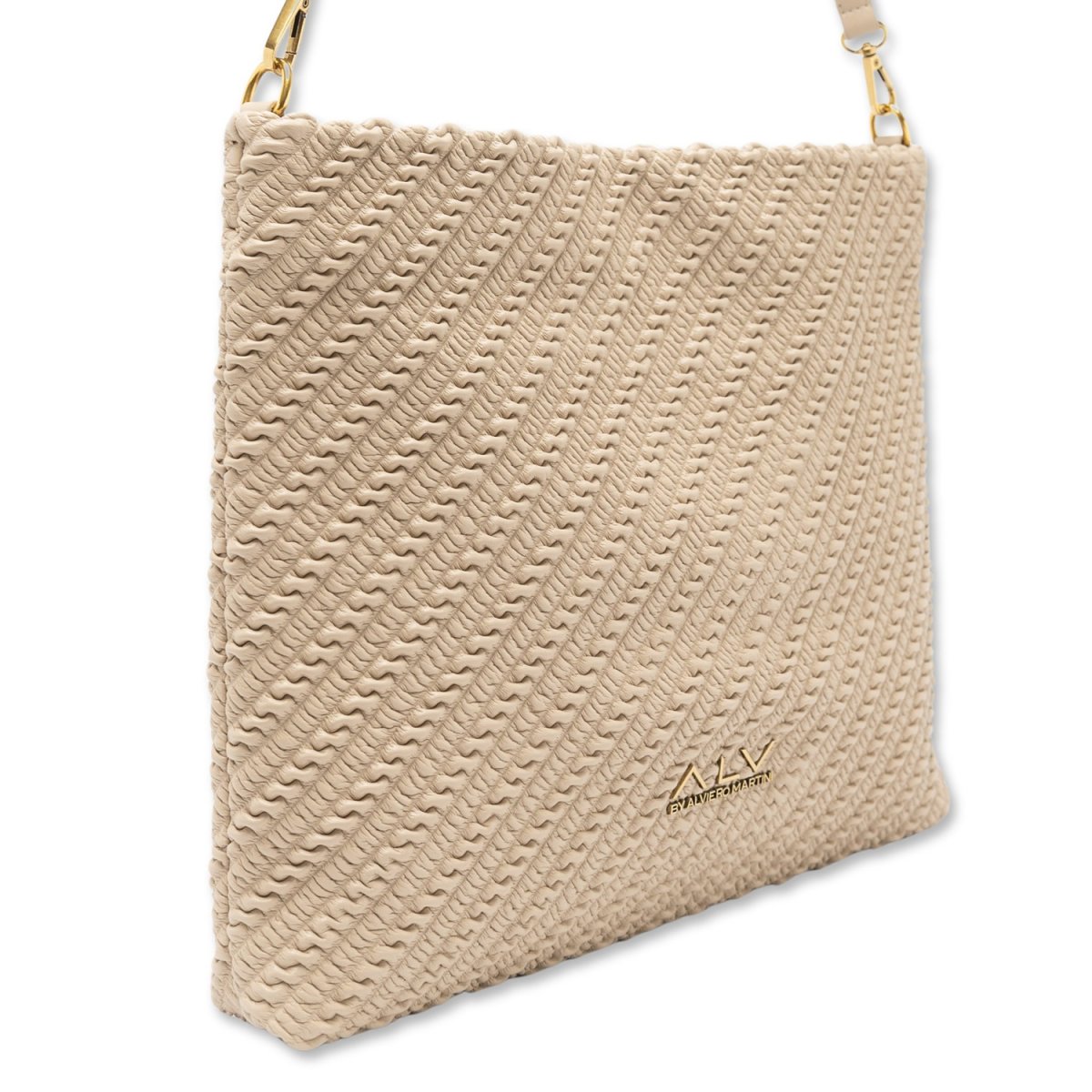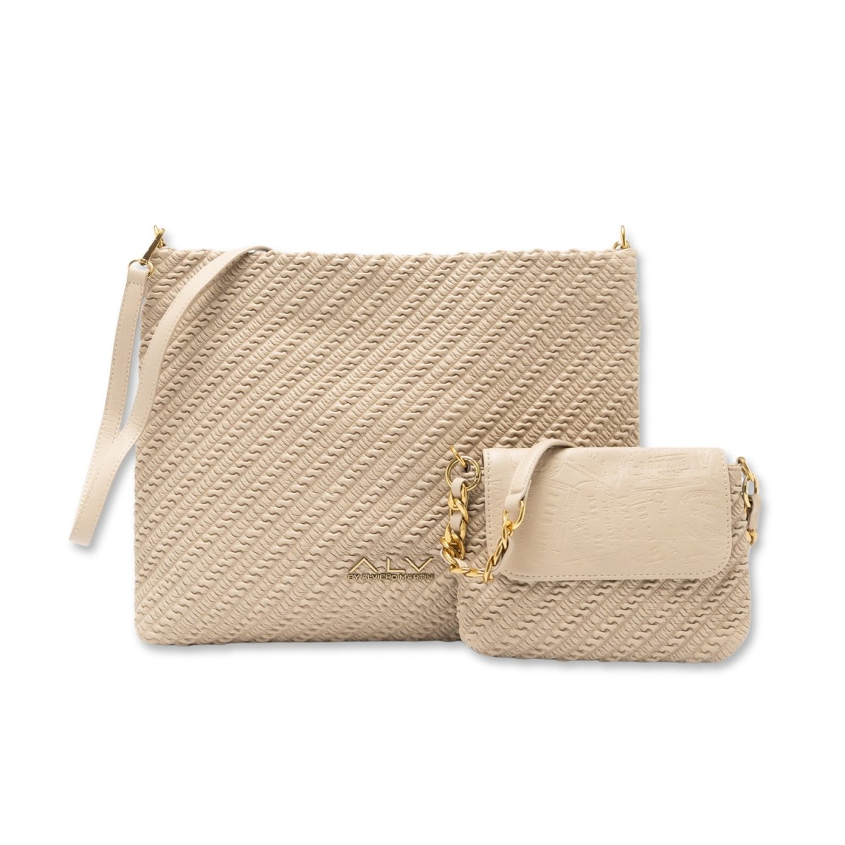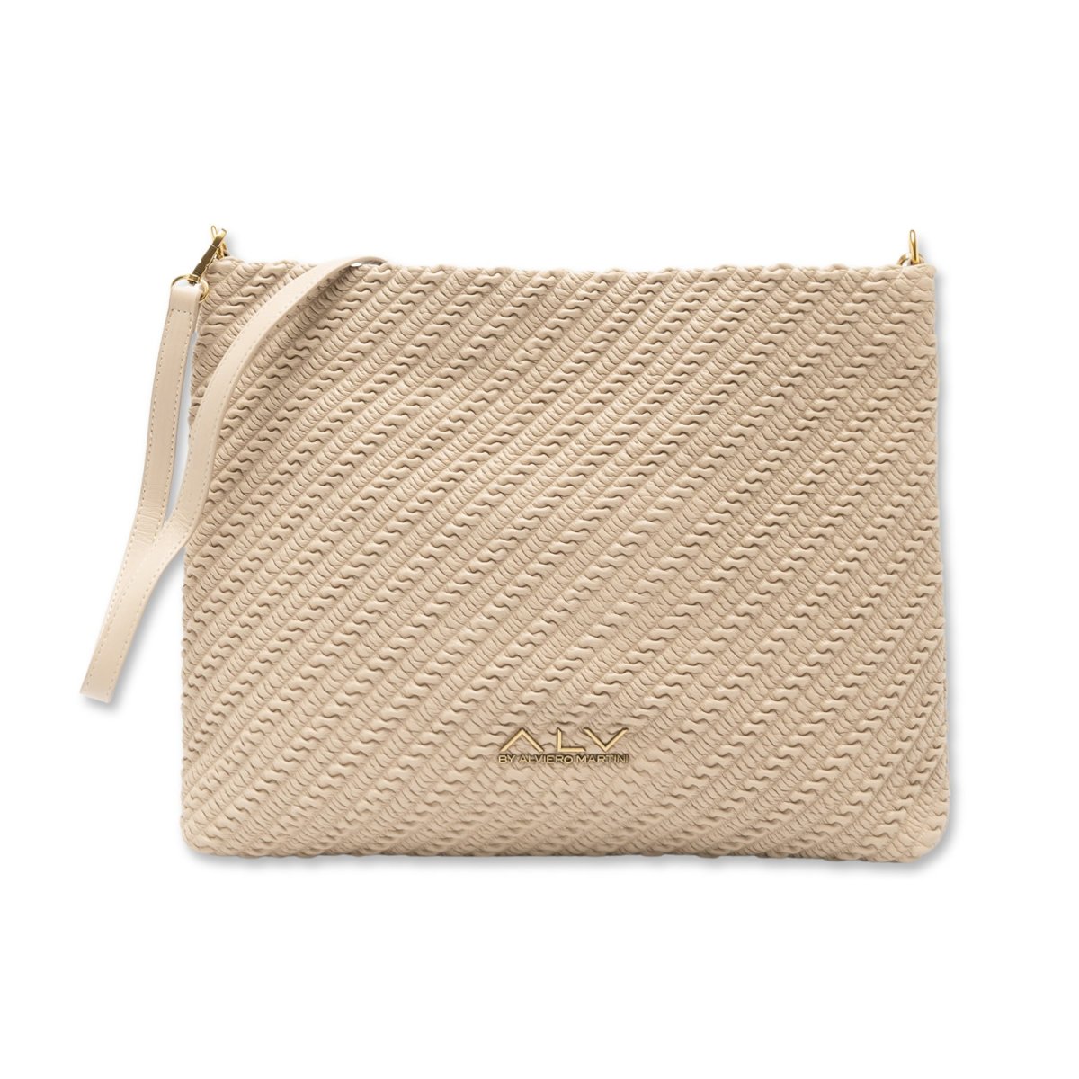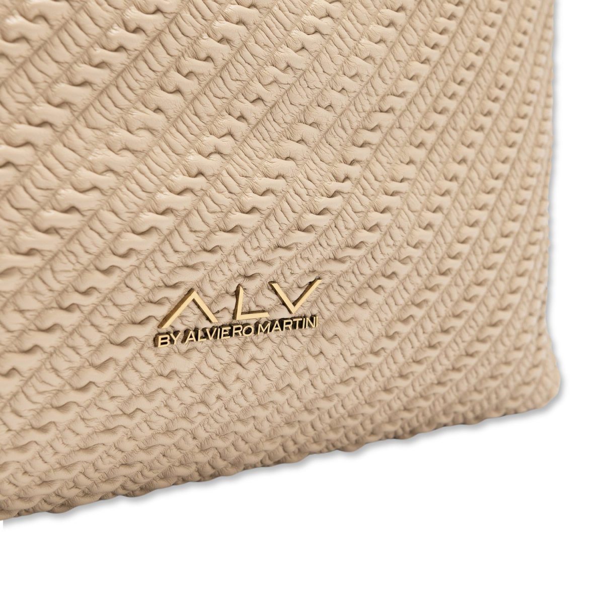 Realizzata con una raffinata lavorazione effetto intrecciato, è impreziosita dal logo ALV in metallo dorato sul fronte e da dettagli in catena dorata che aggiungono un tocco chic e sofisticato.