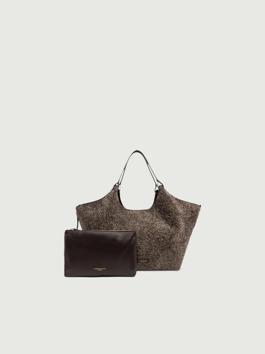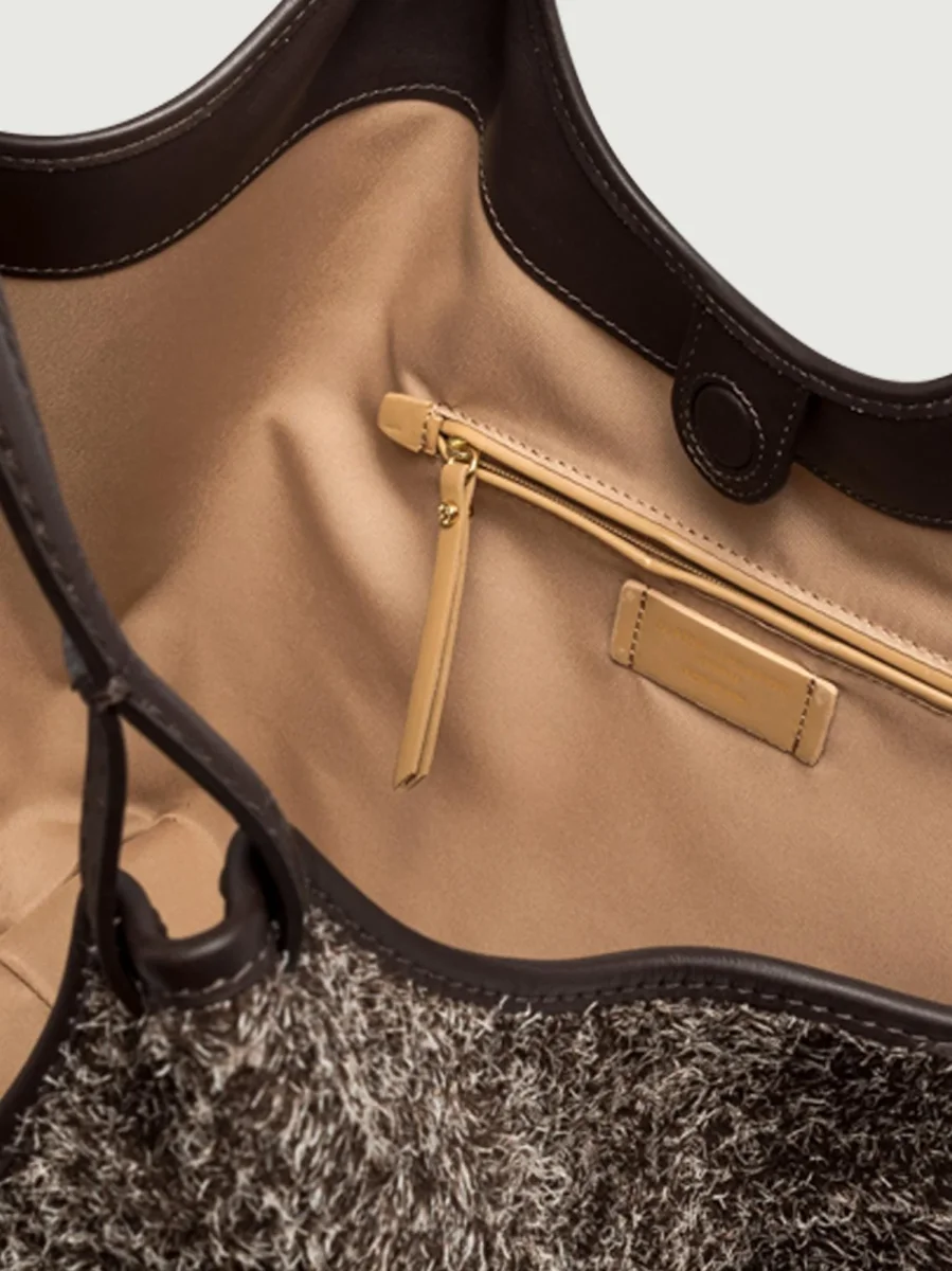 Tasca unica centrale, foderata in tessuto e con inserto pochette in pelle di vitello liscia in tonalità di colore.