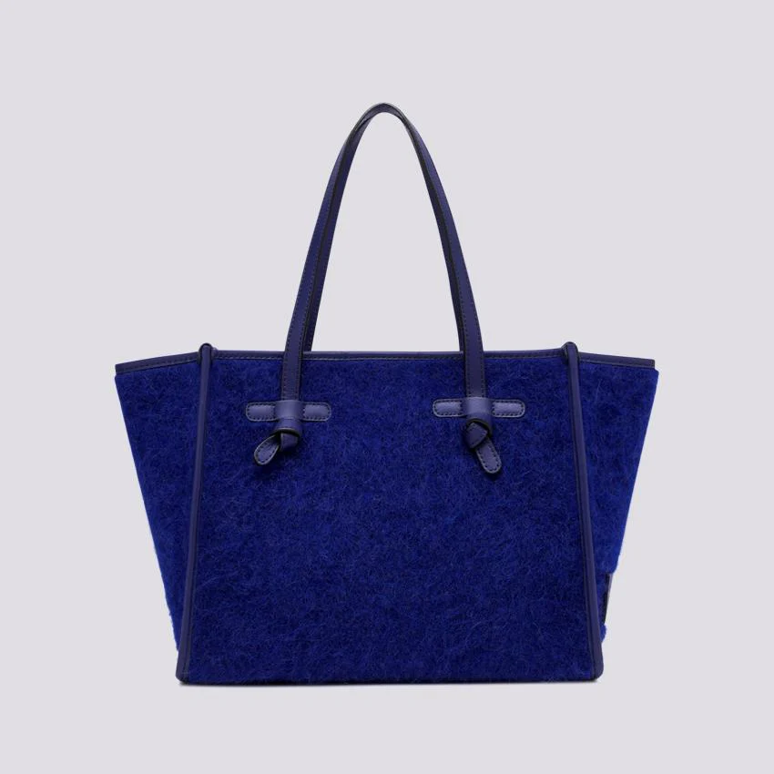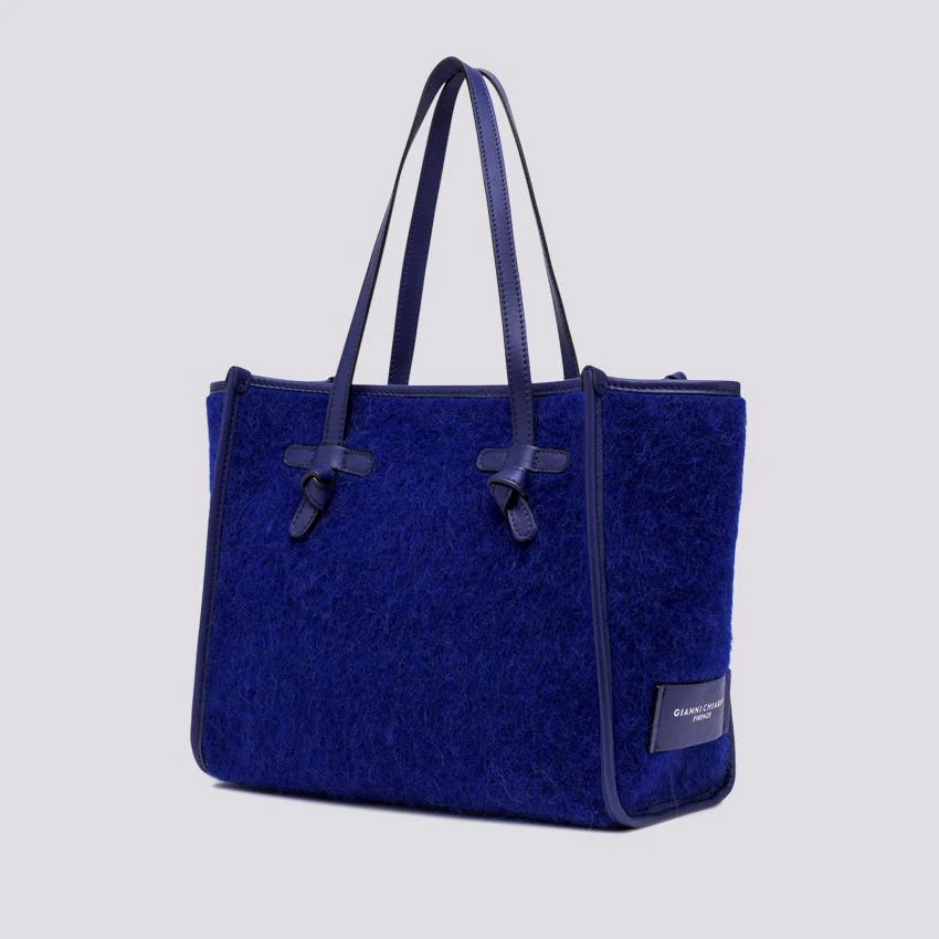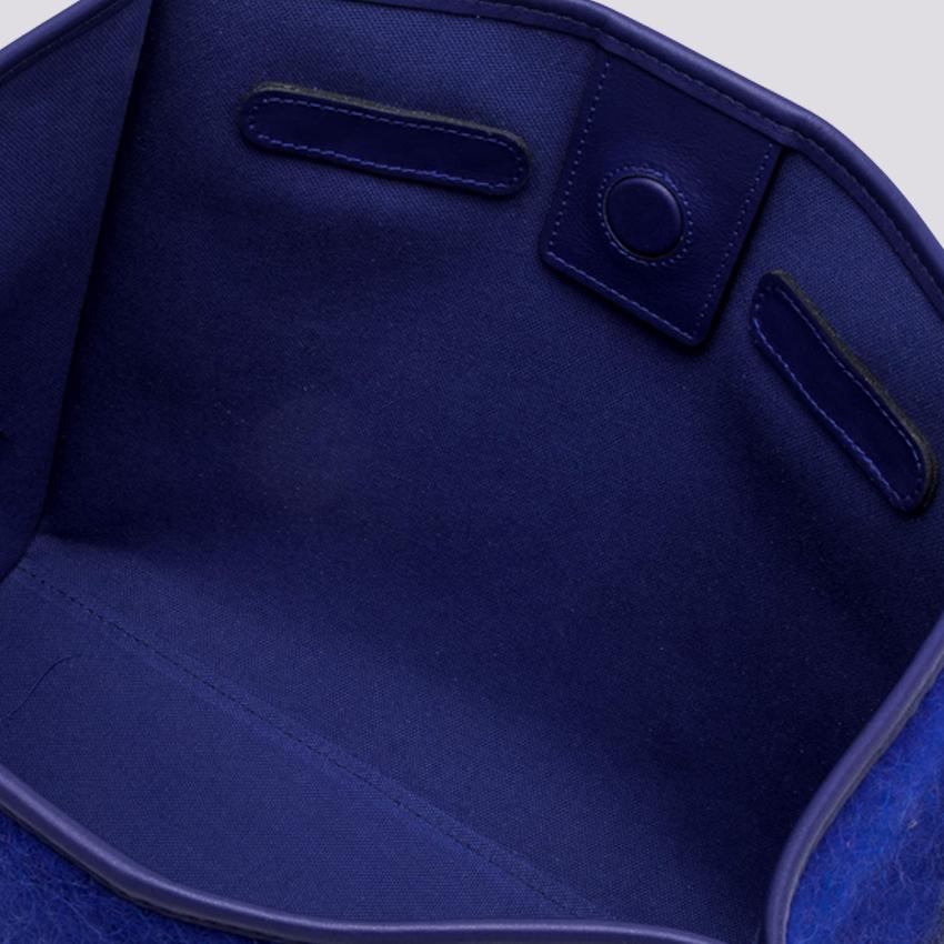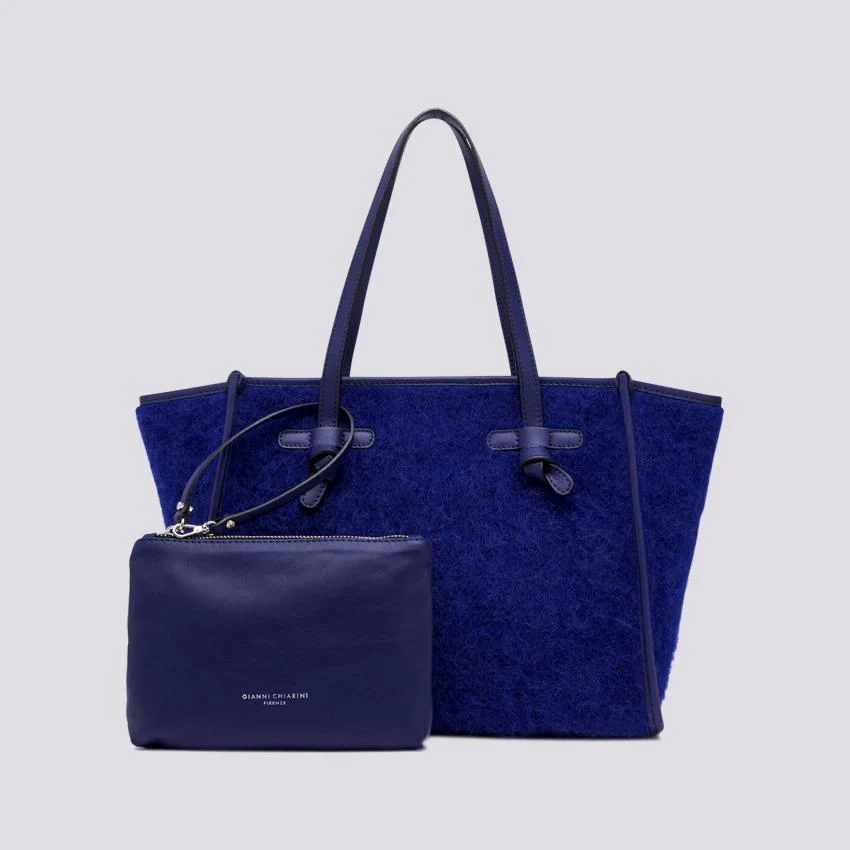 Borsa a spalla Marcella 32 manico lungo in tessuto Furry bluette effetto mohair. Profili e manici in pelle tono su tono. Chiusura con magnete, corredata di pouch in pelle con zip in testa rimovibile.